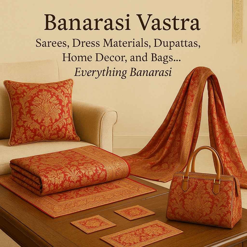 A celebration of timeless elegance and traditional artistry. We specialize in handcrafted treasures made exclusively from Banarasi Woven Zari Brocade Textiles, known for their luxurious textures, intricate motifs, and regal appeal. Our curated collection includes Pure Silk and Art Silk Sarees, Salwar Kameez Dupatta sets, and elegant Banarasi Dupattas. For your home, explore our exquisite range of Cushion Covers, Table Covers, Table Runners, Bolster Covers, and Diwan Sets, each crafted to infuse your living space with royal charm. We also offer handbags and clutches that blend rich heritage with contemporary style. At Banarasi Vastra, every piece is a reflection of India’s rich weaving legacy—designed to bring beauty, culture, and sophistication into your wardrobe and home.