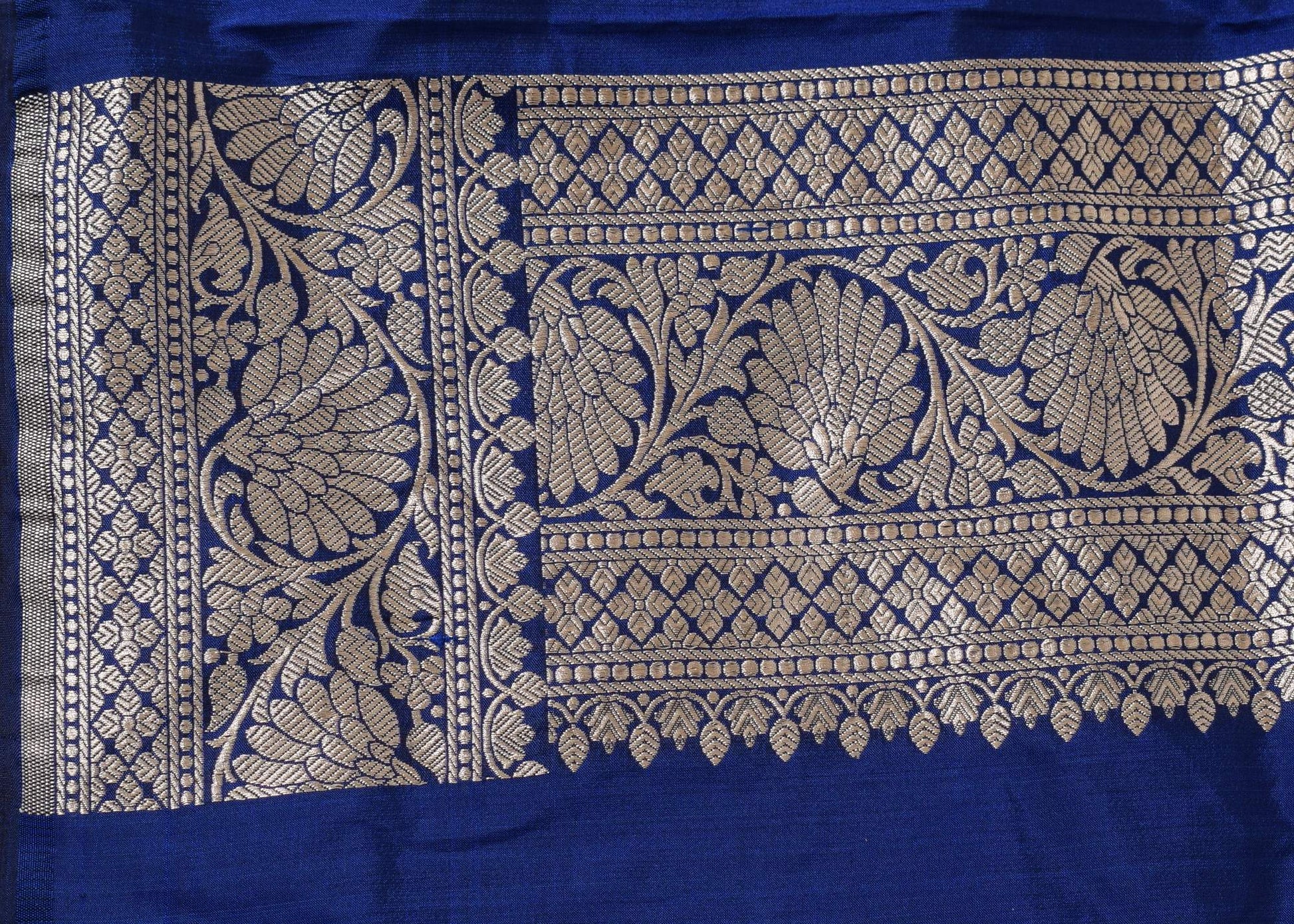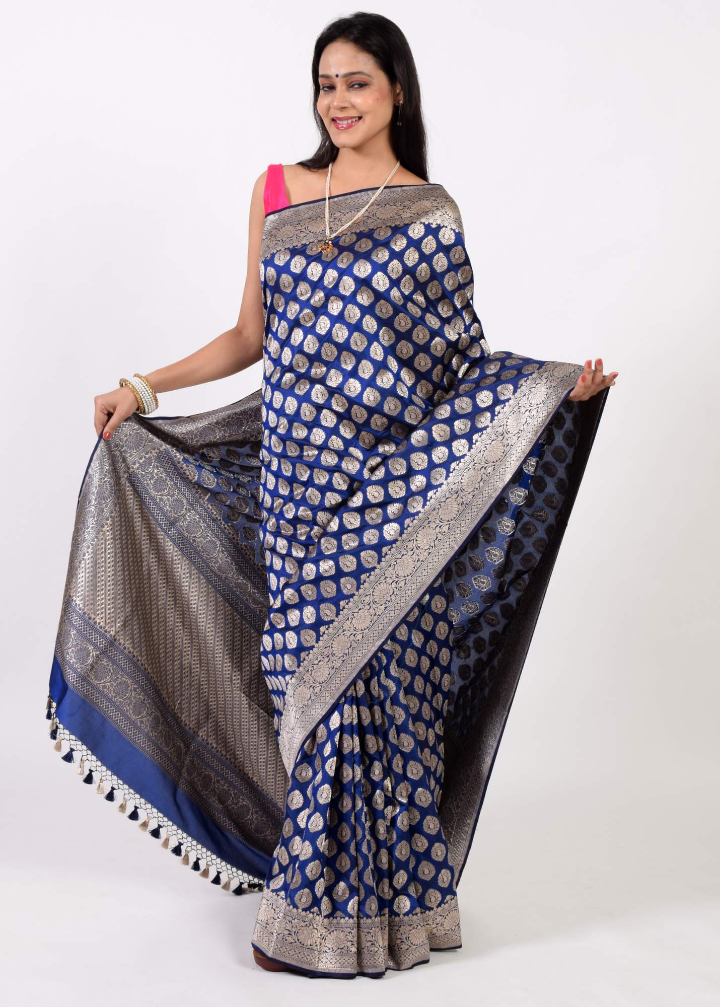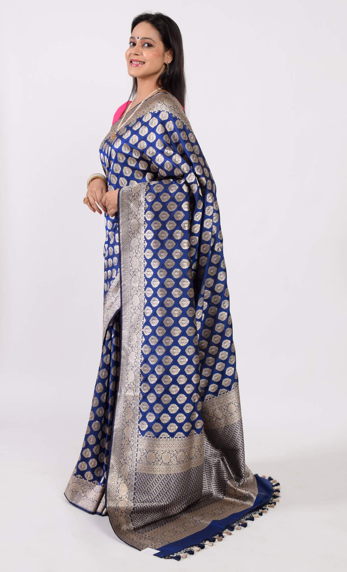 Banarasi Vastra Presents 100% Pure Katan Silk Banarasi Handloom Saree in Dark Blue Color with Zari Woven Floral Pasiley Motifs.