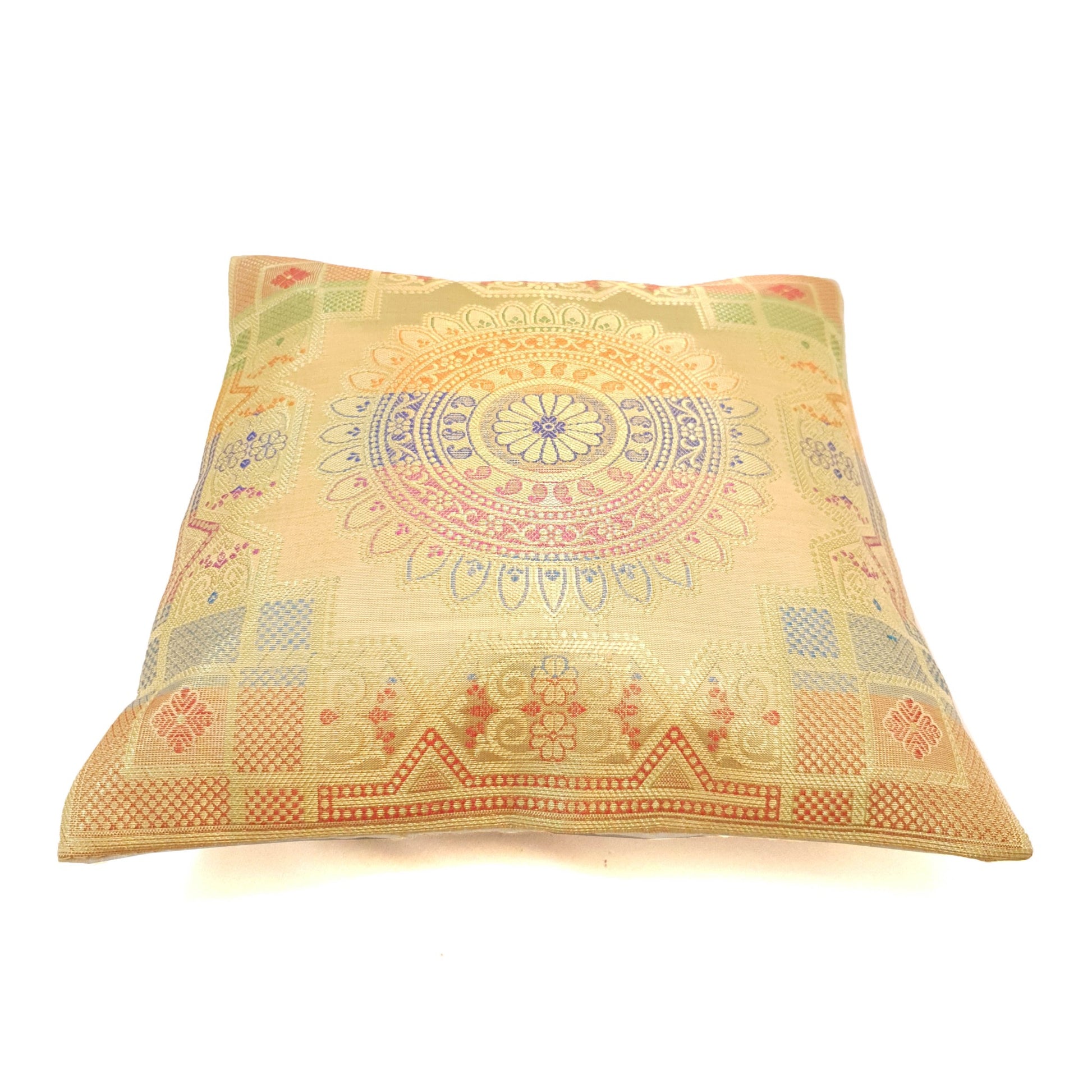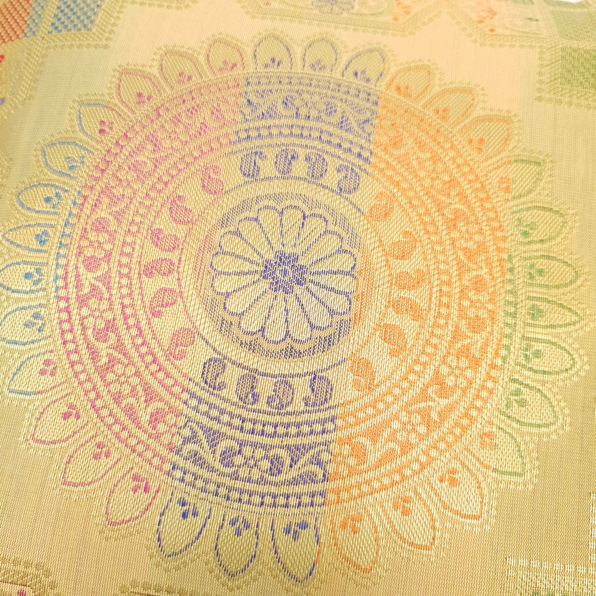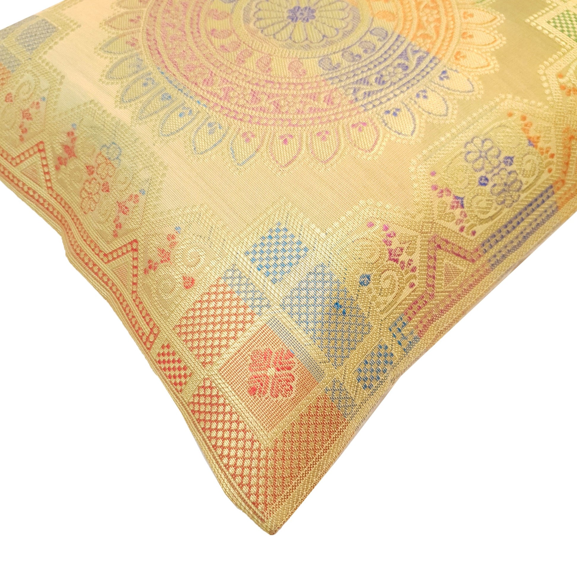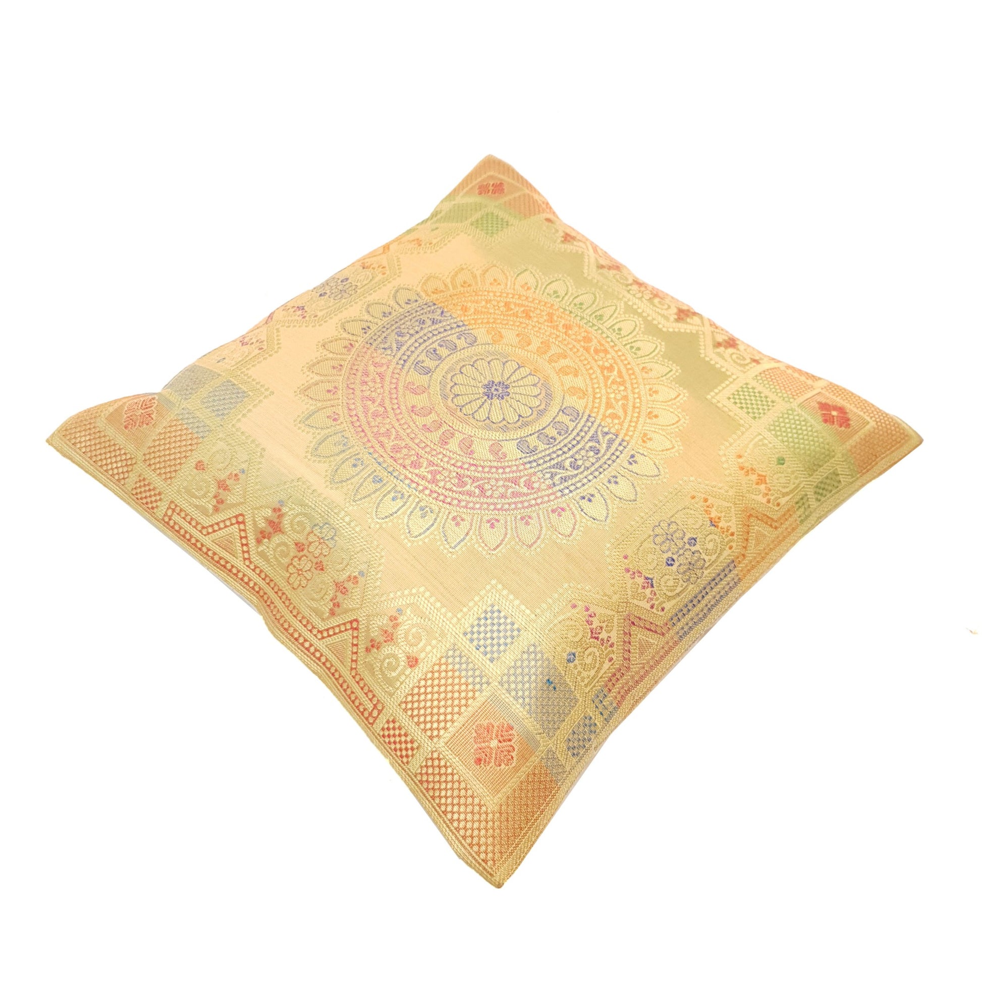 Banarasi Vastra Presents Indian Art Silk Woven Zari Brocade Banarasi Cushion Pillow Cover in Mandala Pattern in the center Part of the cover with all 4 Side Floral Zari Woven Border. this Cover comes with Matching color Back lining fabric with Hidden Zip which allow you to insert the Cushion Pillow. The base color of the cover is Beige