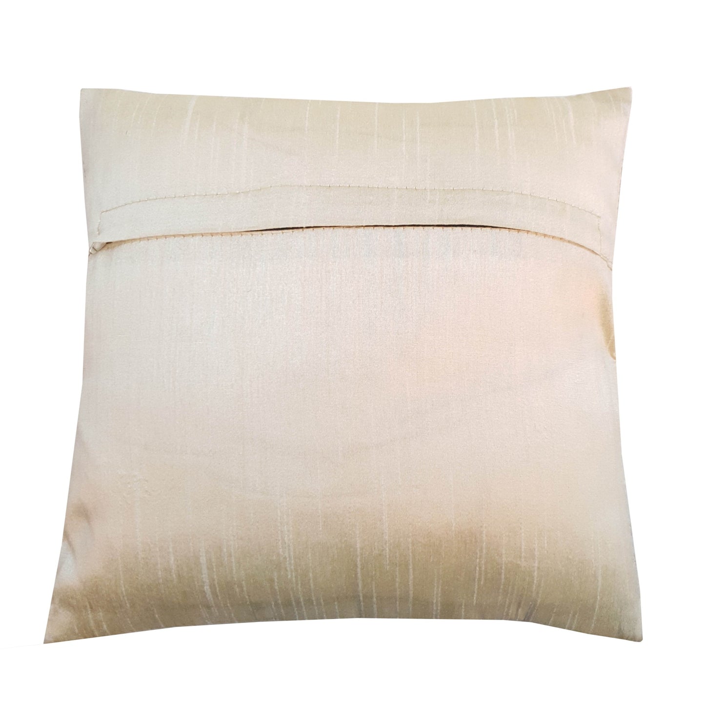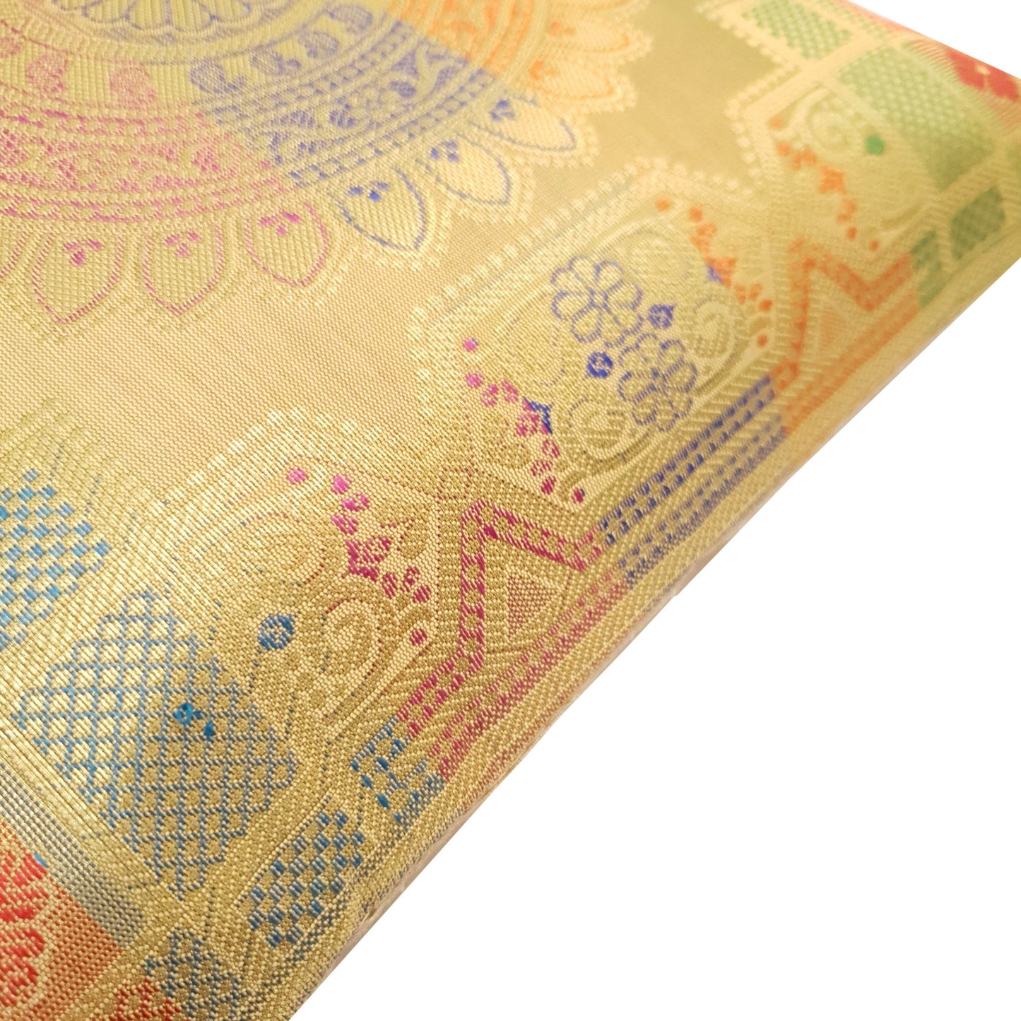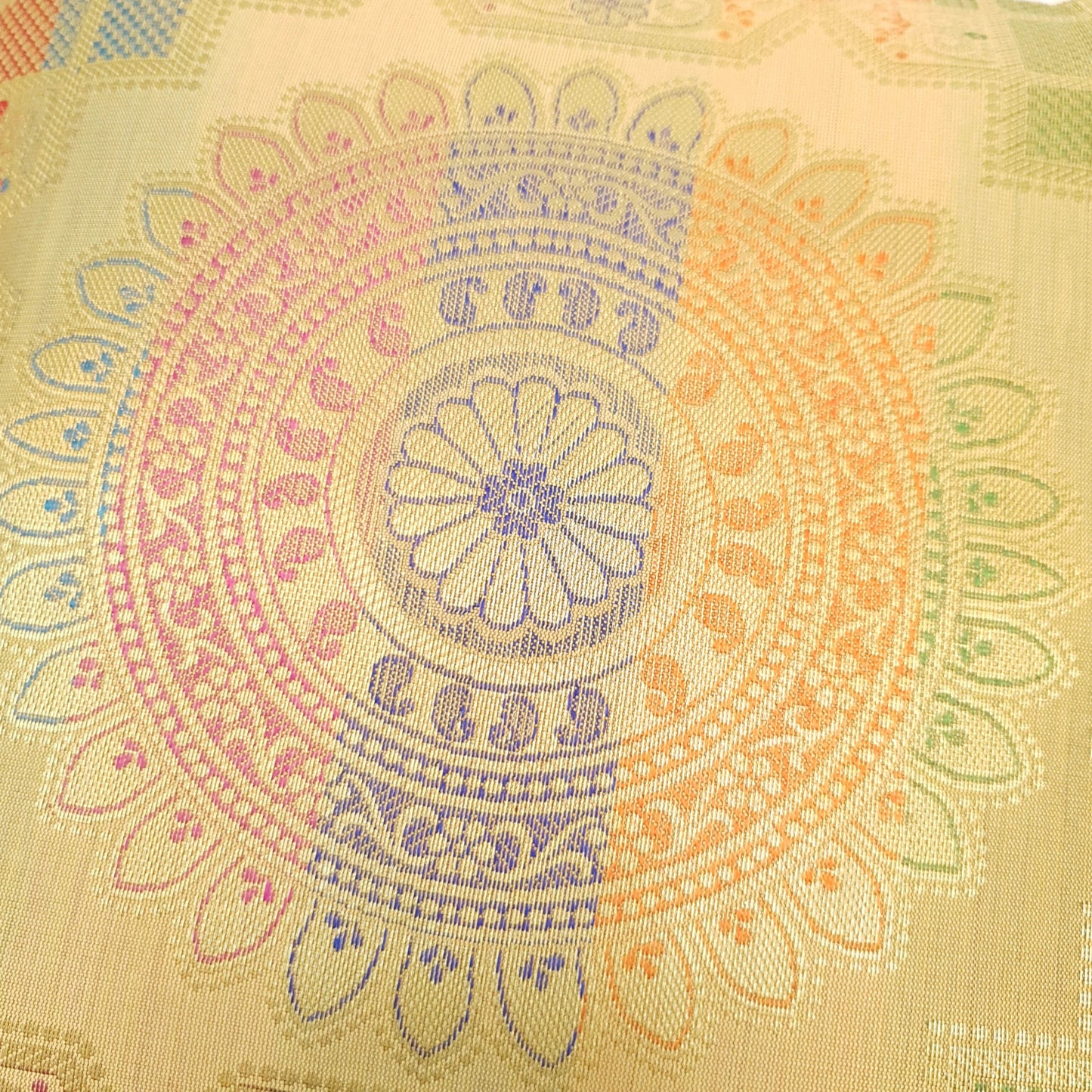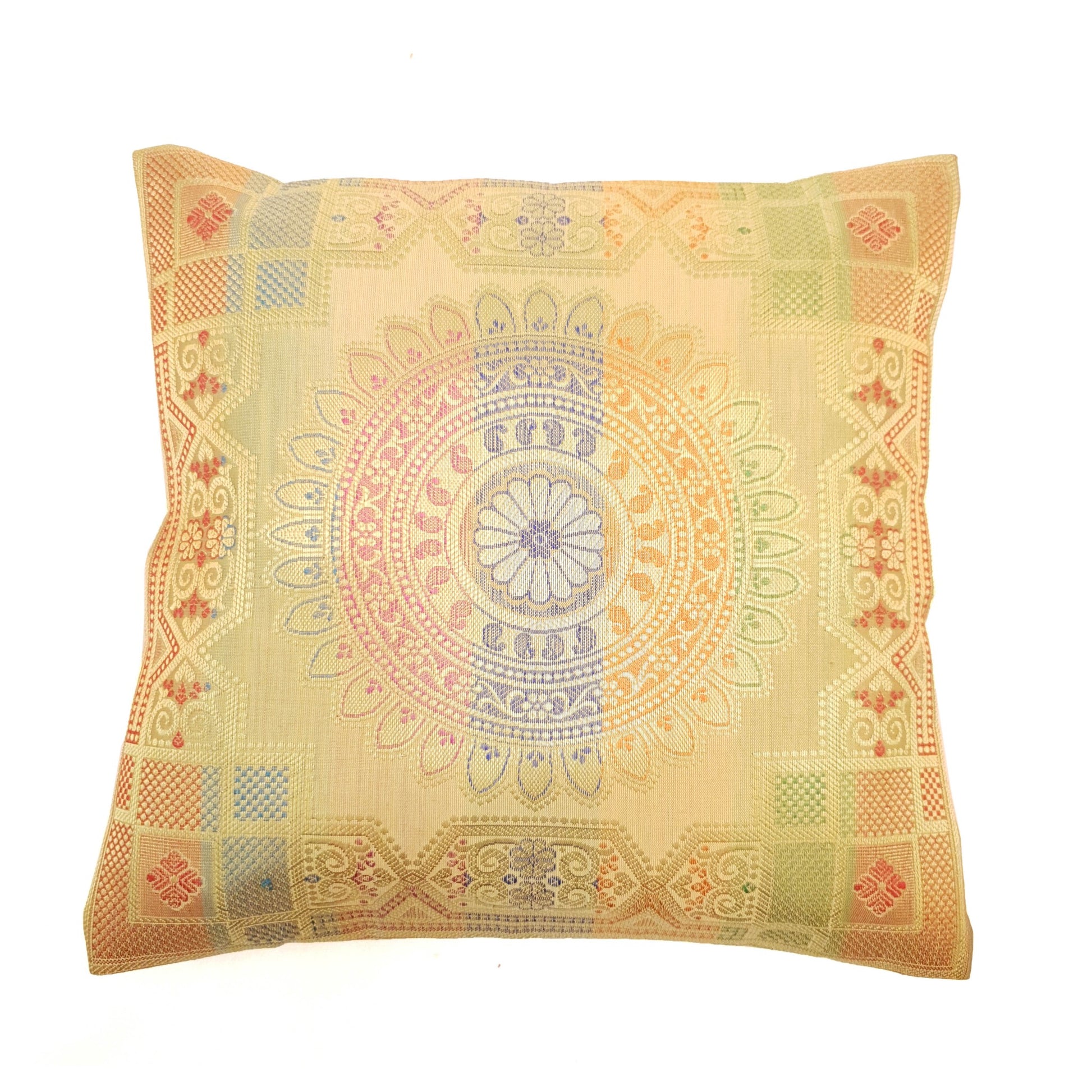 Banarasi Vastra Presents Indian Art Silk Woven Zari Brocade Banarasi Cushion Pillow Cover in Mandala Pattern in the center Part of the cover with all 4 Side Floral Zari Woven Border. this Cover comes with Matching color Back lining fabric with Hidden Zip which allow you to insert the Cushion Pillow. The base color of the cover is Beige