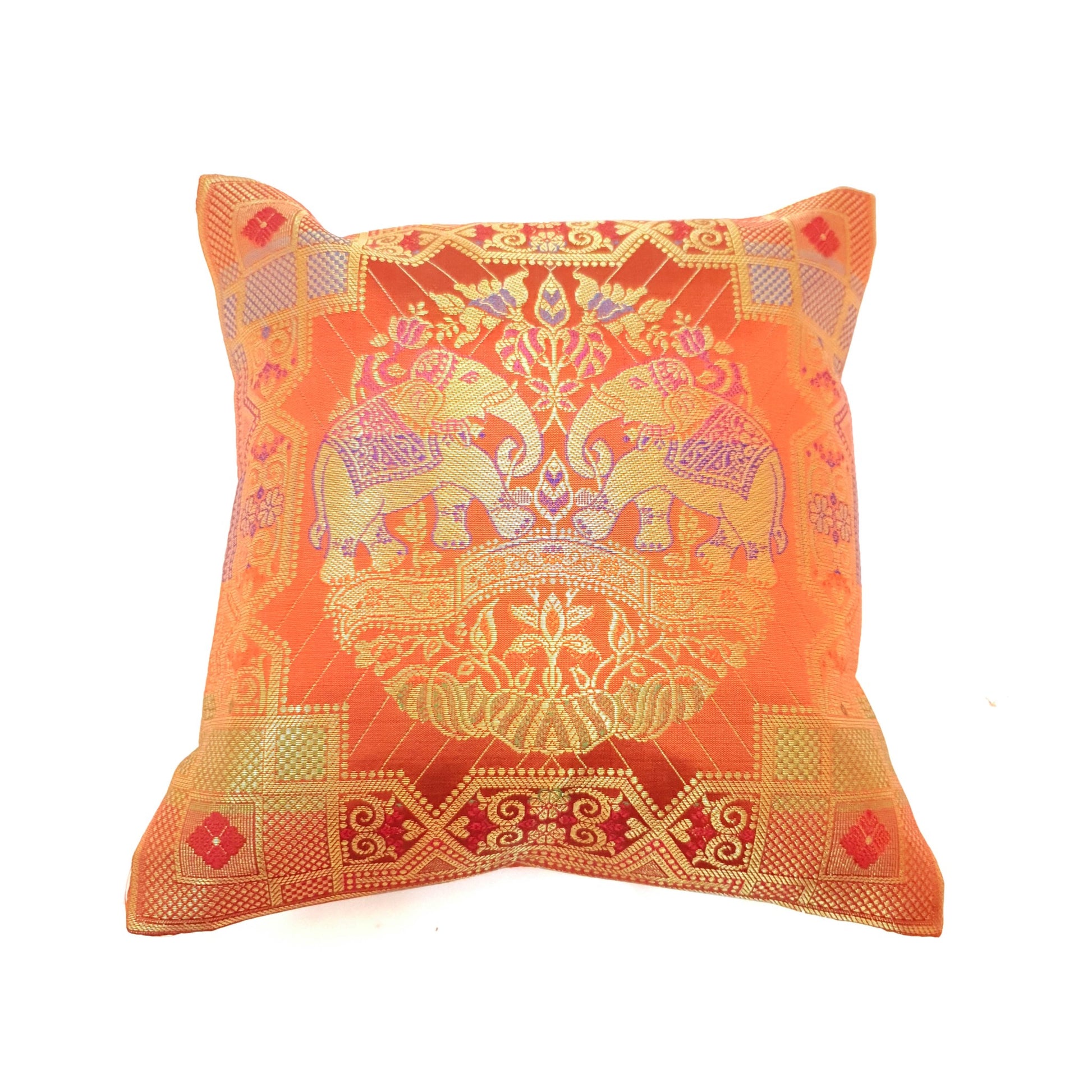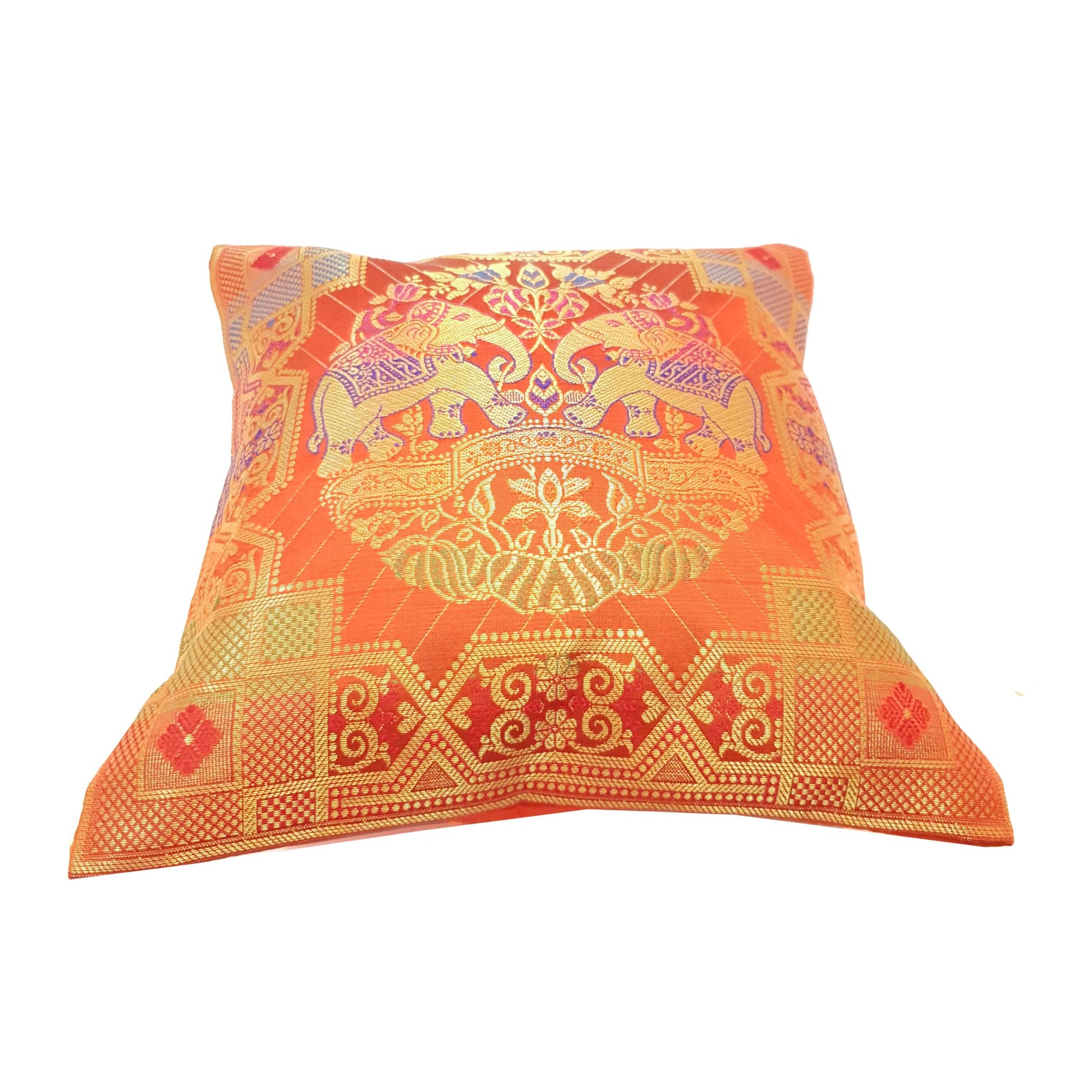 12x12 Inch Cushion Cover Banarasi Indian Orange Elephant Woven Zari Brocade Silk