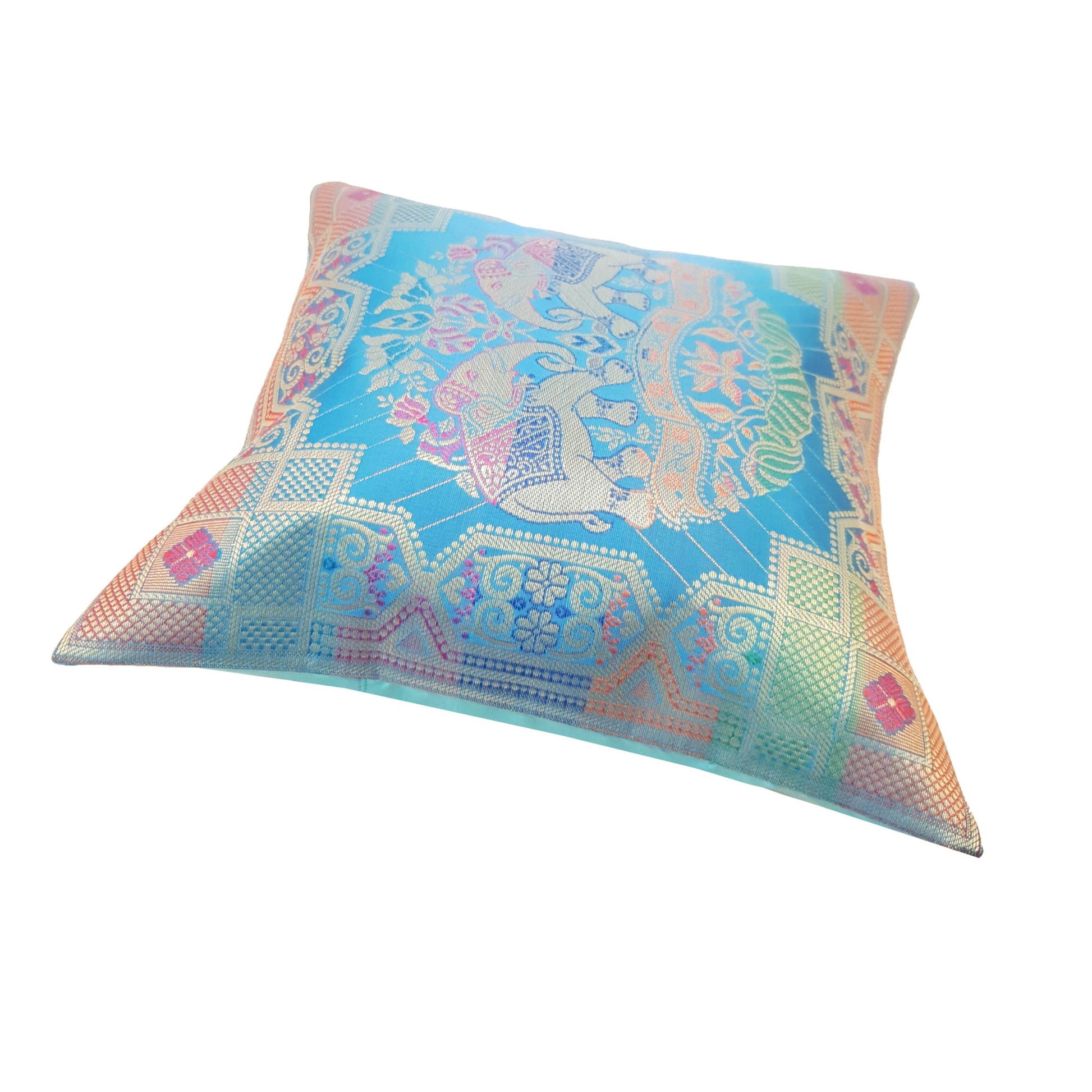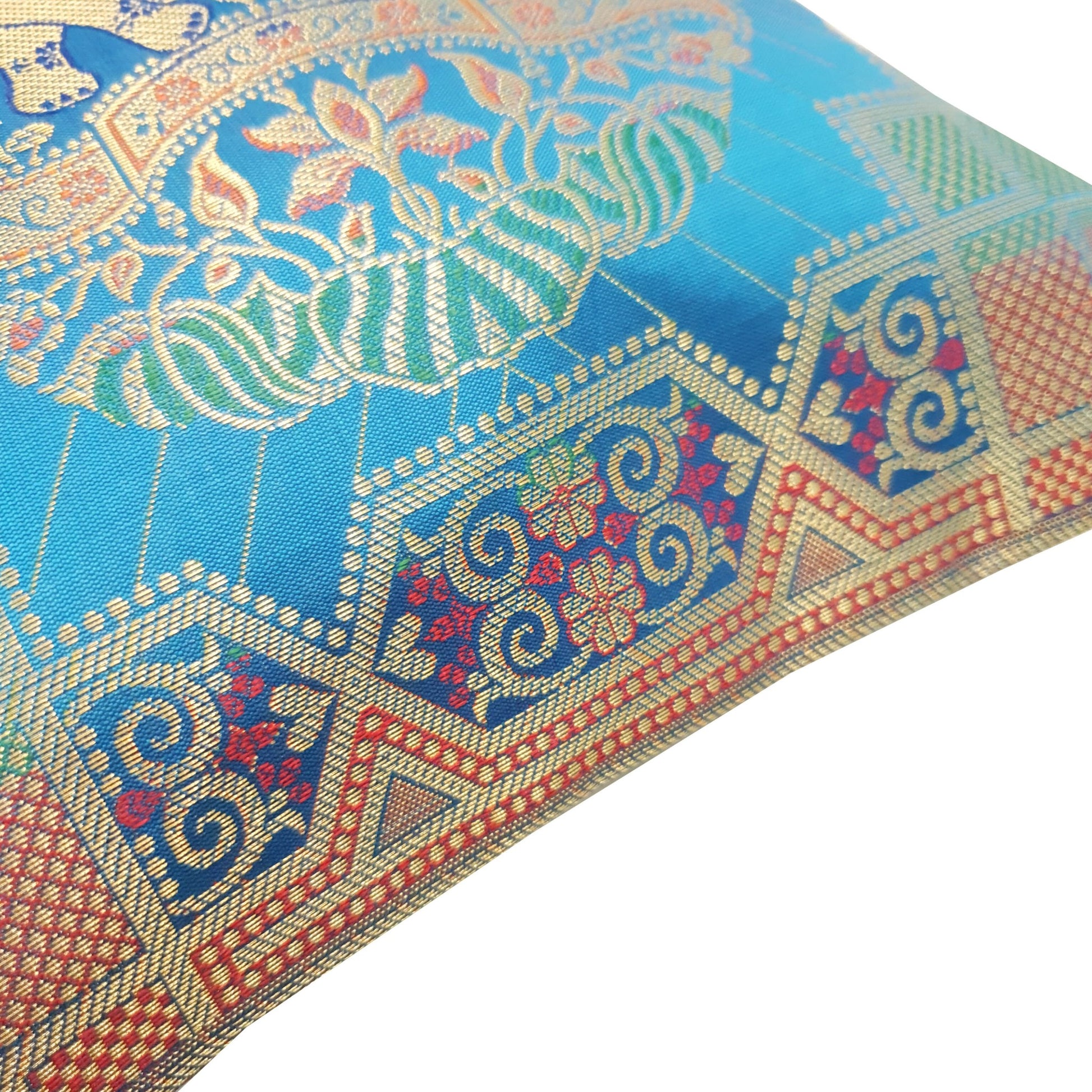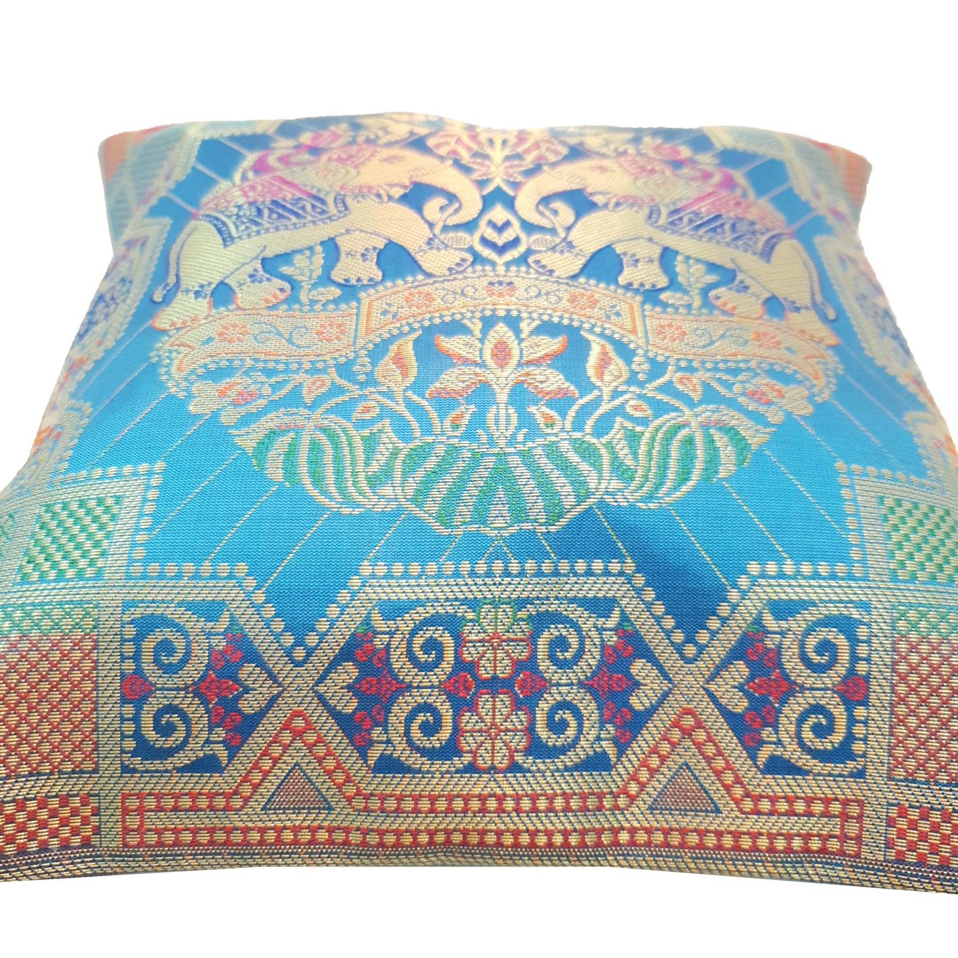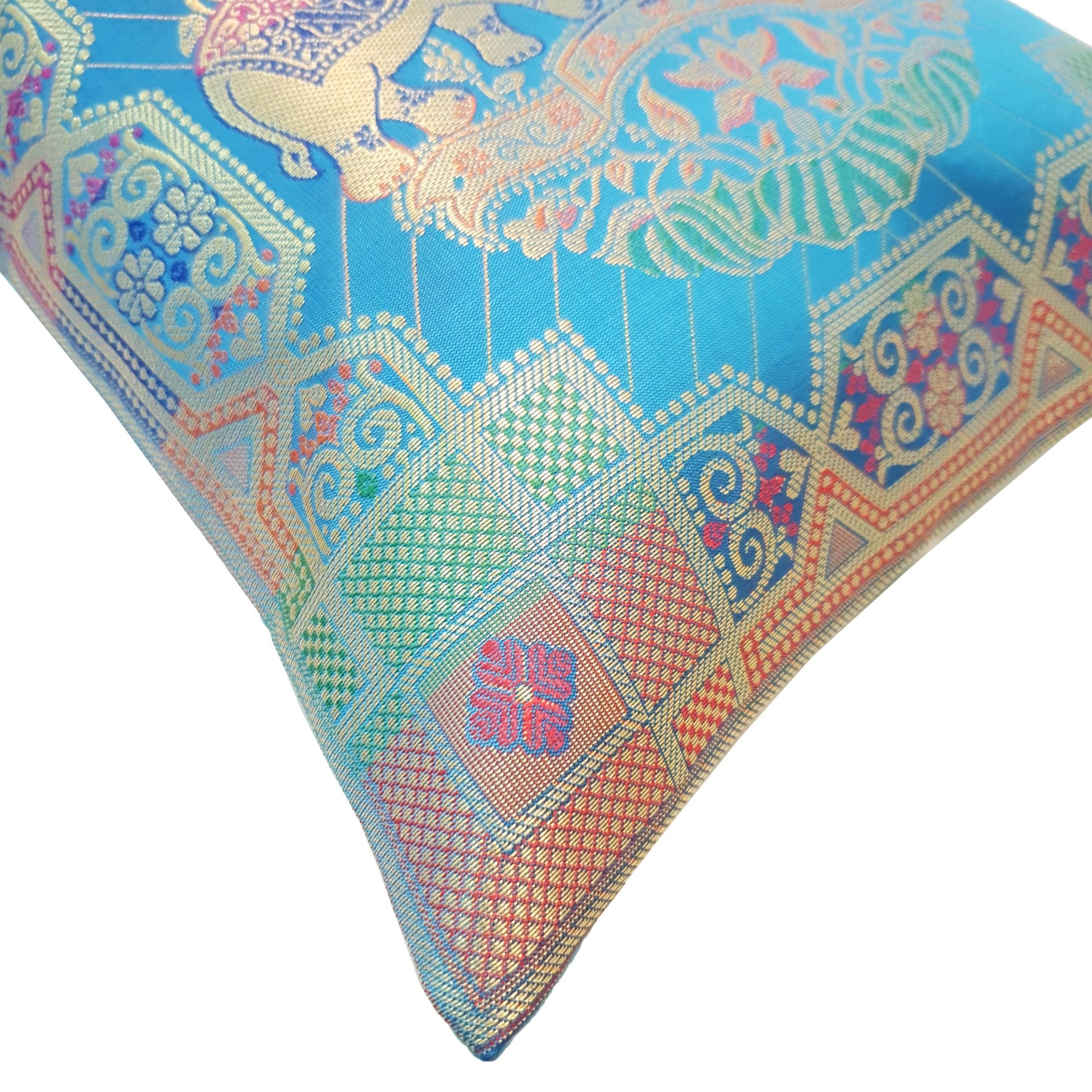12x12 Inch Cushion Cover Banarasi Turquoise Blue Elephant Woven Brocade Silk