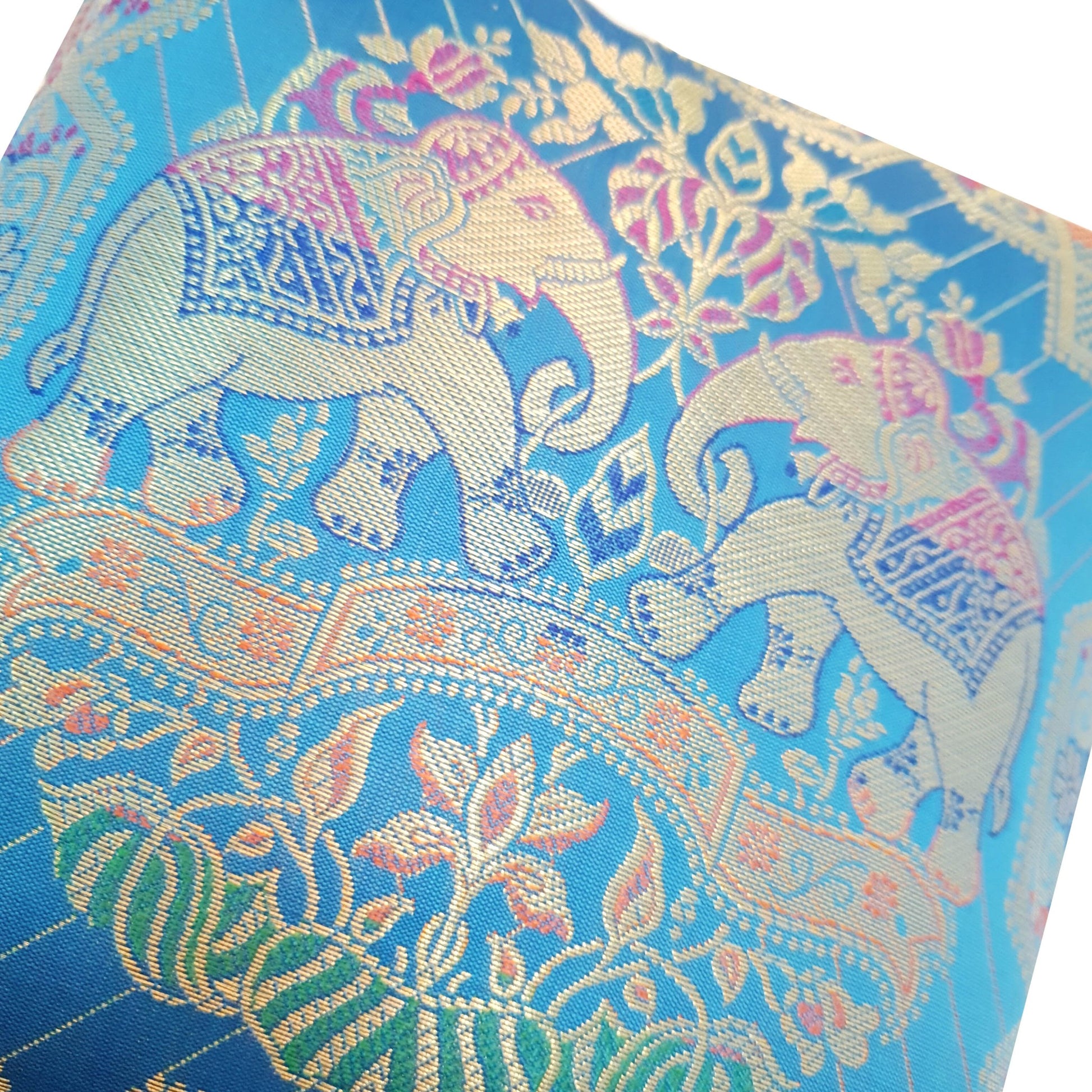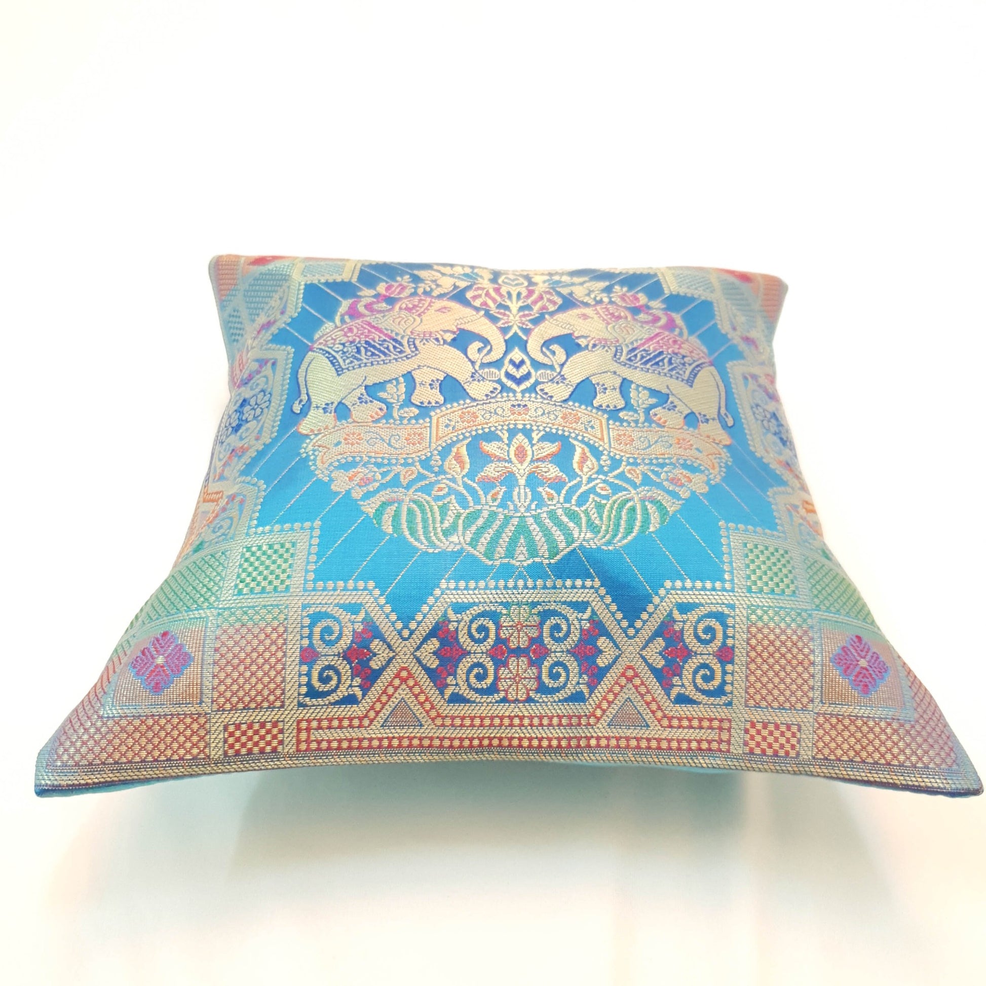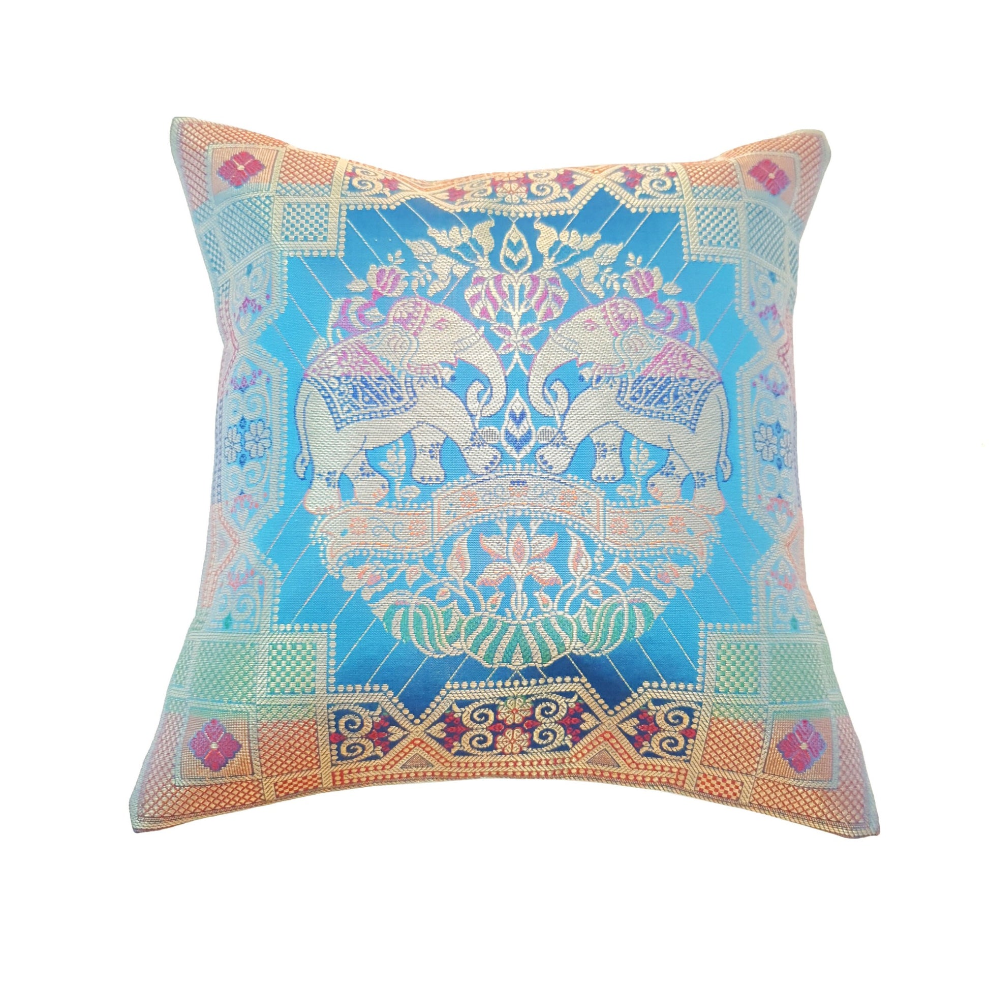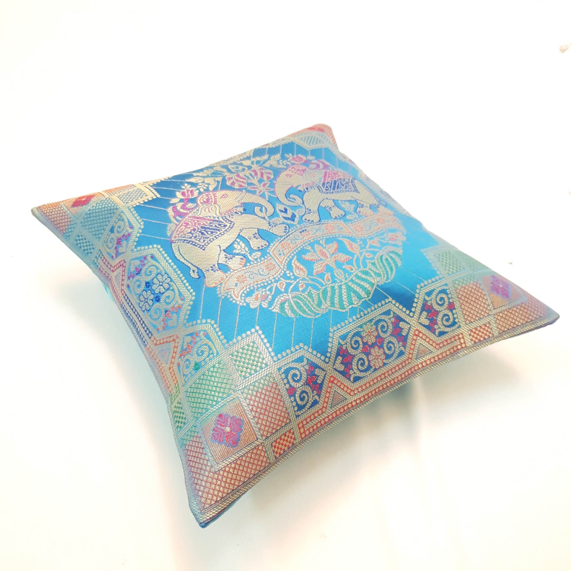12x12 Inch Cushion Cover Banarasi Turquoise Blue Elephant Woven Brocade Silk