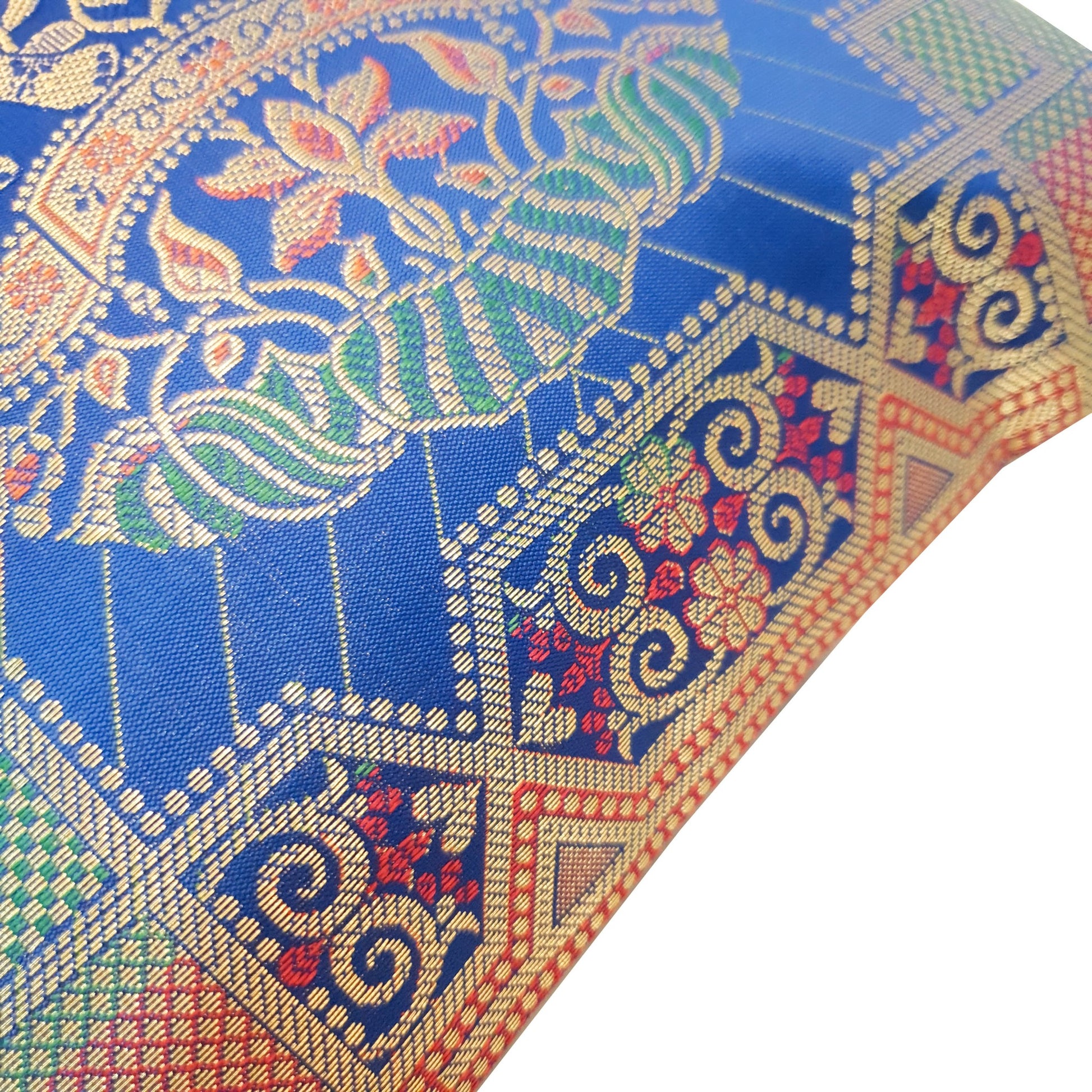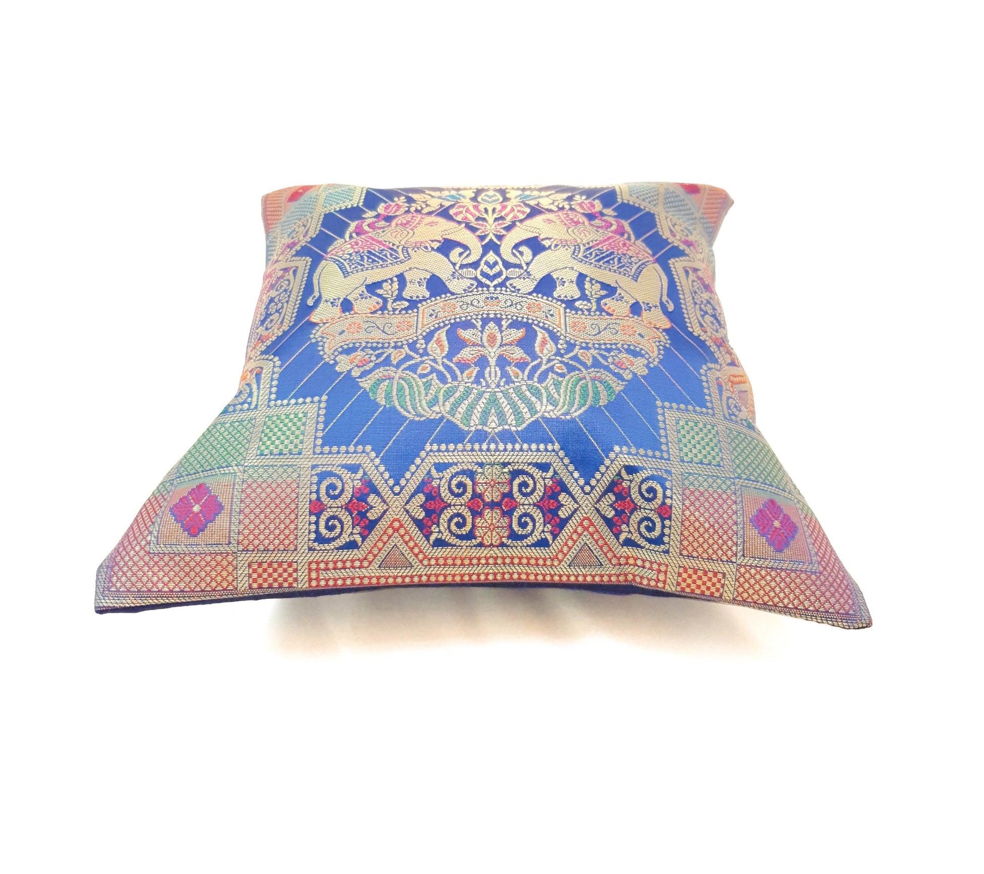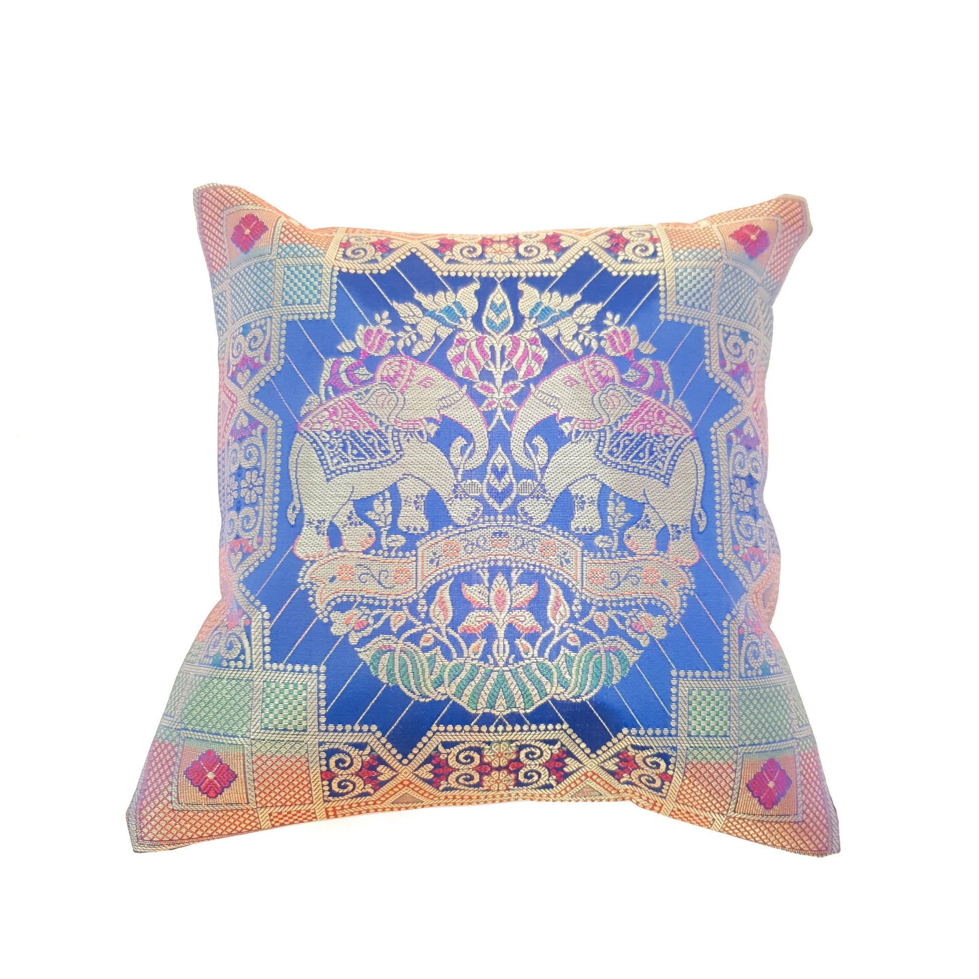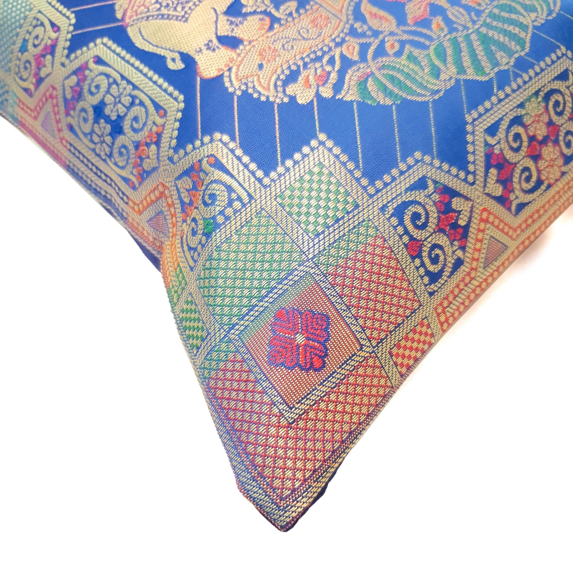12x12 Inch Cushion Cover Blue Banarasi Indian Elephant Woven Zari Brocade Silk