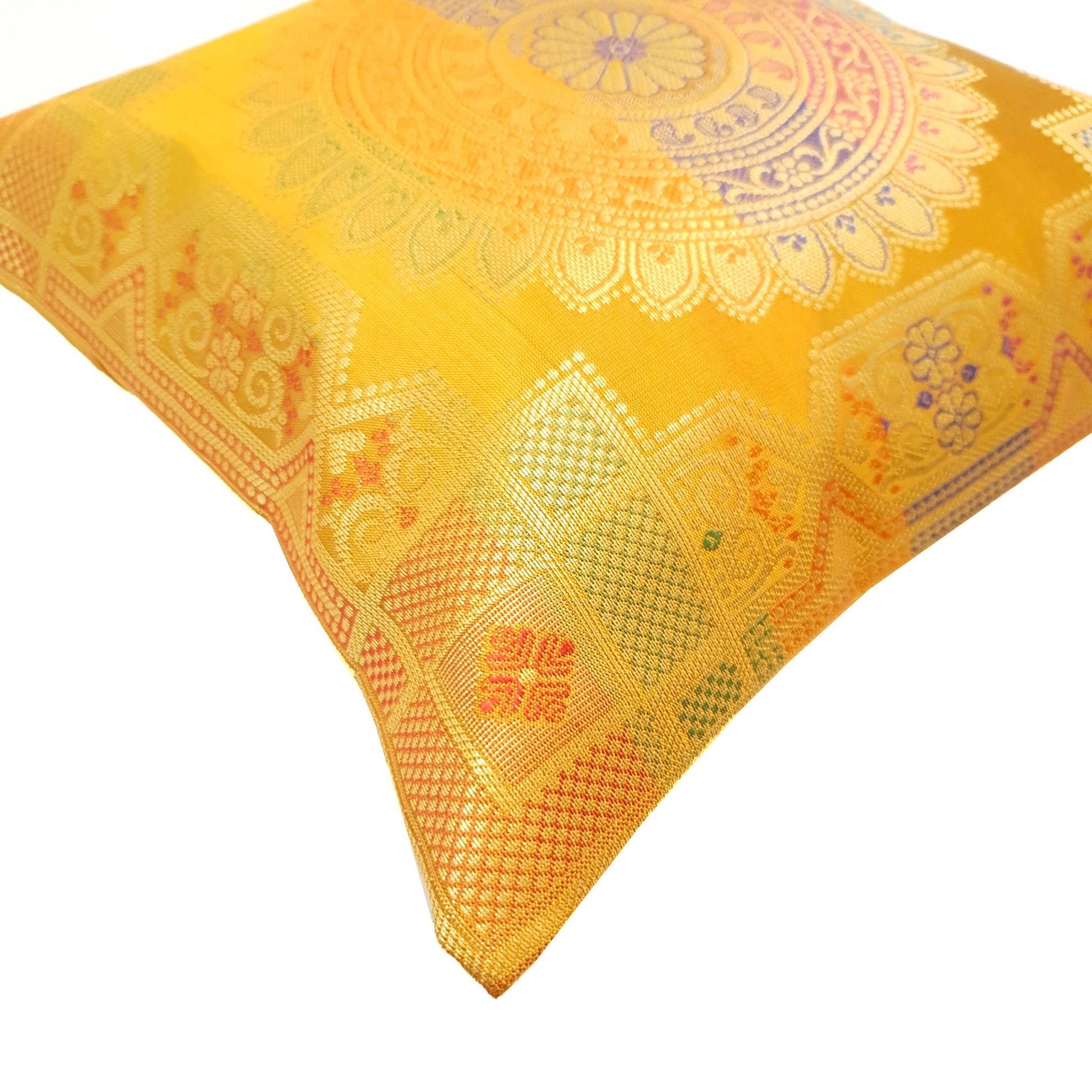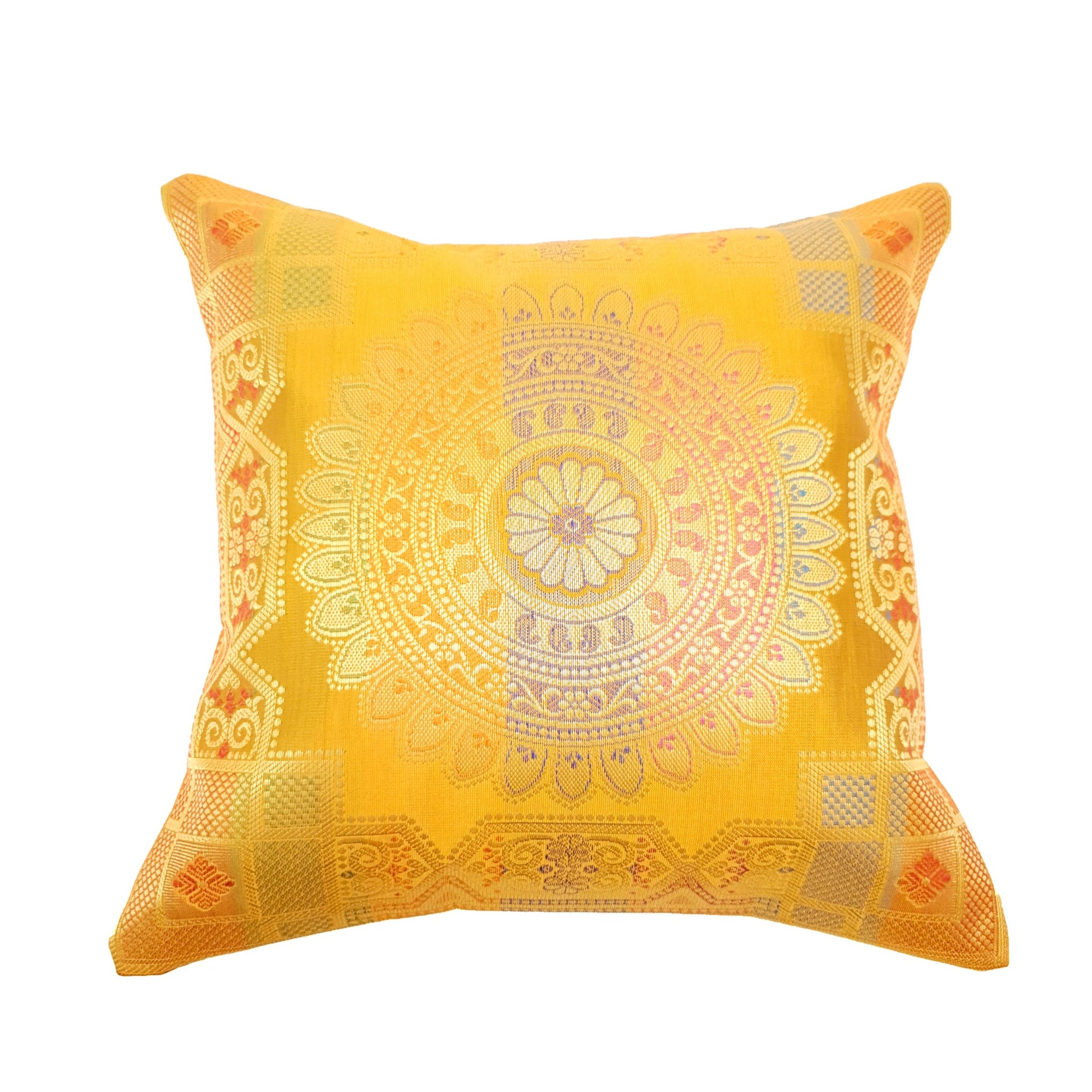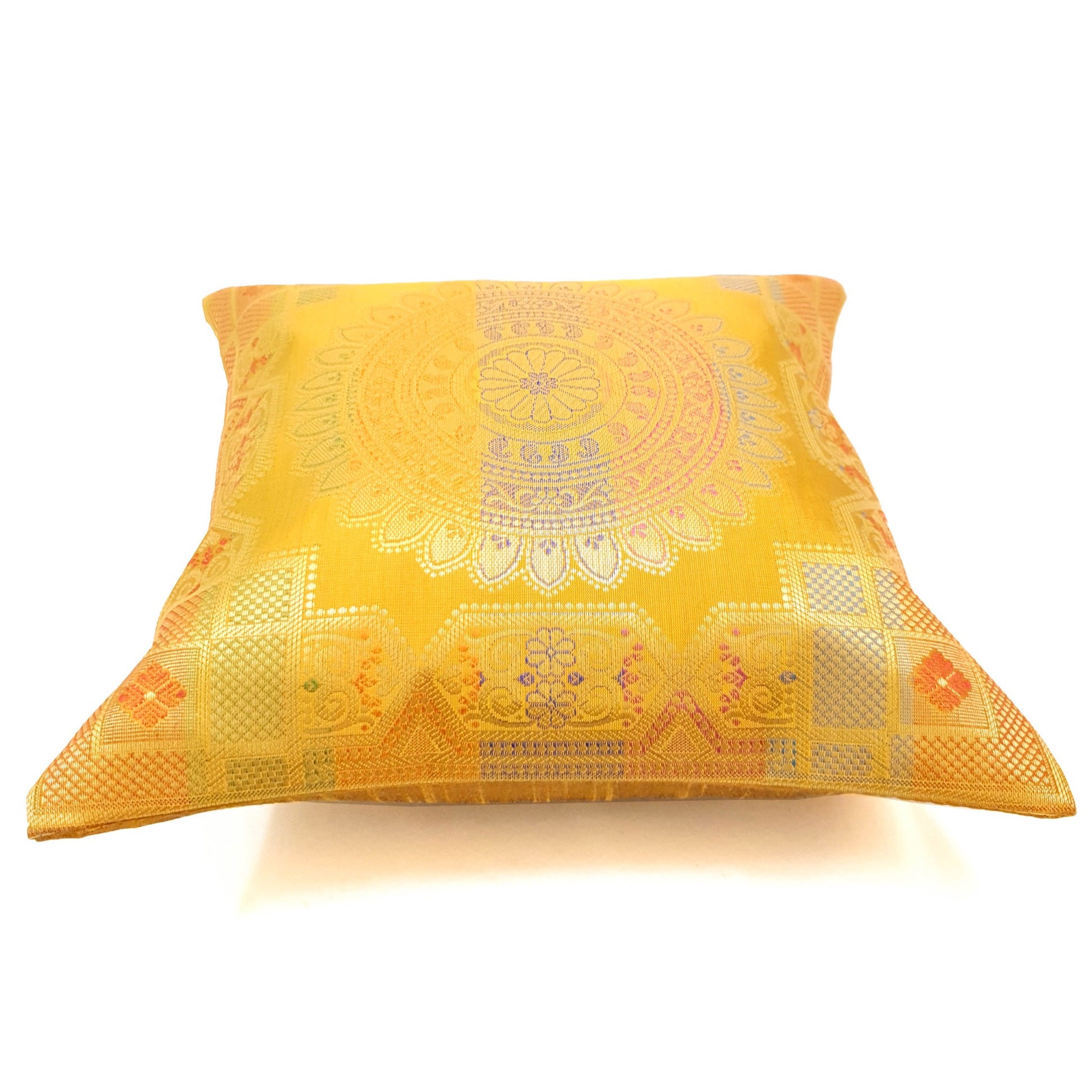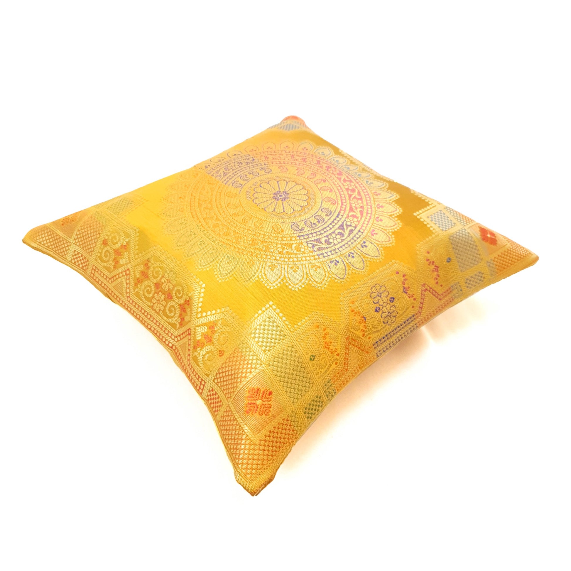 12x12 Inch Cushion Cover Mustard Banarasi Mandala Woven Zari Brocade Silk