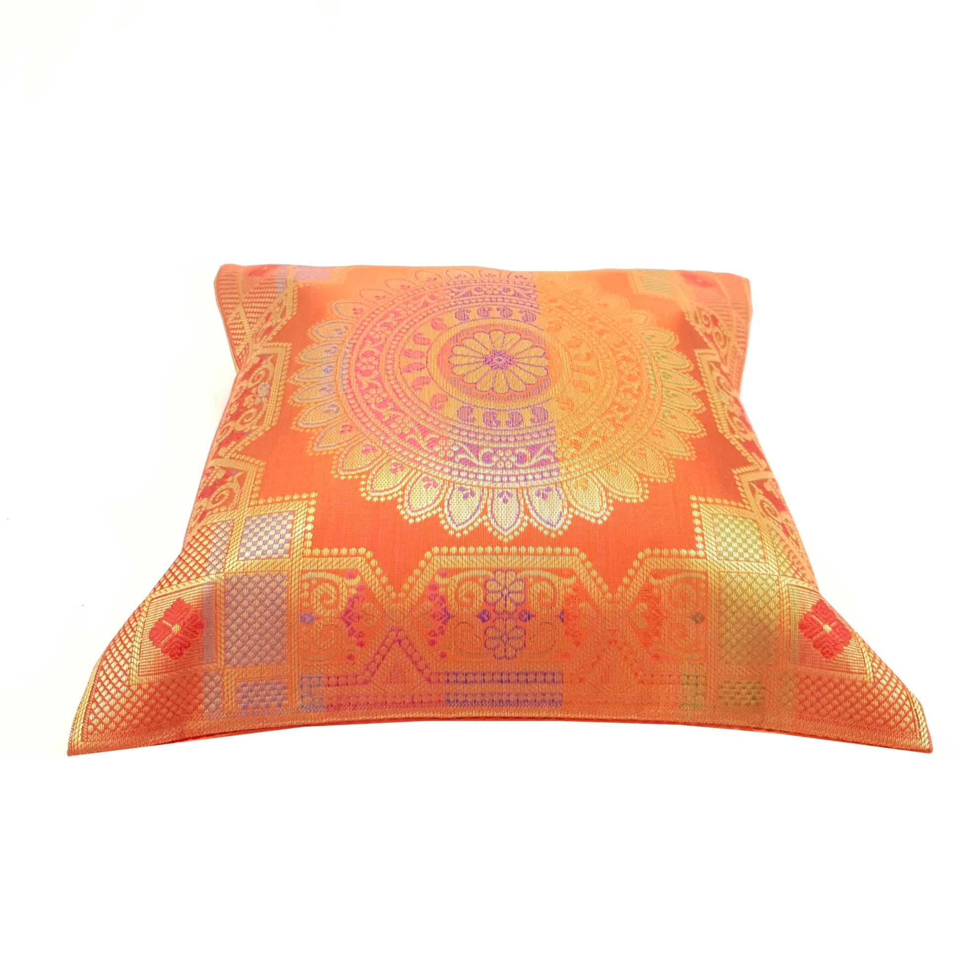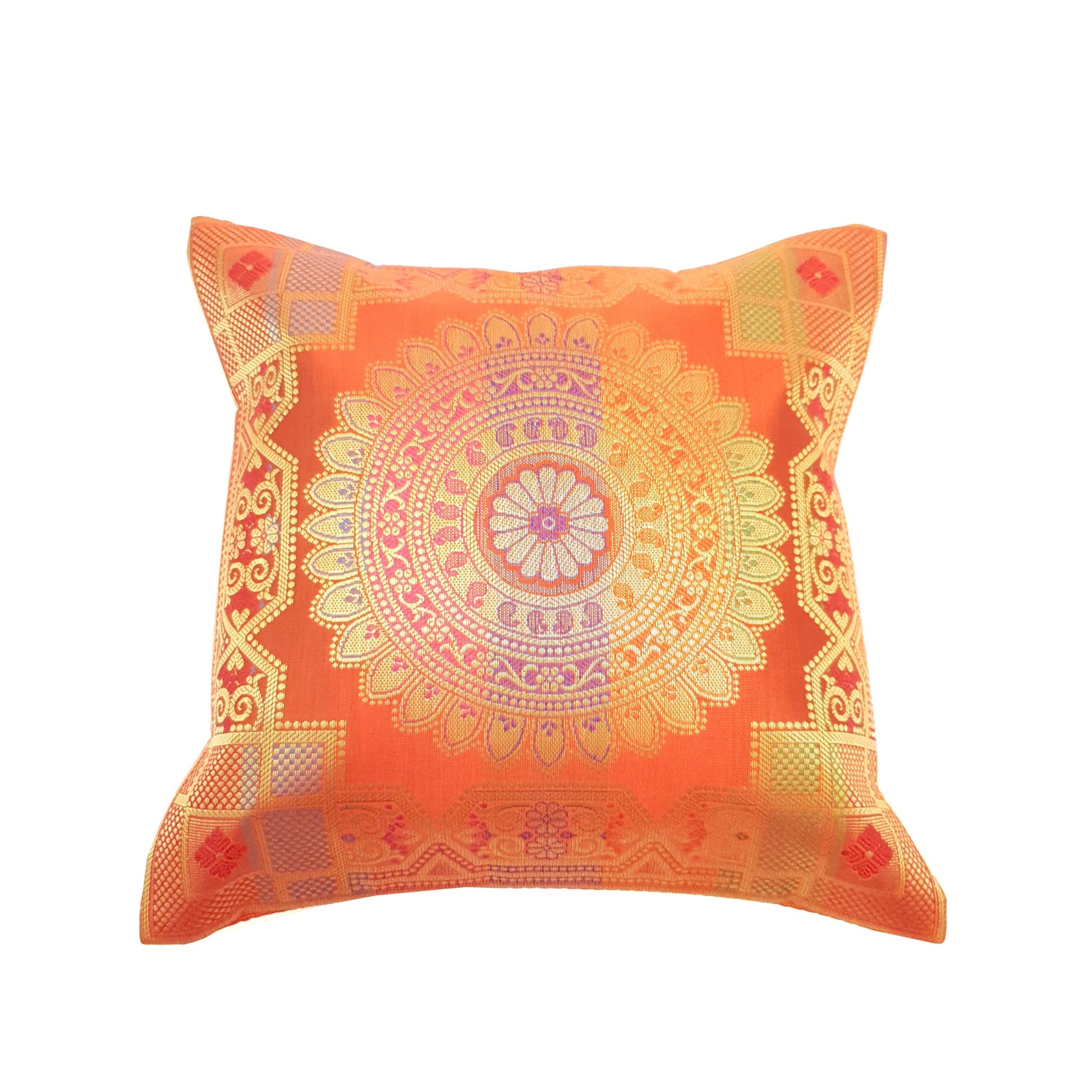 12x12 Inch Cushion Cover Orange Banarasi Mandala Woven Zari Brocade Silk