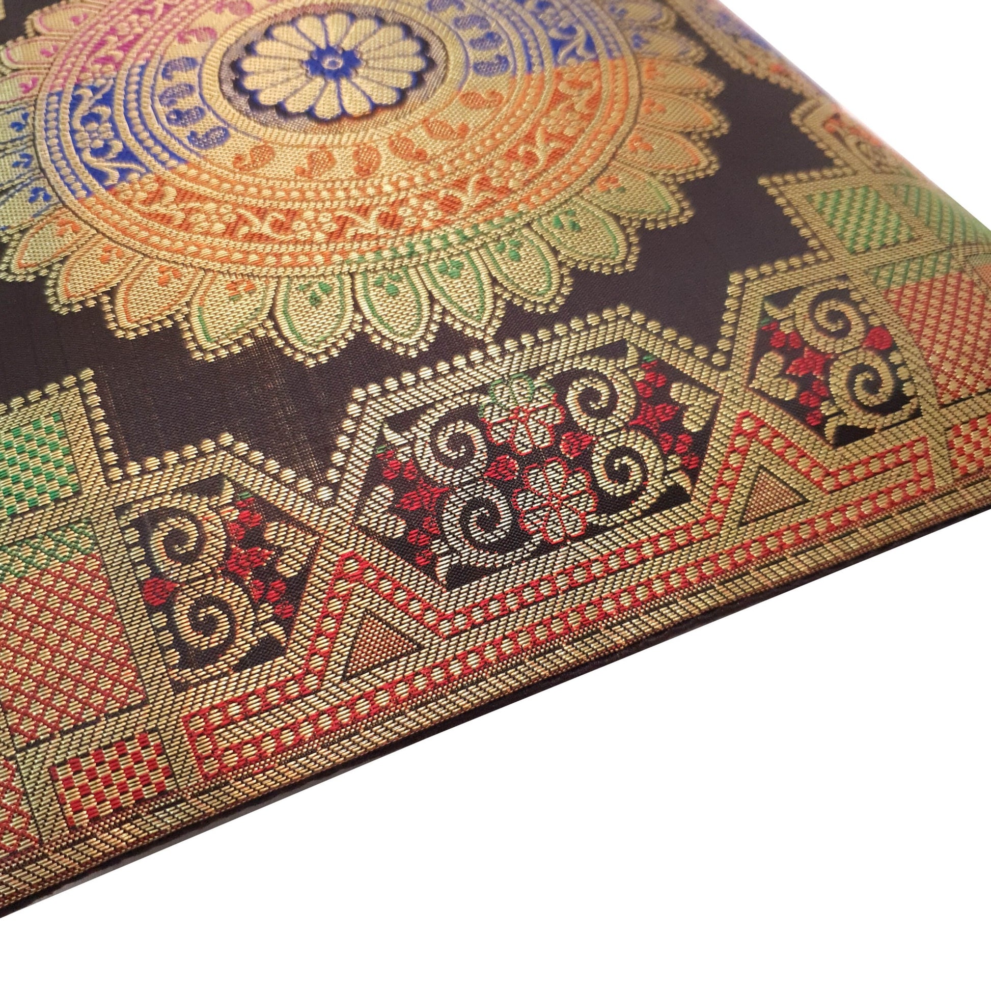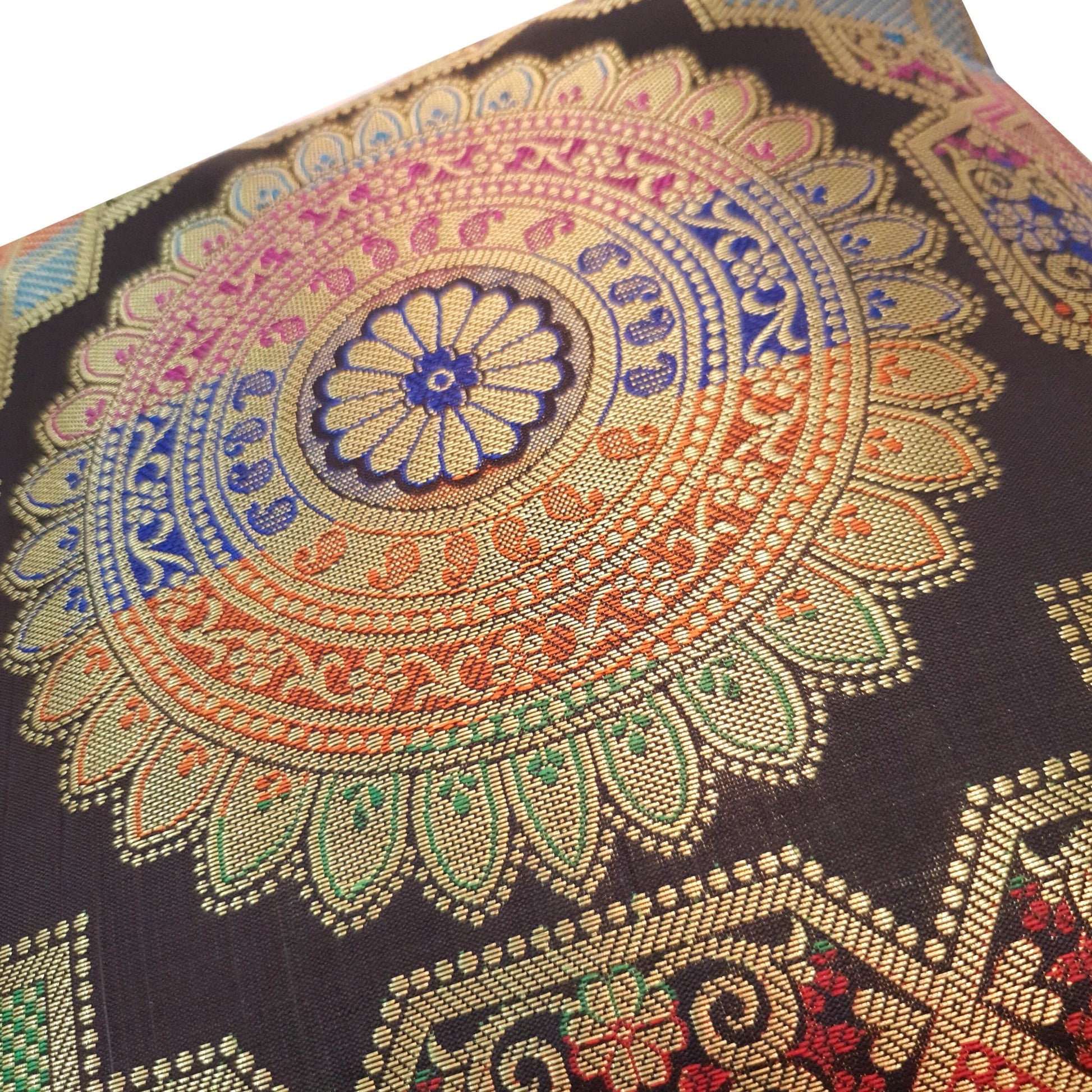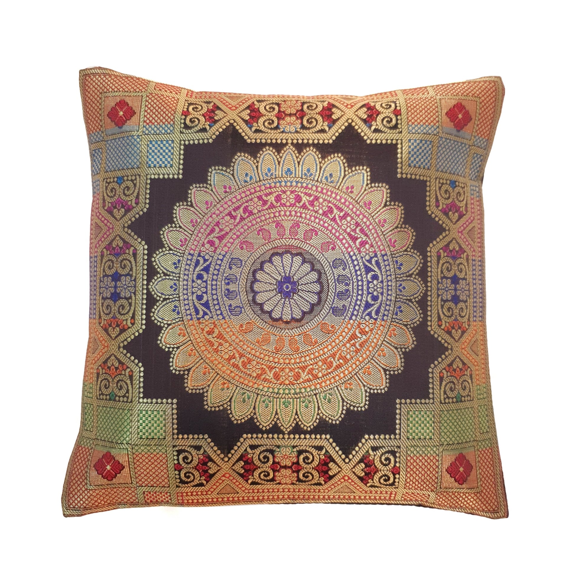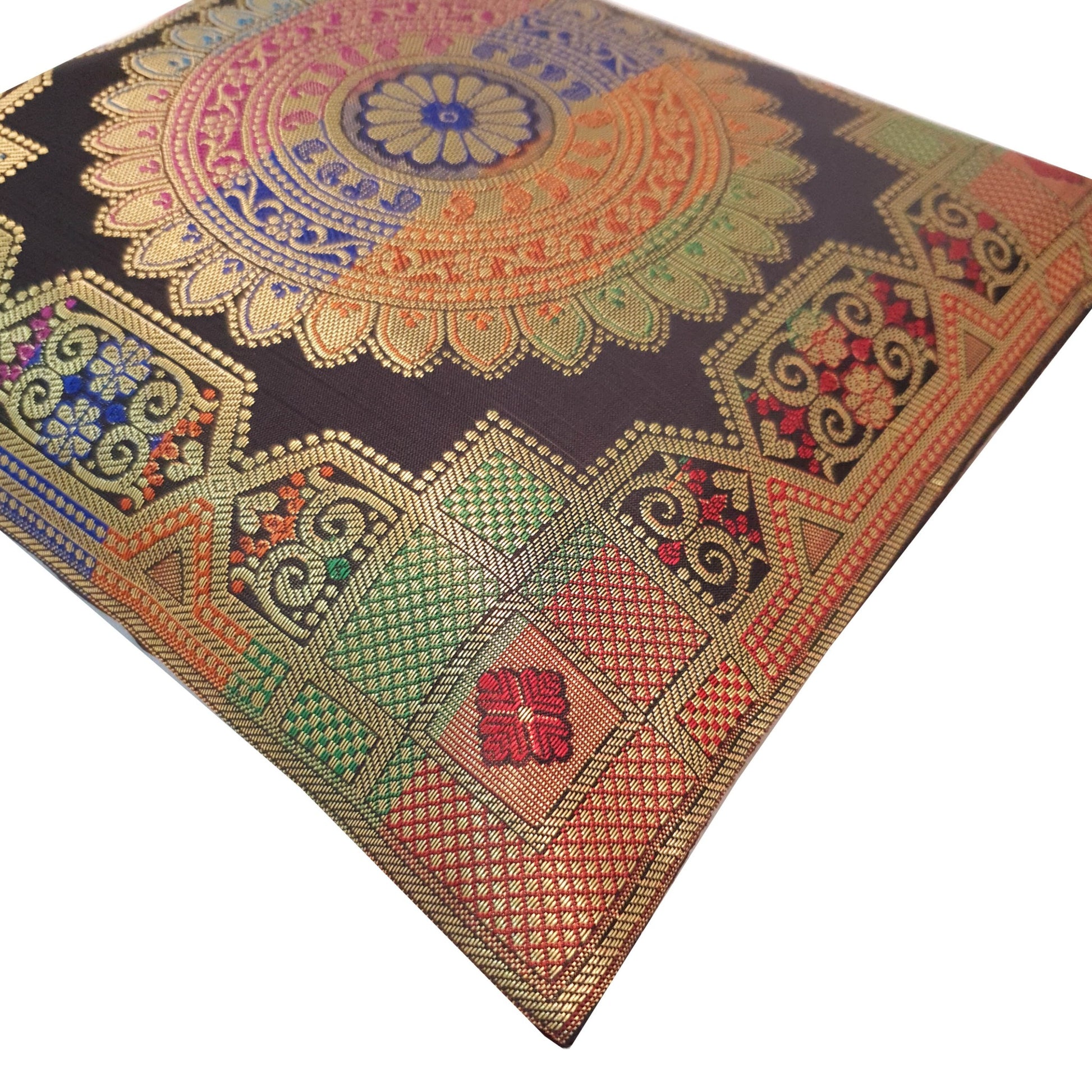 Banarasi Vastra Presents Indian Art Silk Woven Zari Brocade Banarasi Cushion Pillow Cover in Mandala Pattern in the center Part of the cover with all 4 Side Floral Zari Woven Border. this Cover comes with Matching color Back lining fabric with Hidden Zip which allow you to insert the Cushion Pillow. The base color of the cover is Black