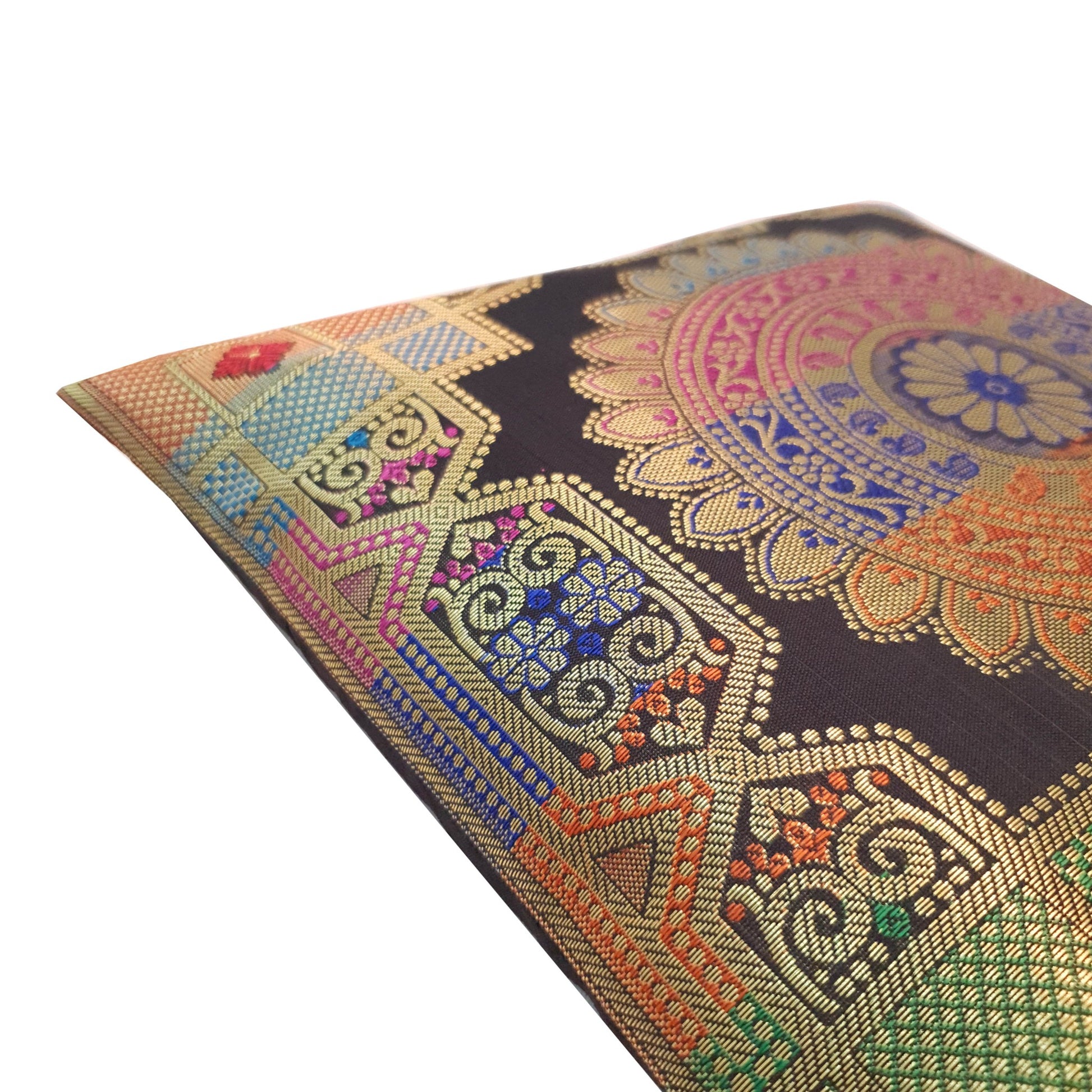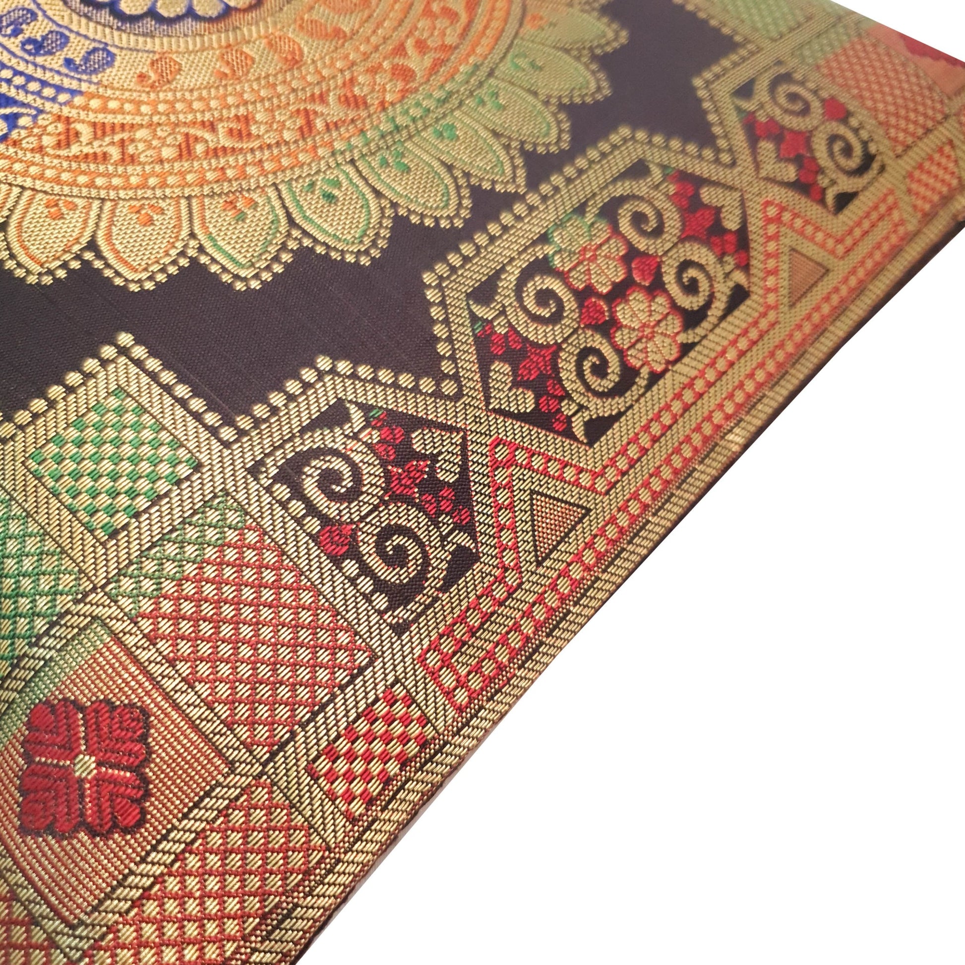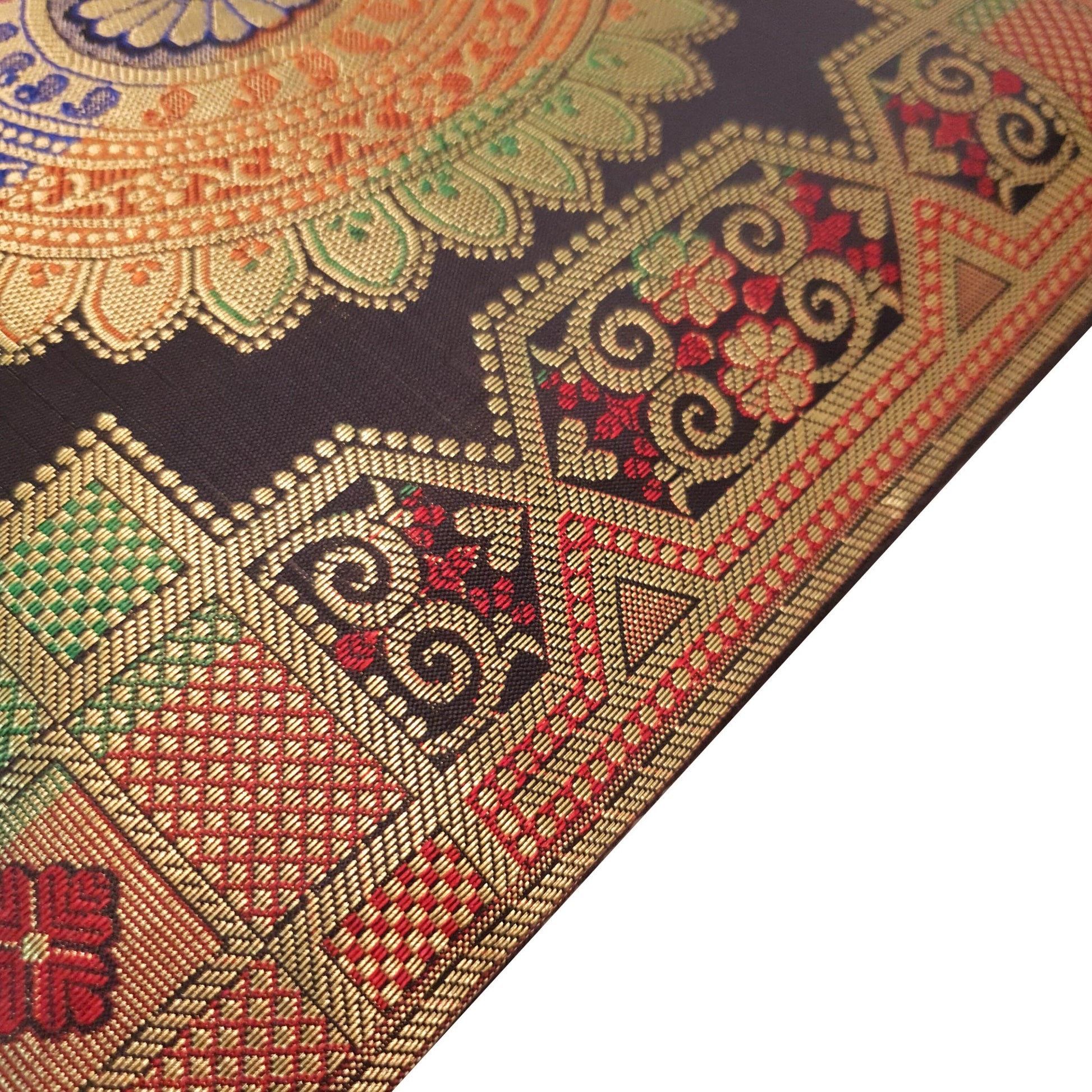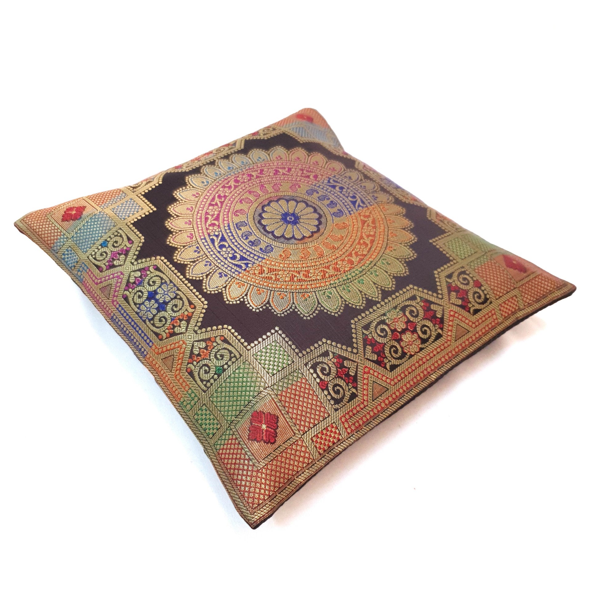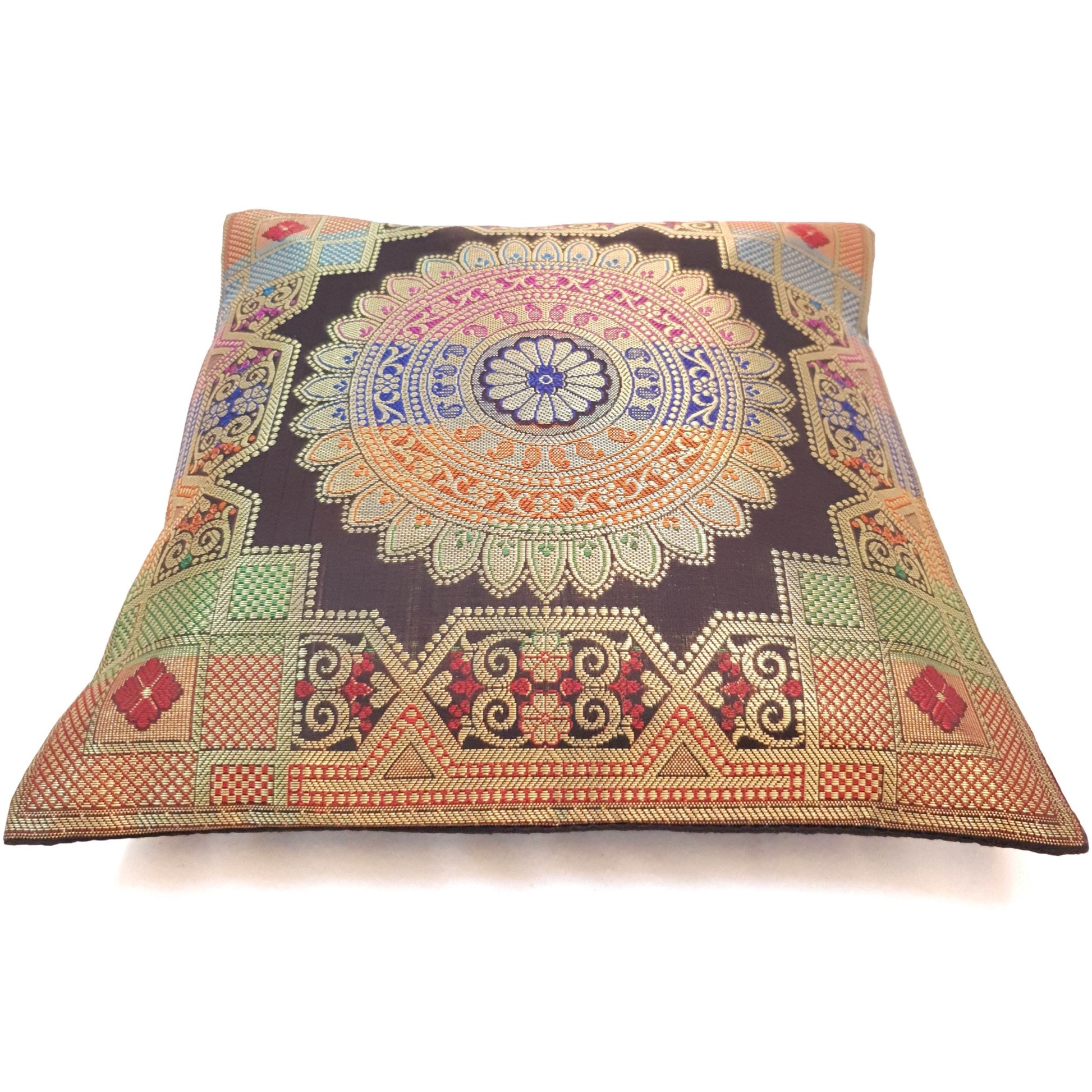 Banarasi Vastra Presents Indian Art Silk Woven Zari Brocade Banarasi Cushion Pillow Cover in Mandala Pattern in the center Part of the cover with all 4 Side Floral Zari Woven Border. this Cover comes with Matching color Back lining fabric with Hidden Zip which allow you to insert the Cushion Pillow. The base color of the cover is Black