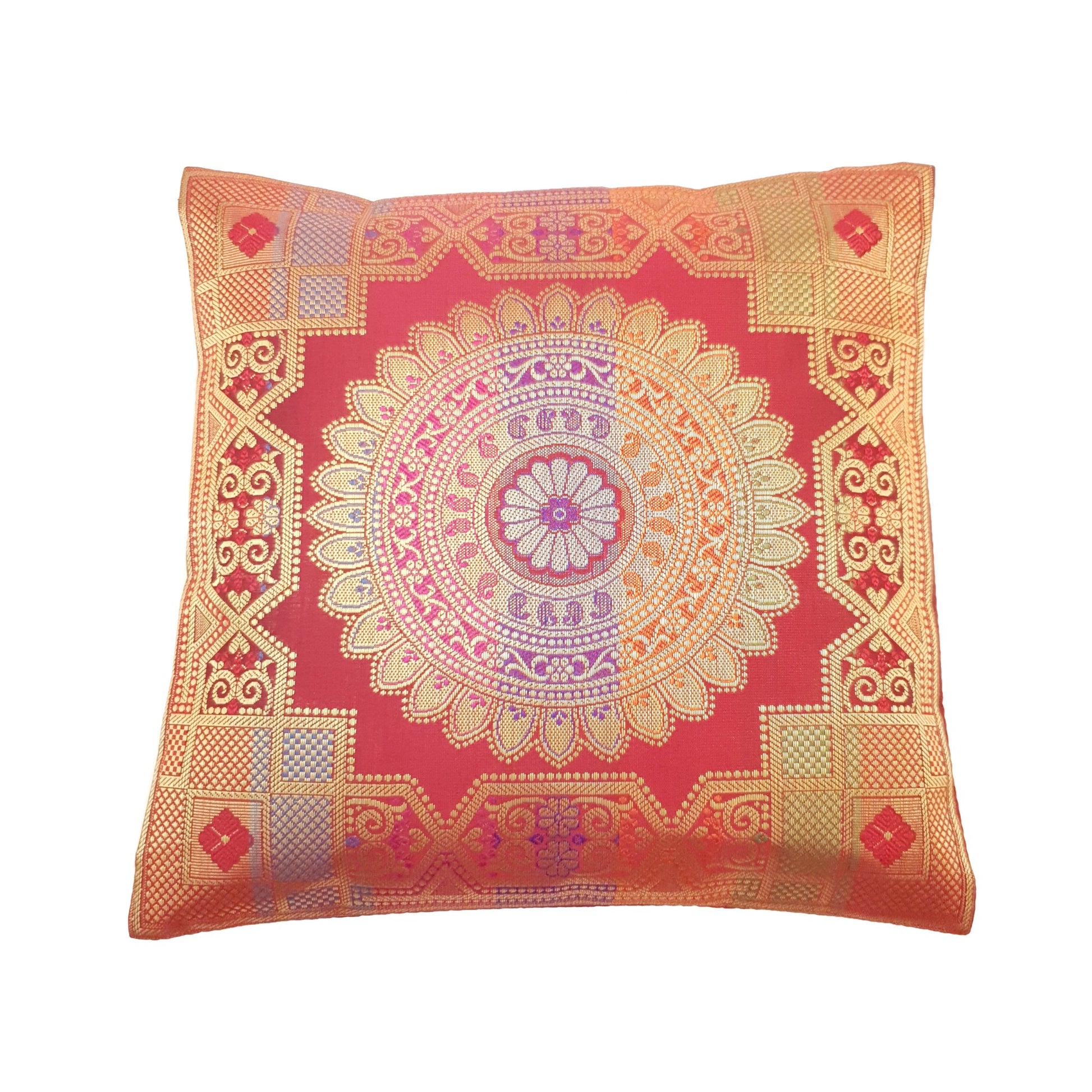 12x12 Inch Cushion Covers Indian Banarasi Mandala Woven Zari Brocade Silk Maroon