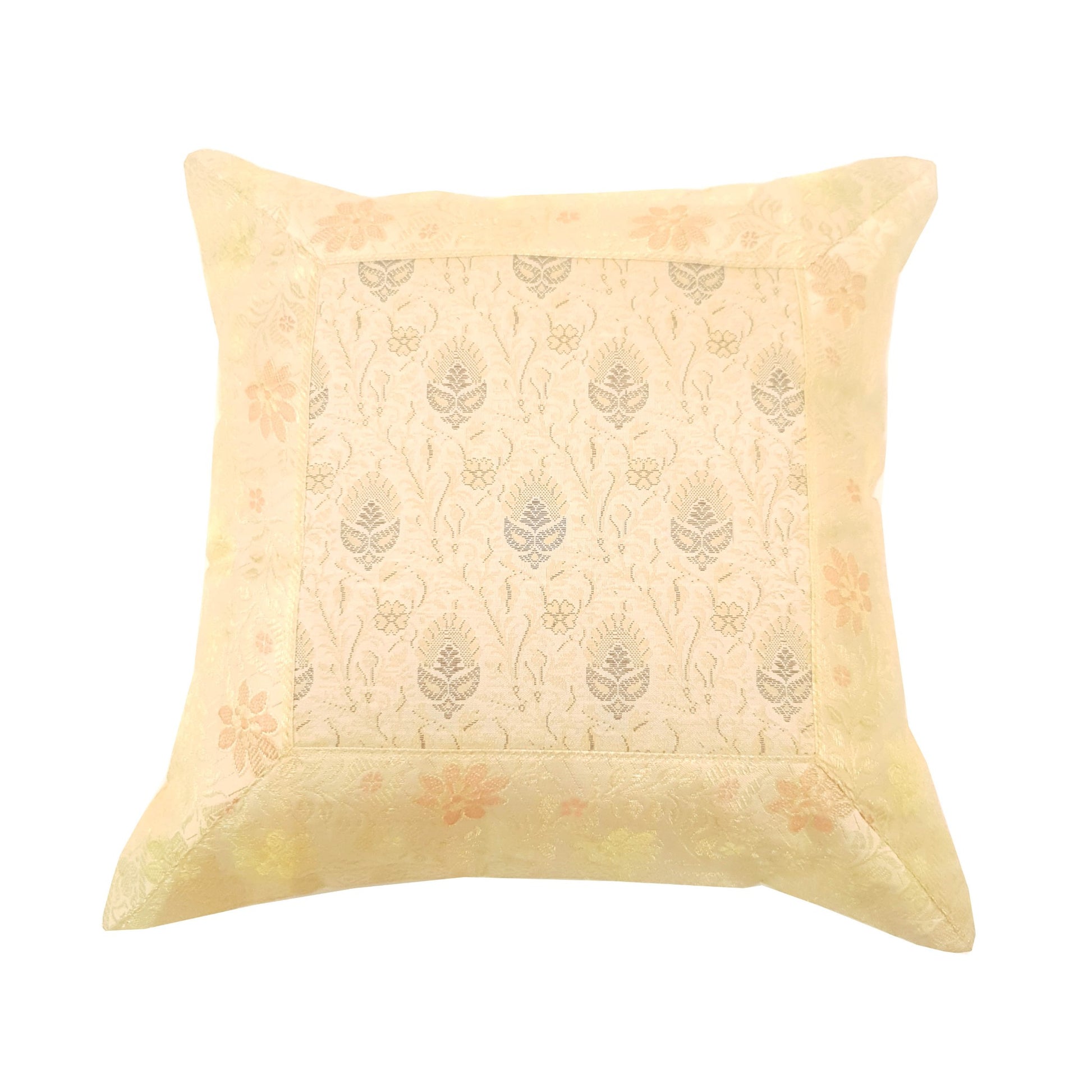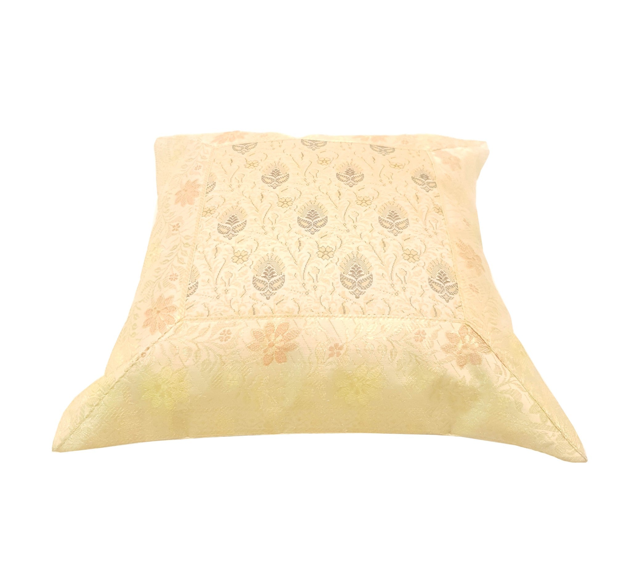12x12 Inch Indian Woven Zari Brocade Banarasi Silk Floral Cream Cushion Covers
