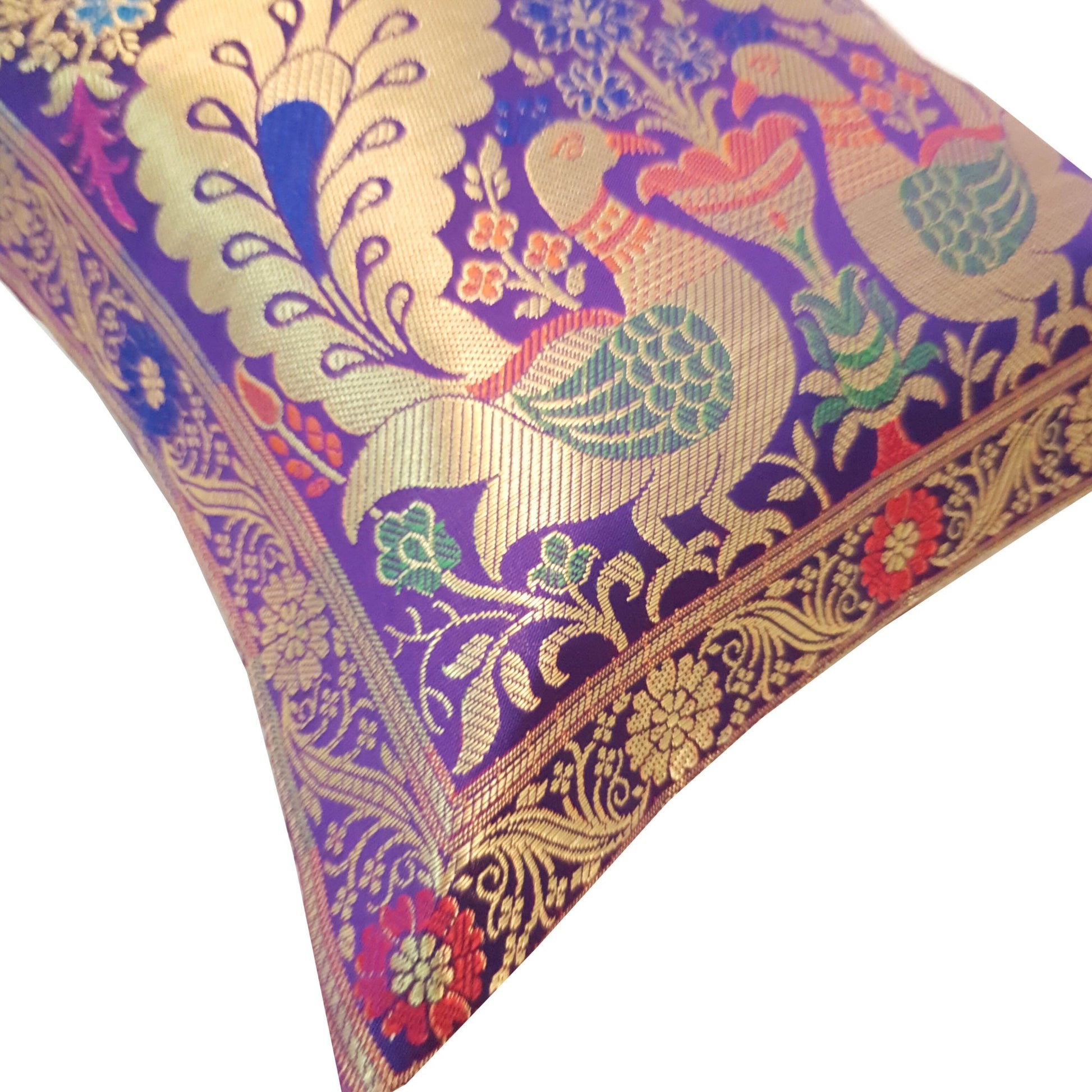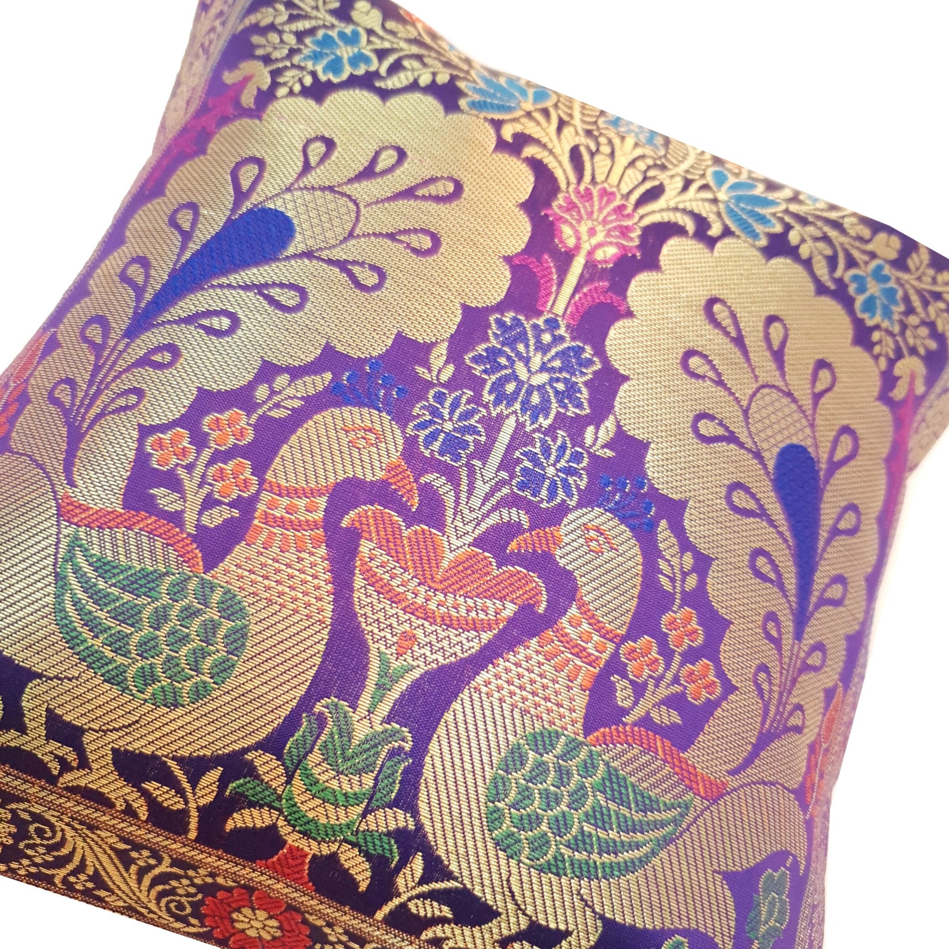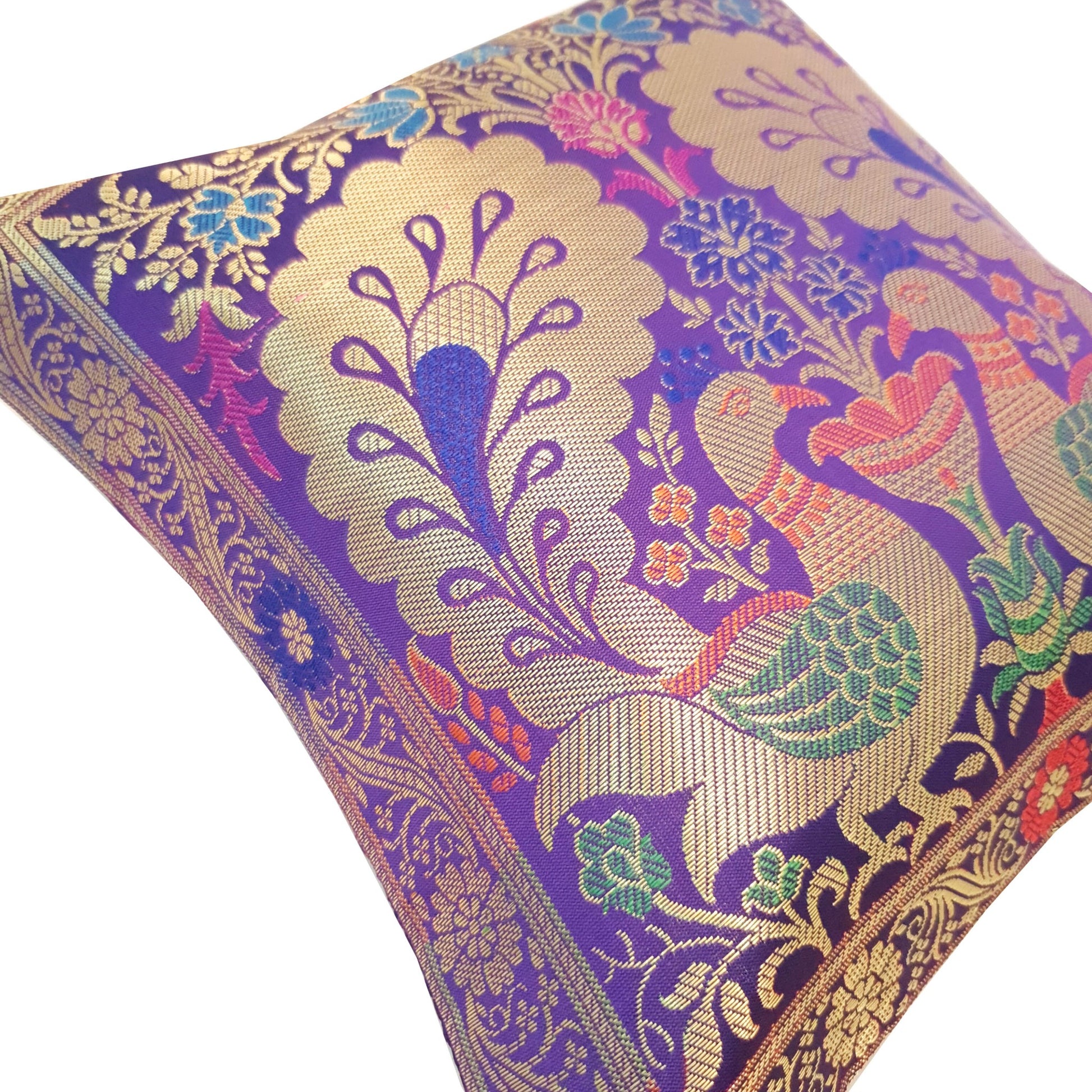 12x12 Inch Purple Cushion Cover Banarasi Decor Woven Peacock Zari Brocade Silk