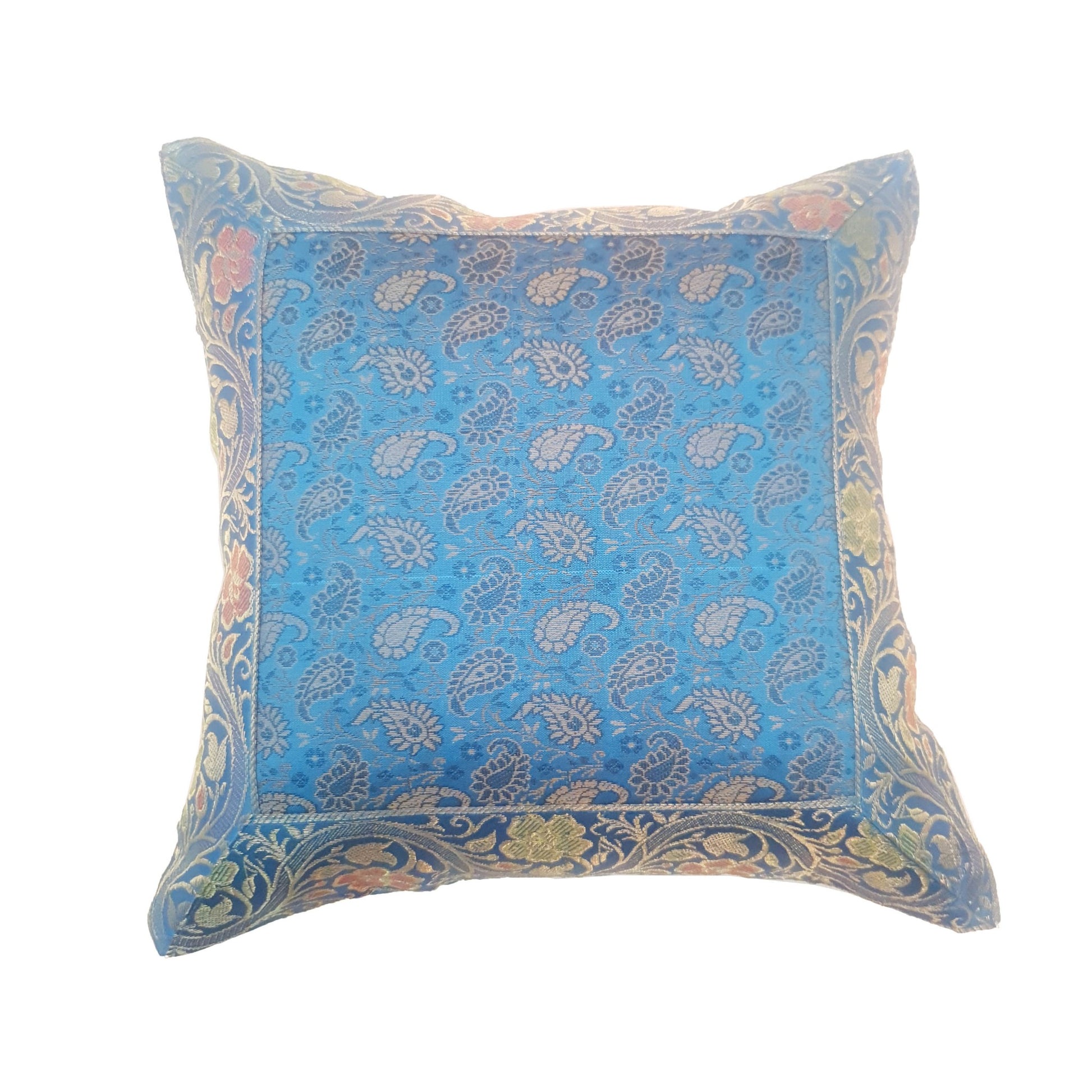 Banarasi Vastra Presents Indian Art Silk Woven Zari Brocade Banarasi Cushion Pillow Cover in Paisley Pattern in the center Part of the cover with all 4 Side Floral Zari Woven Border. this Cover comes with Matching color Back lining fabric with Hidden Zip which allow you to insert the Cushion Pillow. The base color of the cover is Turquoise Blue .