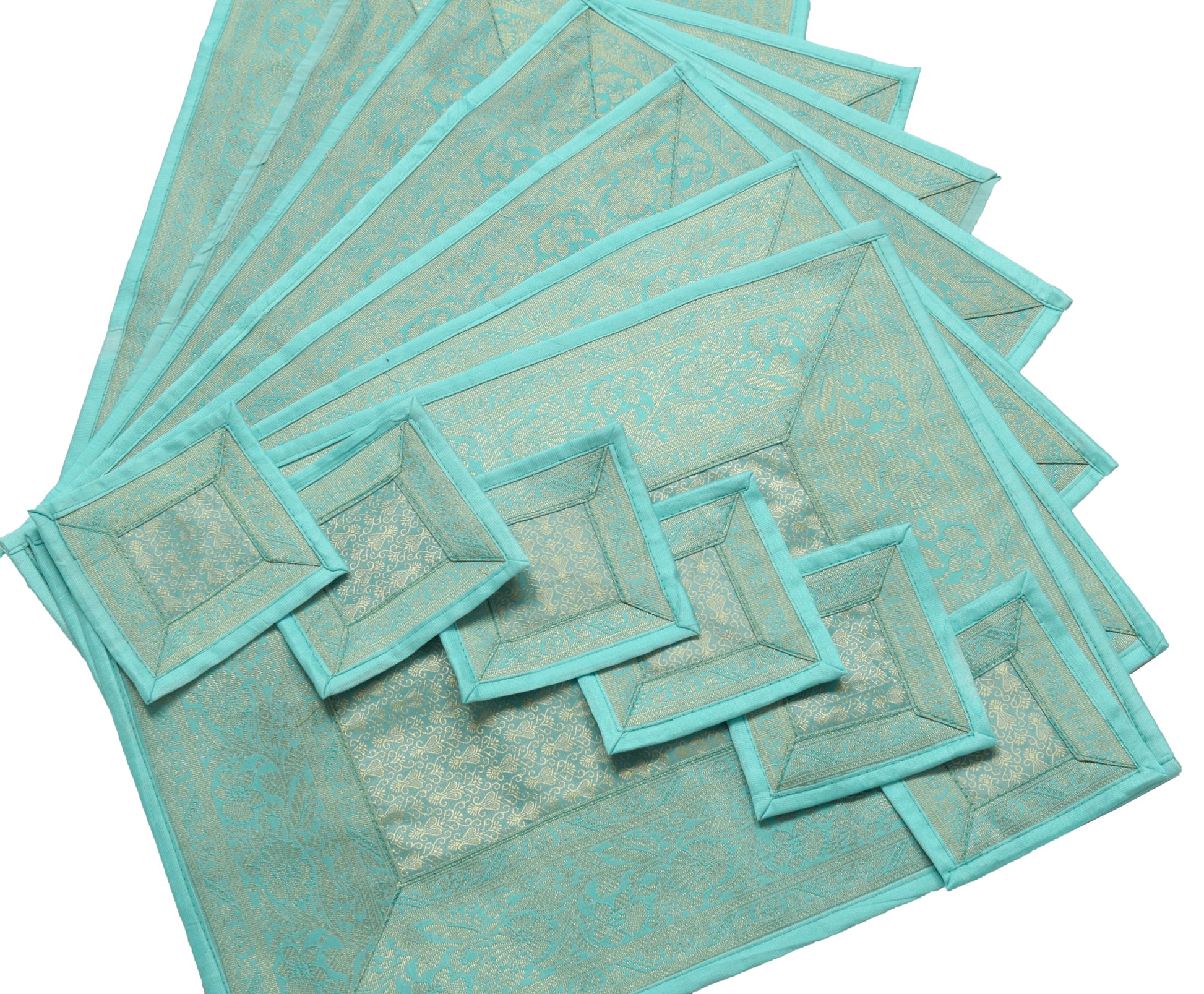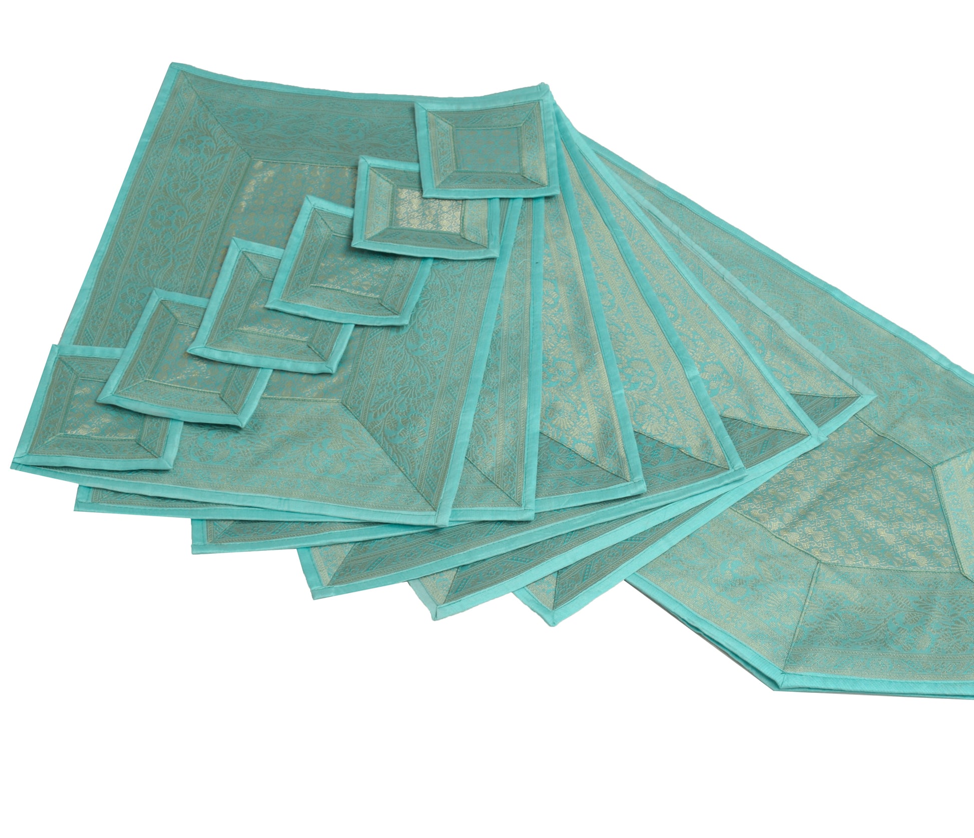 13 PC Aqua Blue Dining Table Runner Set Decor Banarasi Silk Brocade Paisley Gift