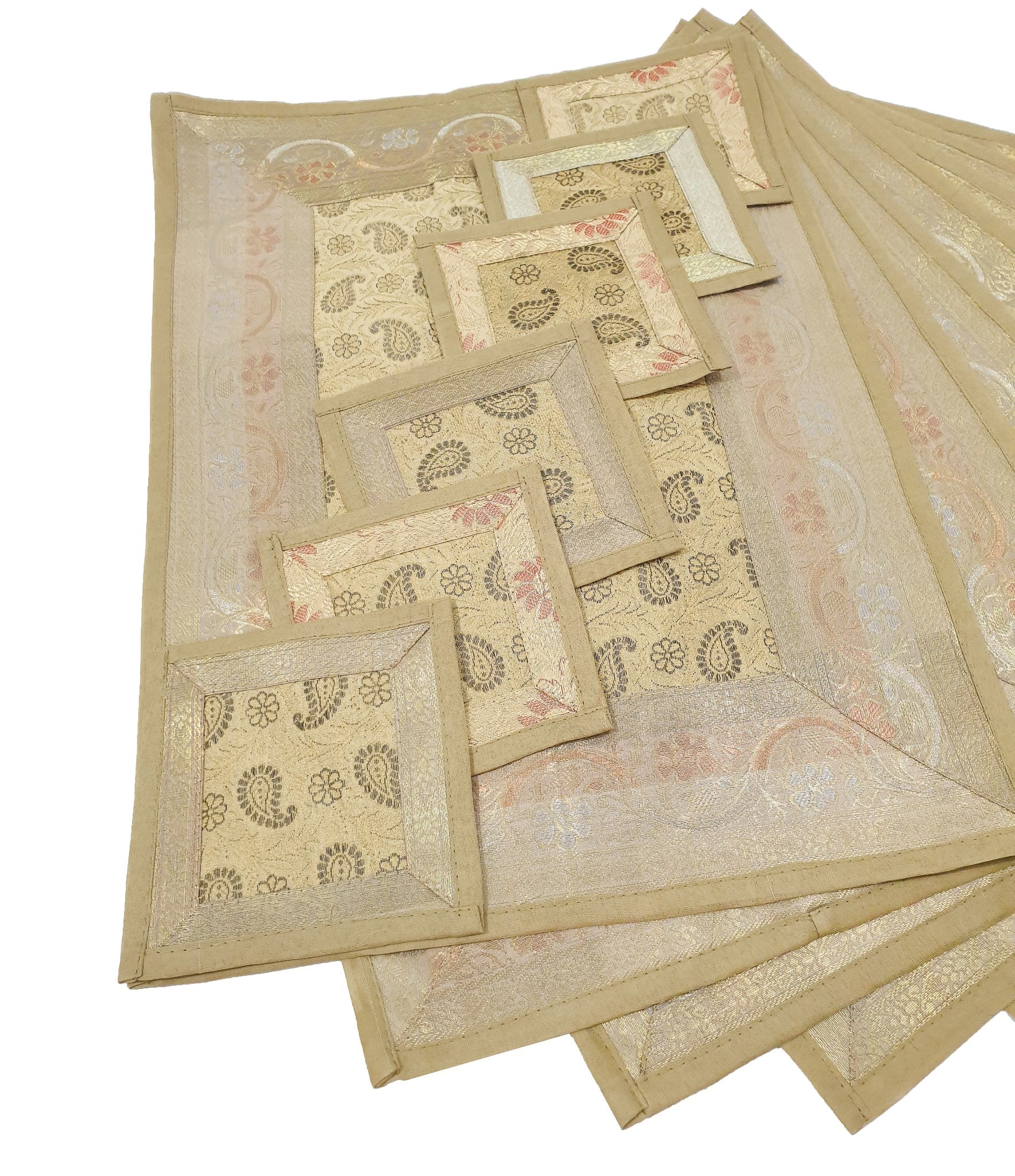 This Table Runner Coaster Set is Woven with Golden Zari Brocade Banarasi Silk Fabric with Woven Paisley Pattern Tanchoi Fabric in the center Part of the cover with all Side Floral Zari Woven Border, The Runner Includes 2 side Golden Zari Tassel. This Runner Coaster Set comes with Matching color Back lining fabric.