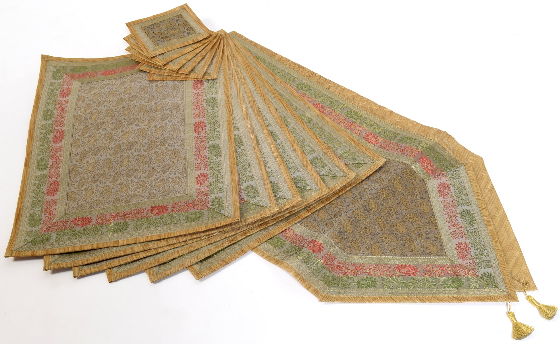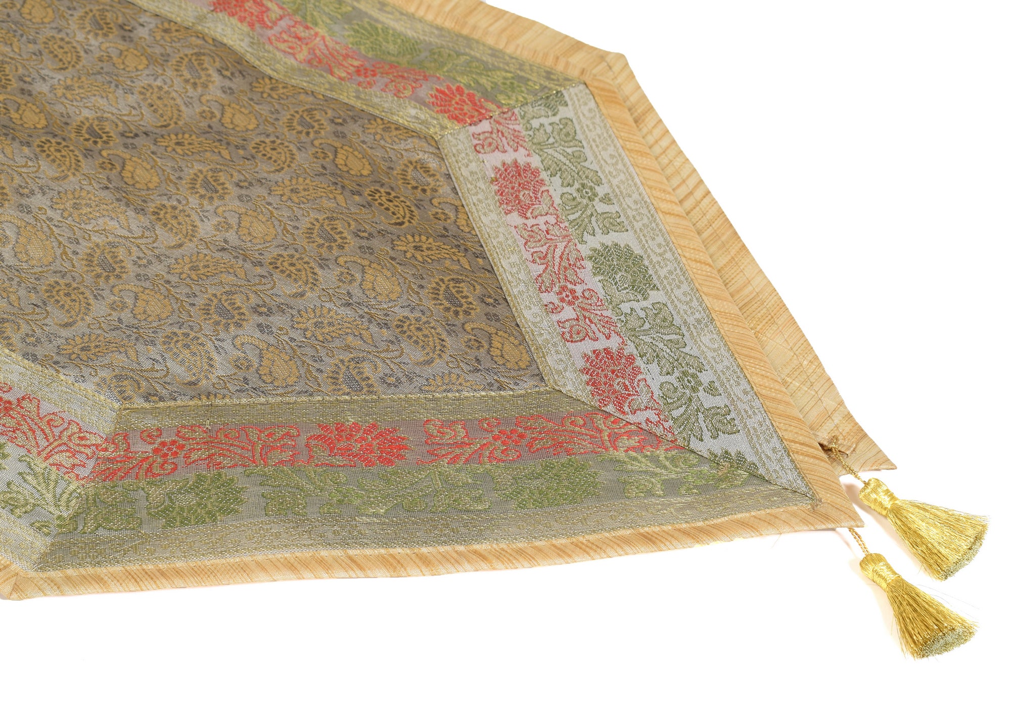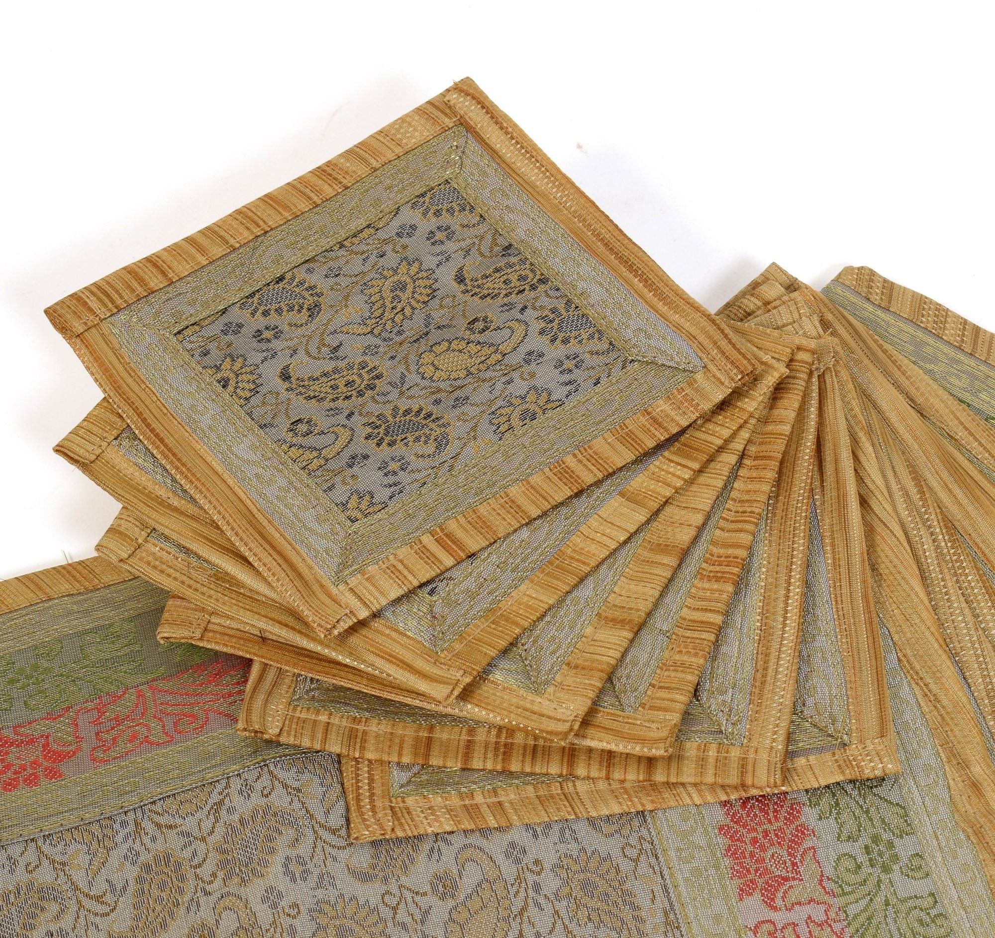This Table Runner Coaster Set is Woven with Golden Zari Brocade Banarasi Silk Fabric with Woven Paisley Pattern Tanchoi Fabric in the center Part of the cover with all Side Floral Zari Woven Border, The Runner Includes 2 side Golden Zari Tassel. This Runner Coaster Set comes with Matching color Back lining fabric.