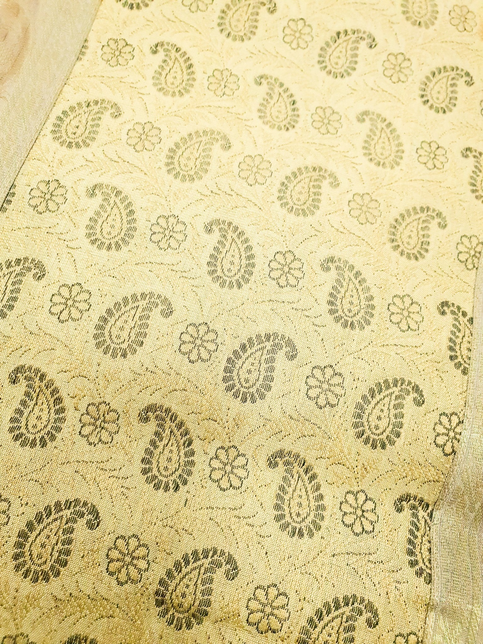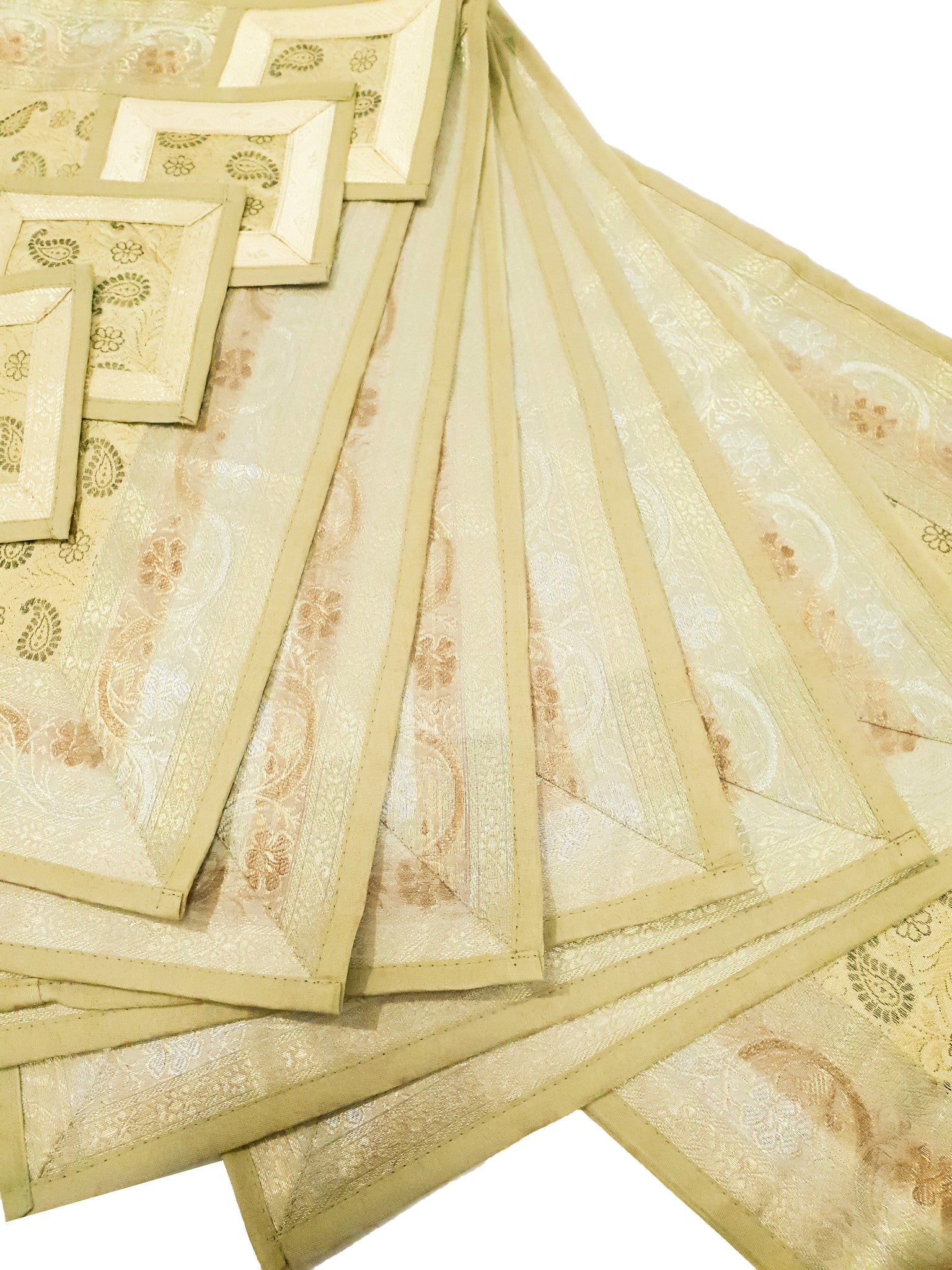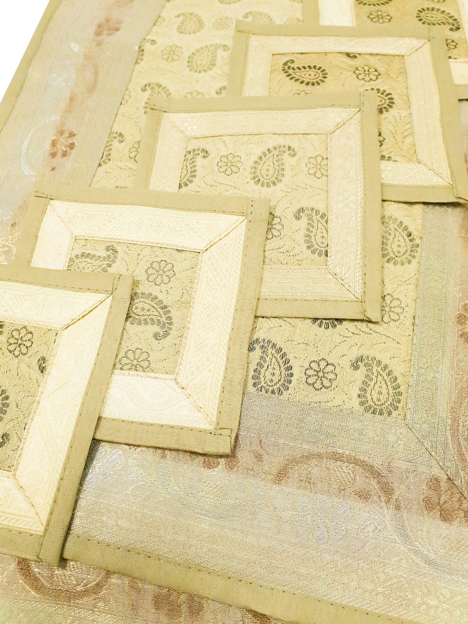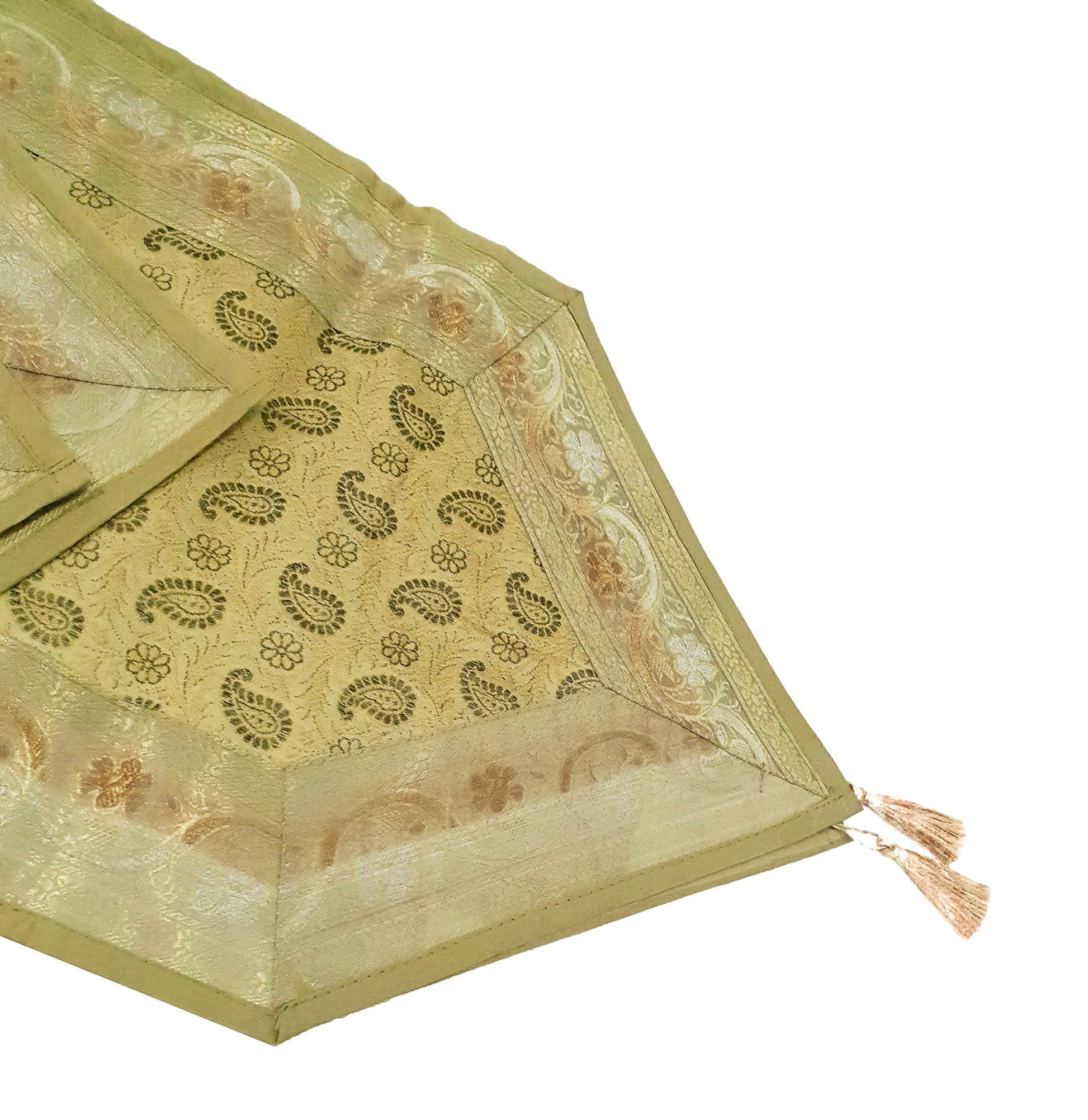 This Table Runner Coaster Set is Woven with Golden Zari Brocade Banarasi Silk Fabric with Woven Paisley Pattern Tanchoi Fabric in the center Part of the cover with all Side Floral Zari Woven Border, The Runner Includes 2 side Golden Zari Tassel. This Runner Coaster Set comes with Matching color Back lining fabric.