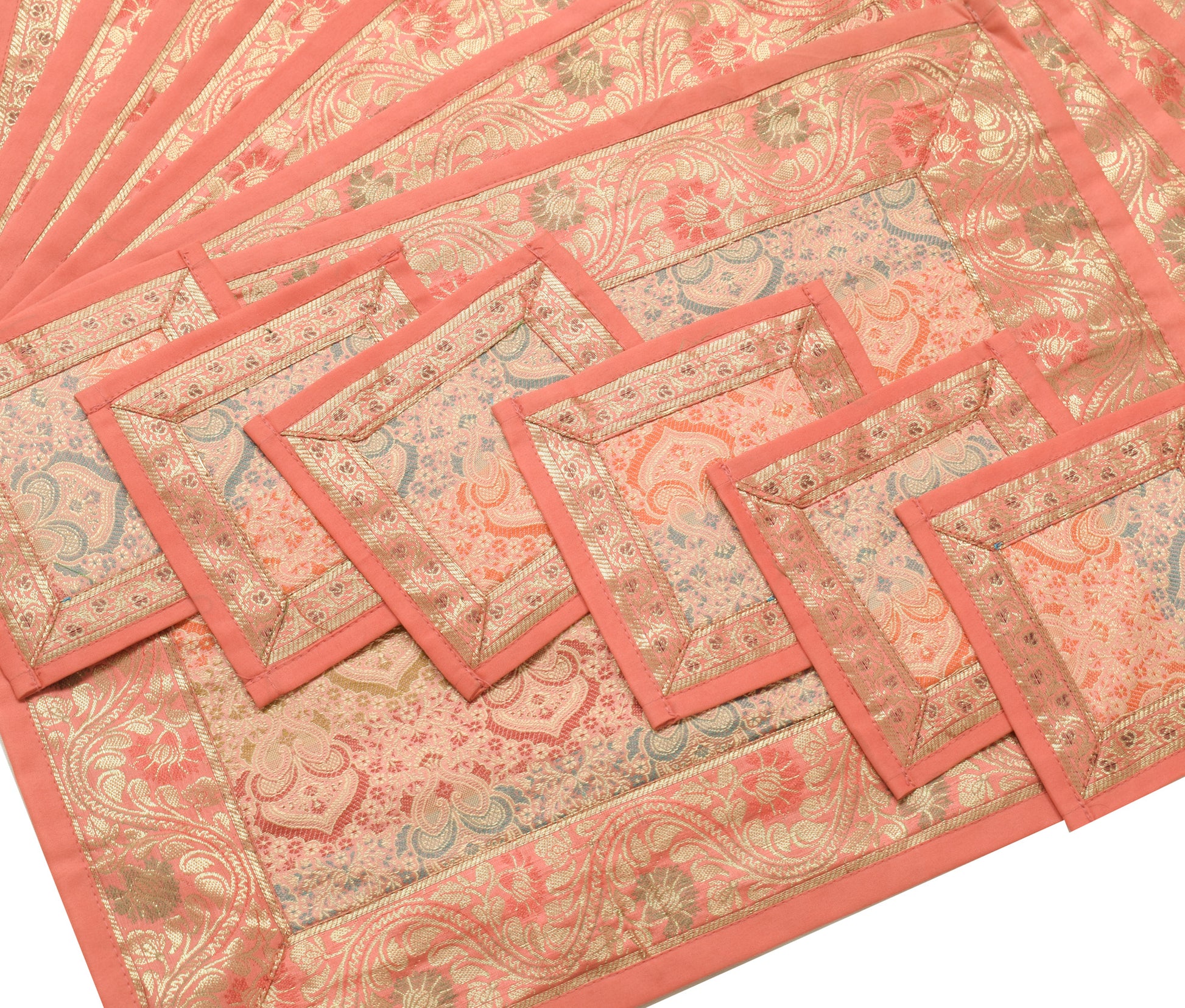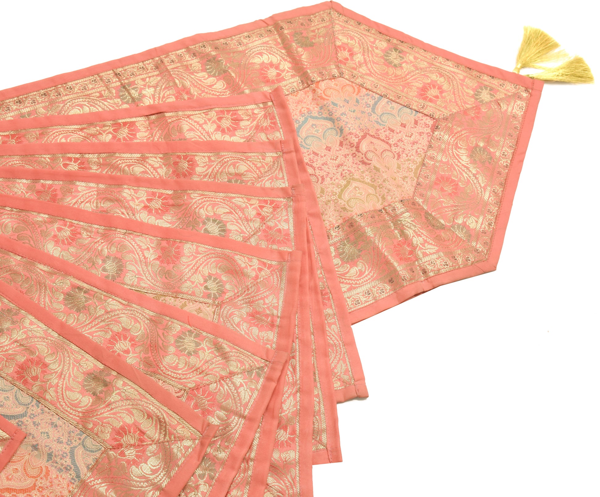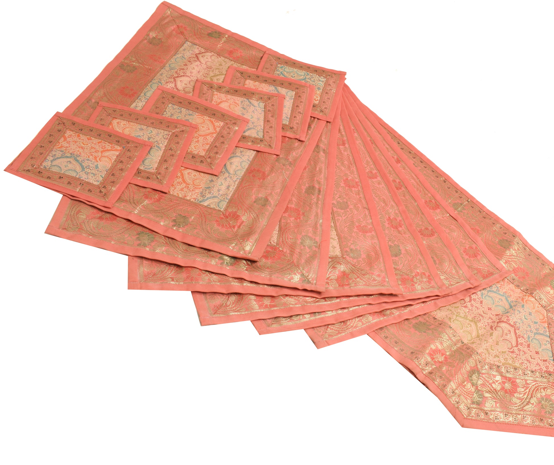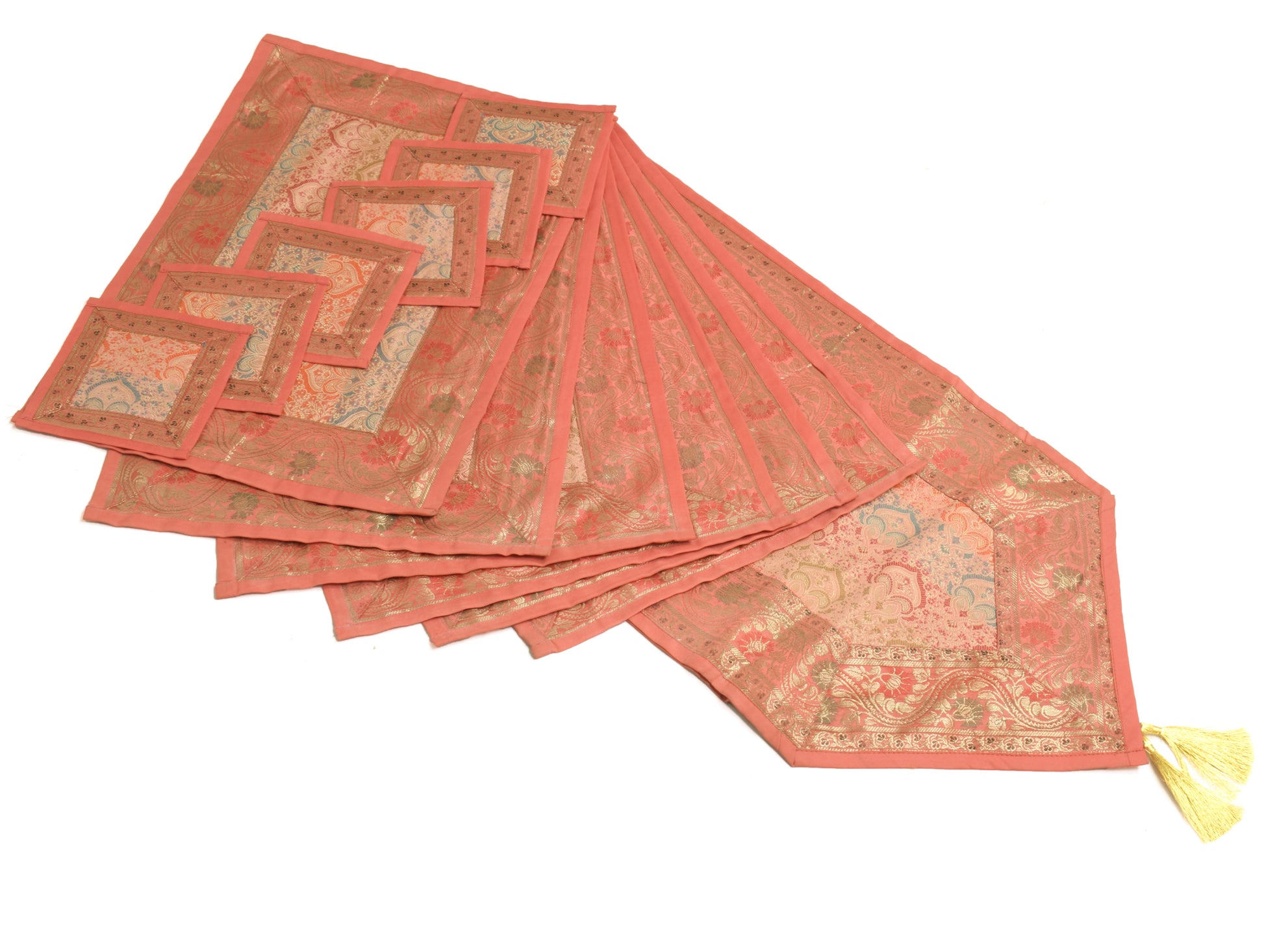 13 PC Peach Dining Table Runner Set Decor Banarasi Silk Brocade Paisley Gift