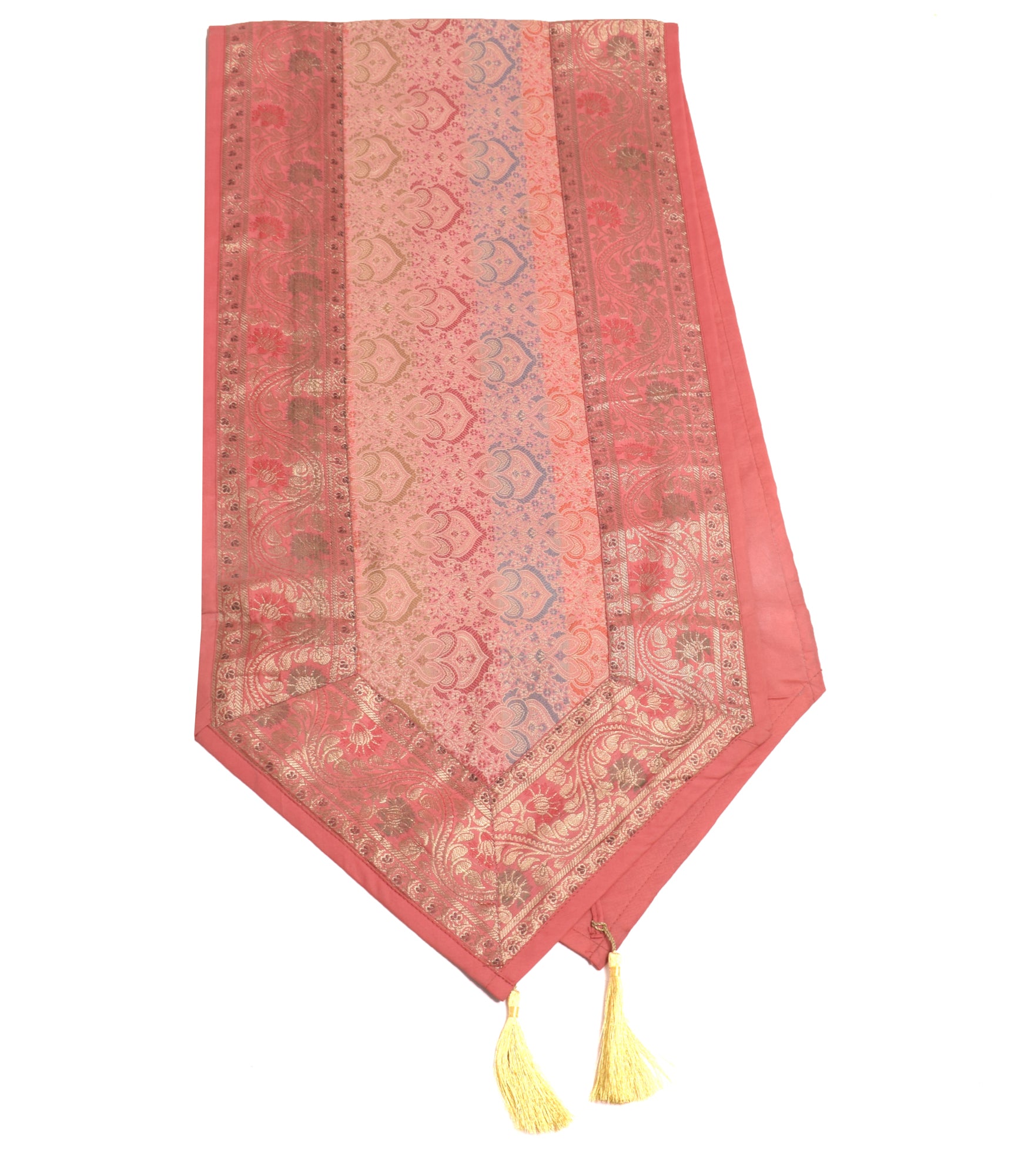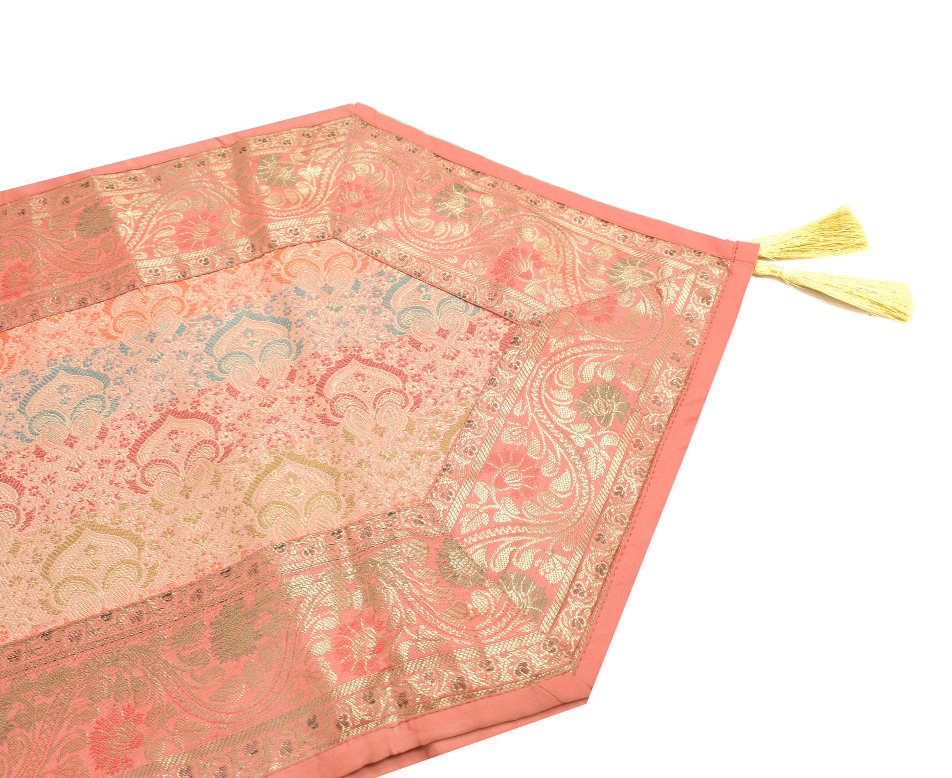 This Table Runner Coaster Set is Woven with Golden Zari Brocade Banarasi Silk Fabric with Woven Paisley Pattern Tanchoi Fabric in the center Part of the cover with all Side Floral Zari Woven Border, The Runner Includes 2 side Golden Zari Tassel. This Runner Coaster Set comes with Matching color Back lining fabric.