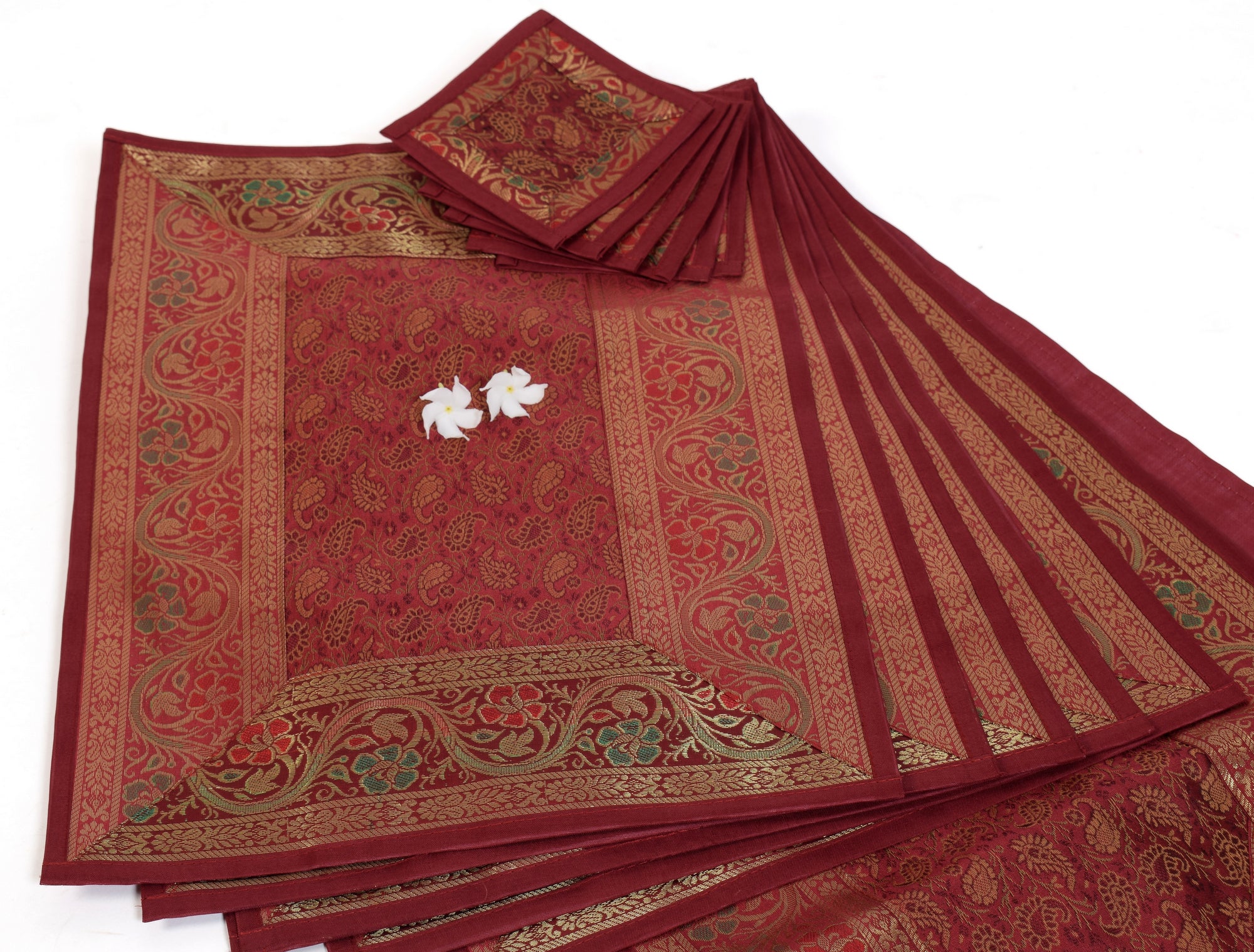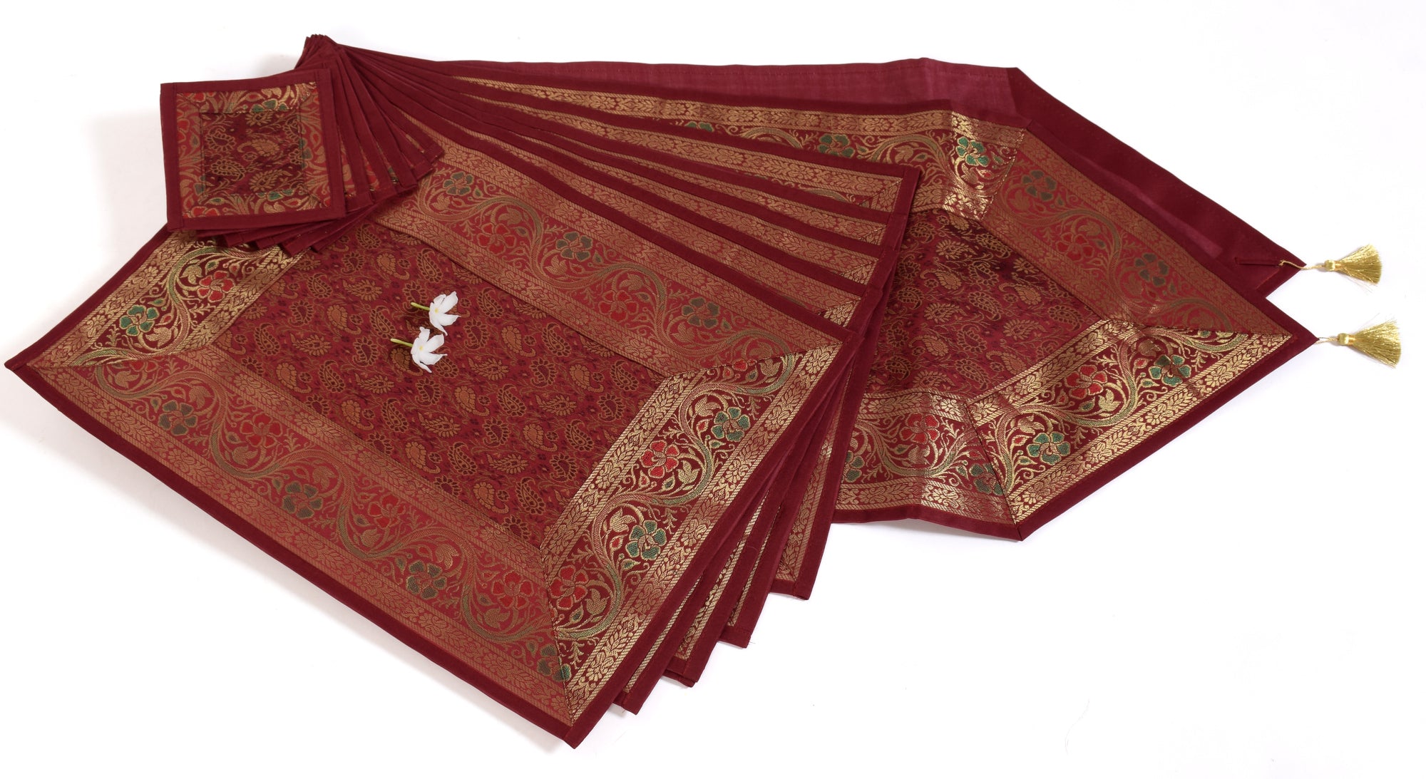 13PC Maroon Table Runner Dining Decor Banarasi Silk Brocade Paisley Indian Cloth