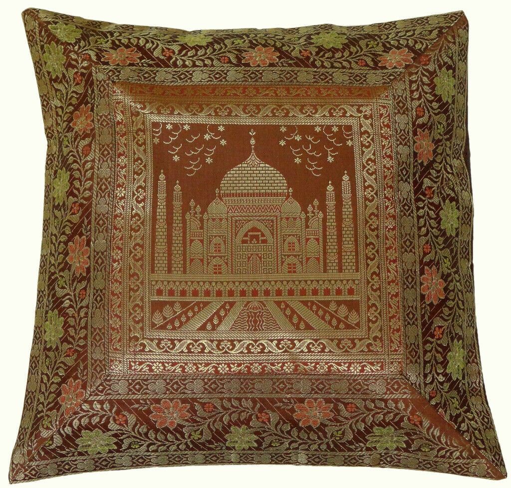 16" Sq Indian Art Silk Woven Zari Borcade Banarasi Cushion Pillow Covers Brown
