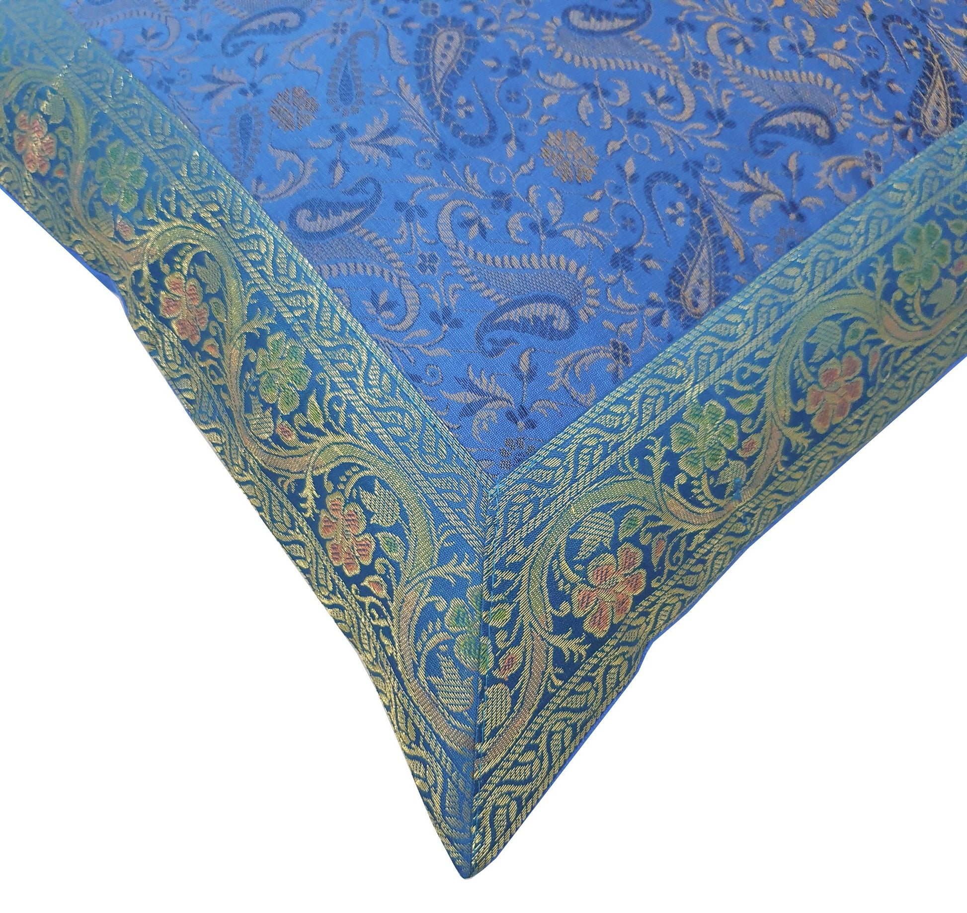Banarasi Vastra Presents Indian Art Silk Woven Zari Brocade Banarasi Cushion Pillow Cover in Paisley Pattern in the centre Part of the cover with all 4 Side Floral Zari Woven Border. this Cover comes with Matching color Back lining fabric with Hidden Zip which allow you to insert the Cushion Pillow. The base color of the cover is Turquoise Blue.