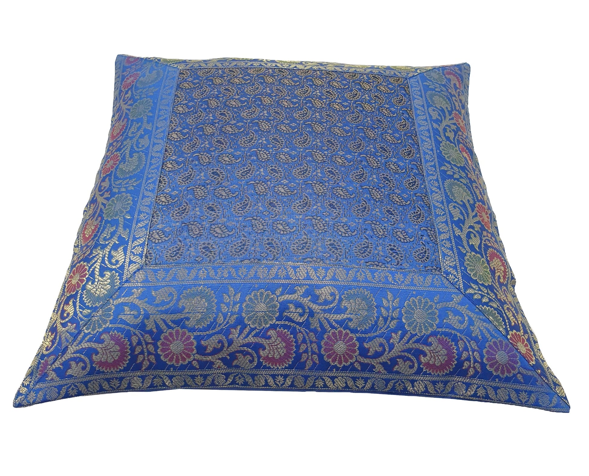 Banarasi Vastra Presents Indian Art Silk Woven Zari Brocade Banarasi Cushion Pillow Cover in Paisley Pattern in the centre Part of the cover with all 4 Side Floral Zari Woven Border. this Cover comes with Matching color Back lining fabric with Hidden Zip which allow you to insert the Cushion Pillow. The base color of the cover is Blue.