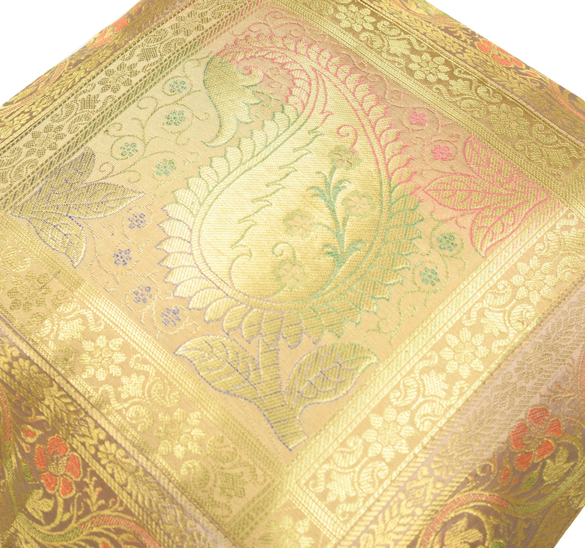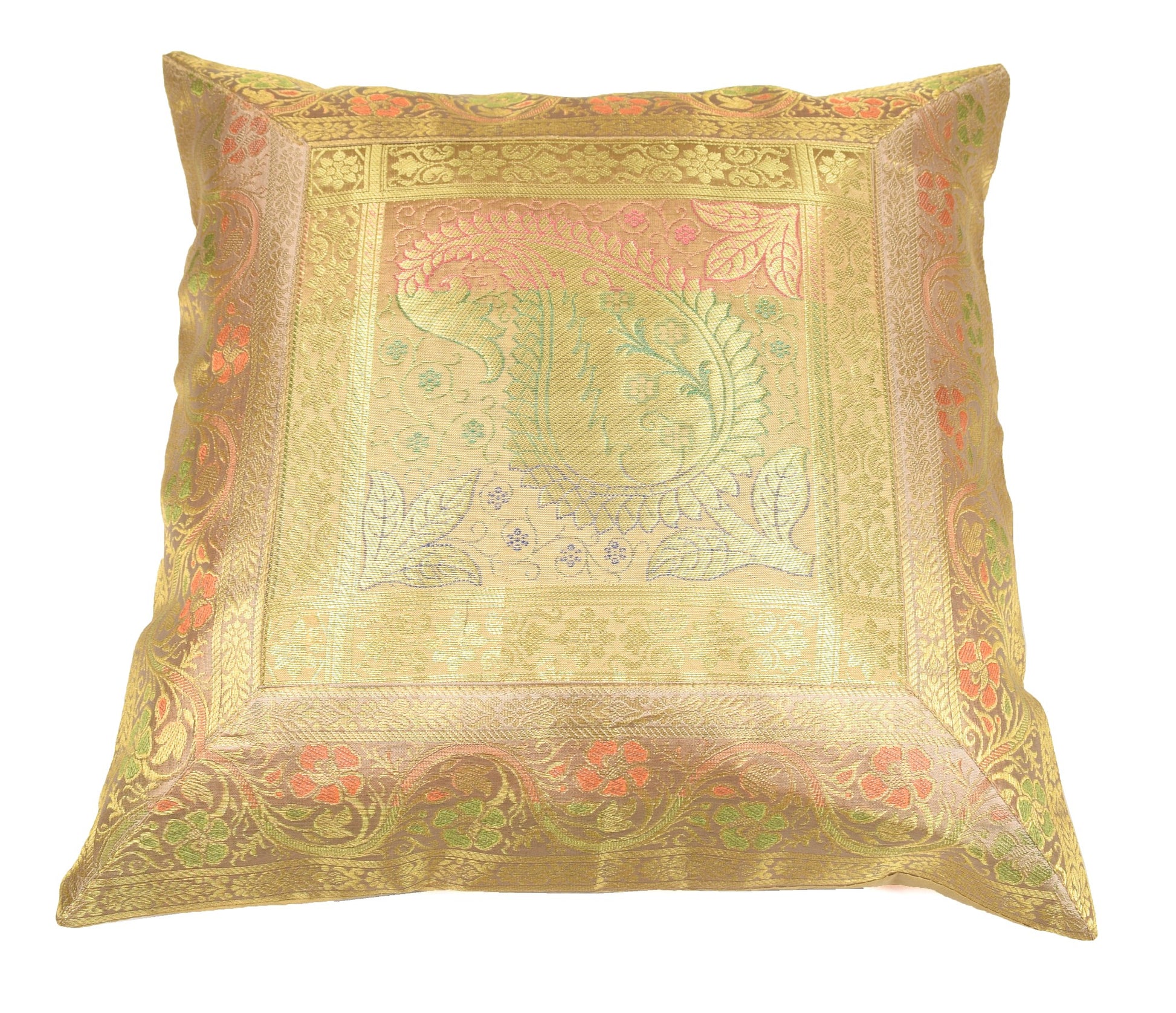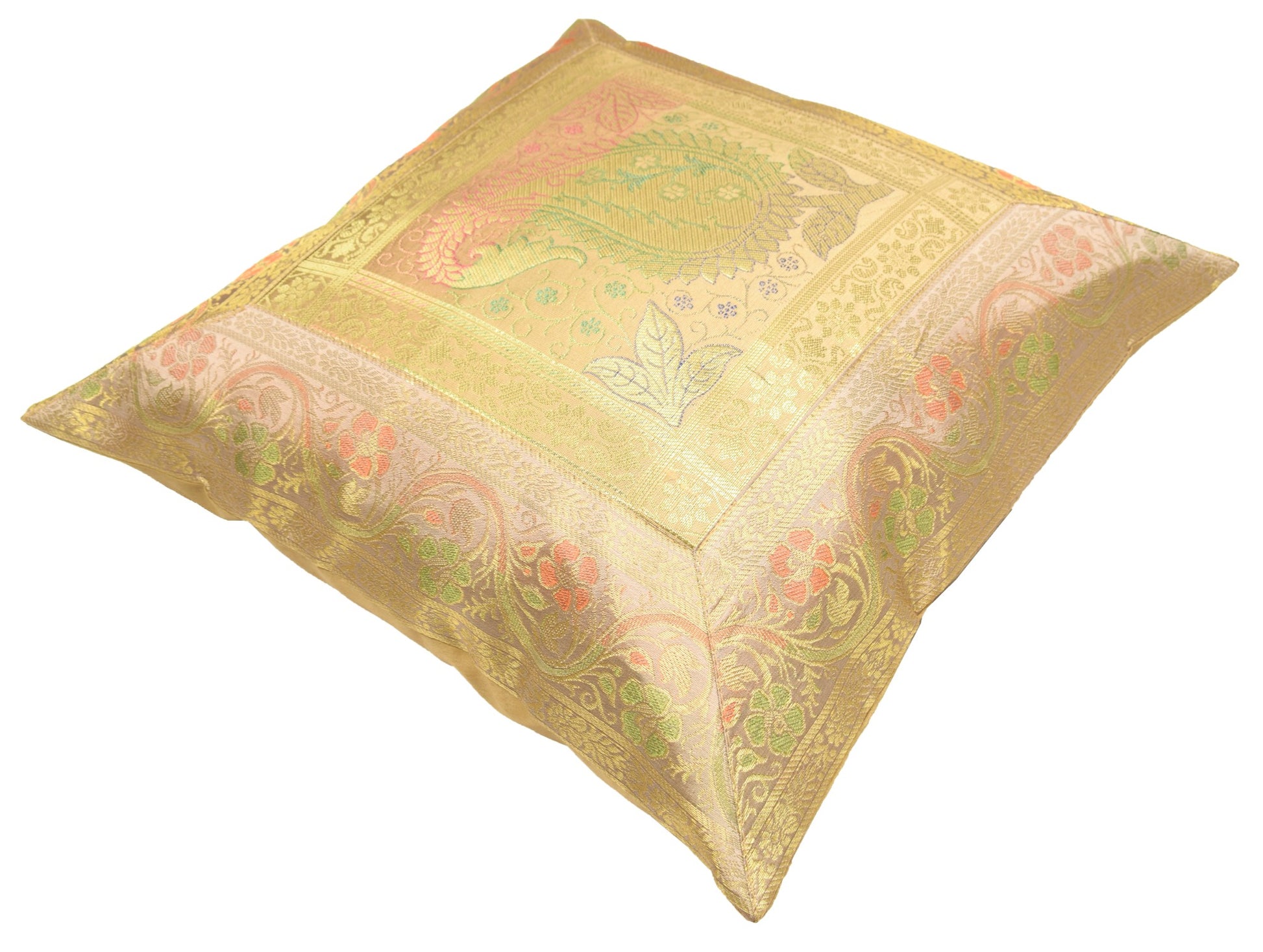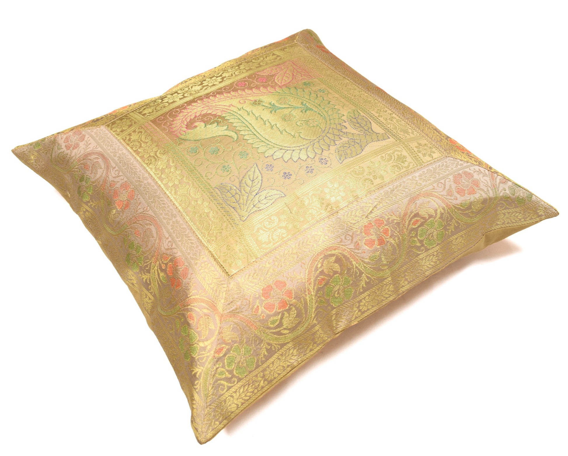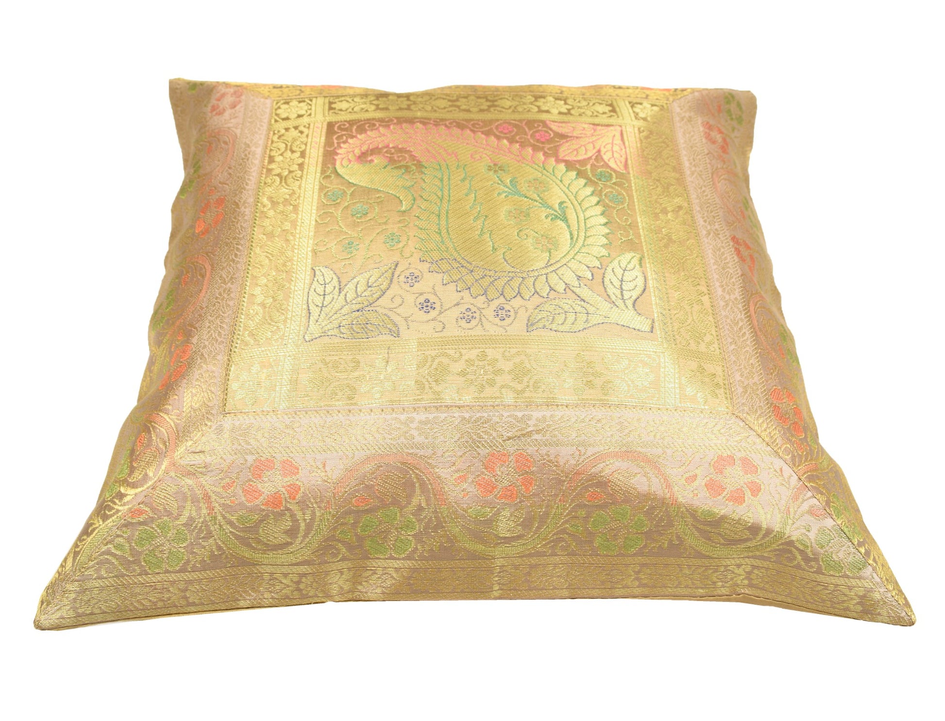 Banarasi Vastra Presents Indian Art Silk Woven Zari Brocade Banarasi Cushion Pillow Cover in Paisley Pattern in the centre Part of the cover with all 4 Side Floral Zari Woven Border. this Cover comes with Matching color Back lining fabric with Hidden Zip which allow you to insert the Cushion Pillow. The base color of the cover is Beige-Gold.