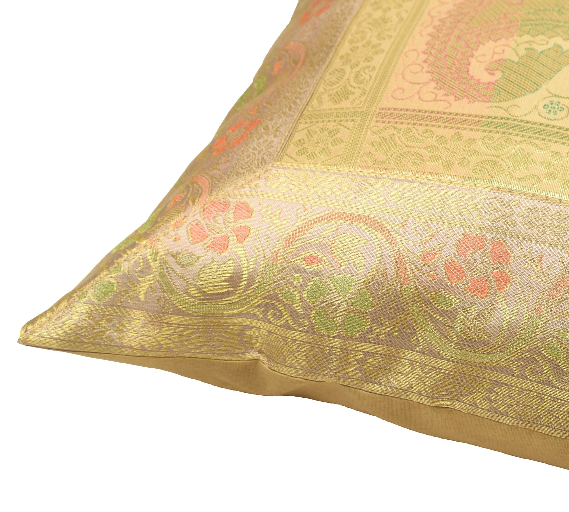 16x16" Beige-Gold Banarasi Silk Cushion Cover Featuring Zari Brocade Paisley