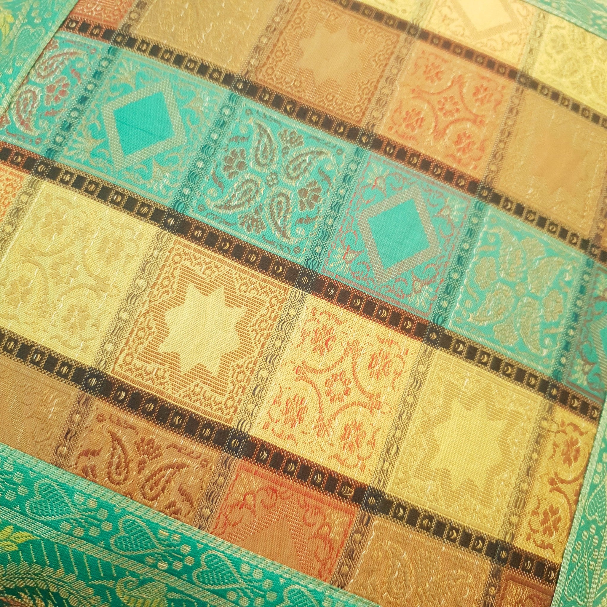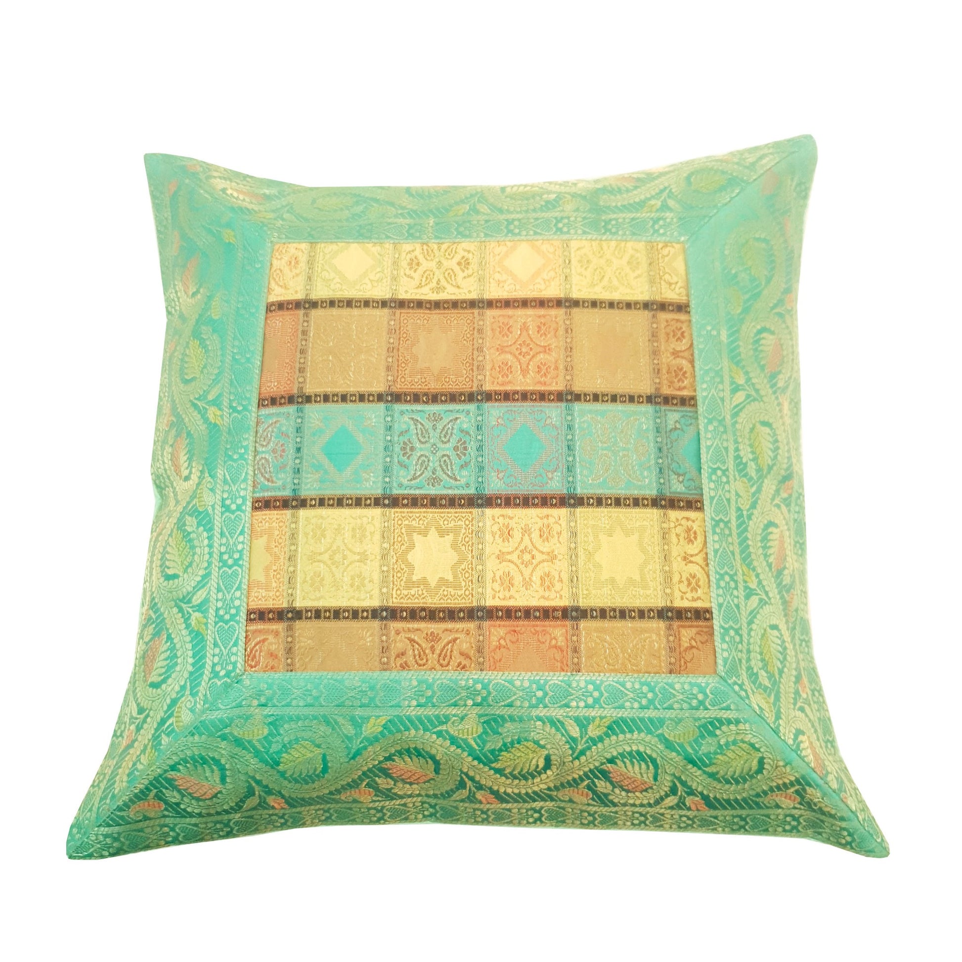 Banarasi Vastra Presents Indian Art Silk Woven Zari Brocade Banarasi Cushion Pillow Cover in Checks Pattern in the center Part of the cover with all 4 Side Floral Zari Woven Border. this Cover comes with Matching color Back lining fabric with Hidden Zip which allow you to insert the Cushion Pillow. The base color of the cover is Multi-Color & Aqua Green