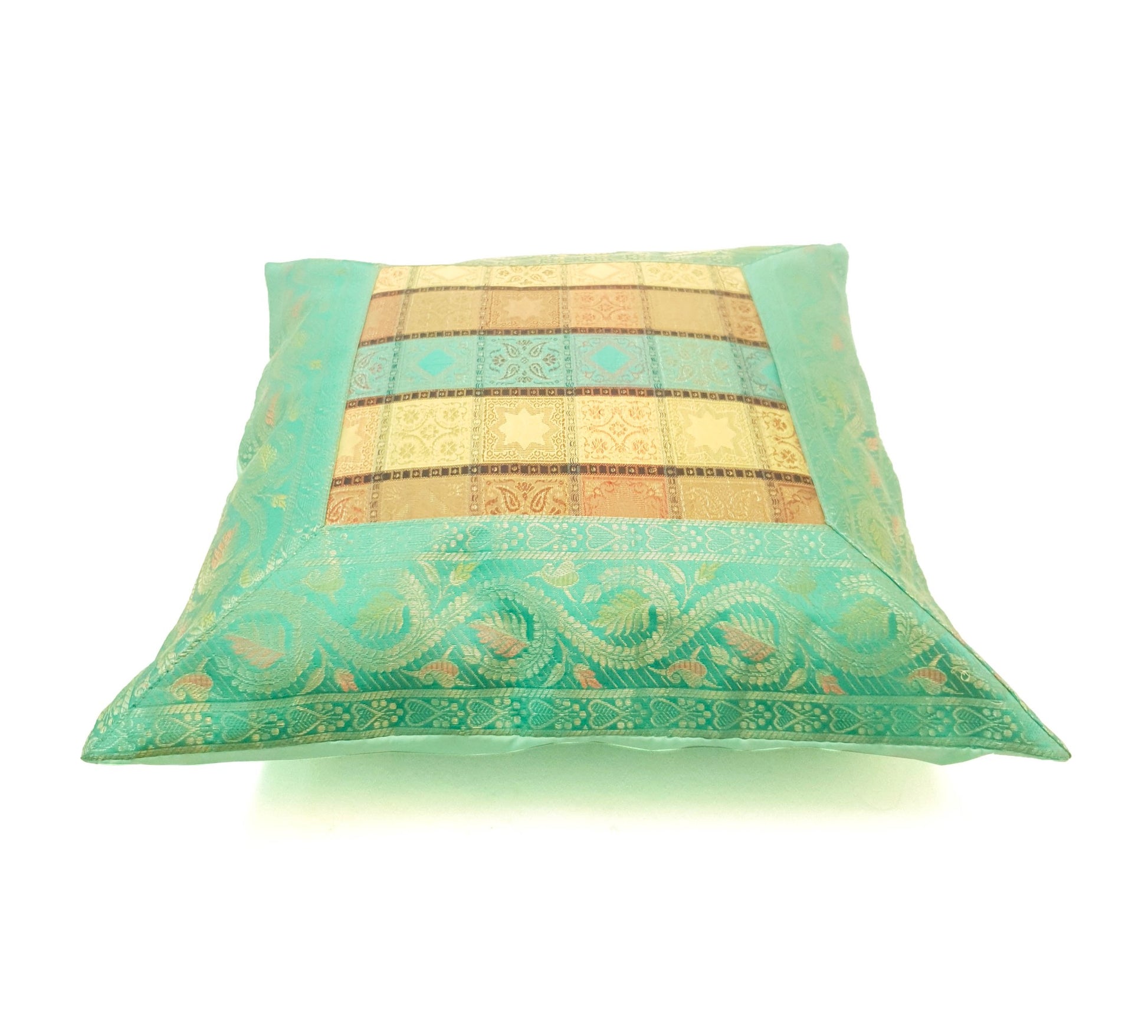 16X16 Inch Banarasi Cushion Covers Zari Brocade Silk Aqua Green Check Home Decor