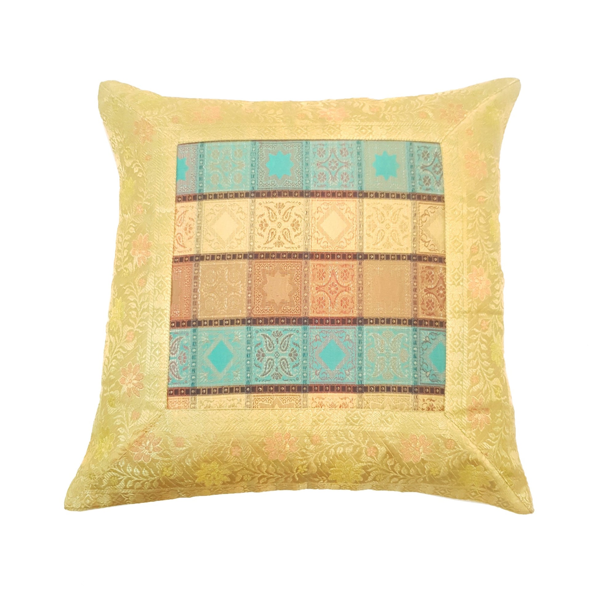 16X16 Inch Banarasi Cushion Covers Zari Brocade Silk Multi-Color Checks Decor