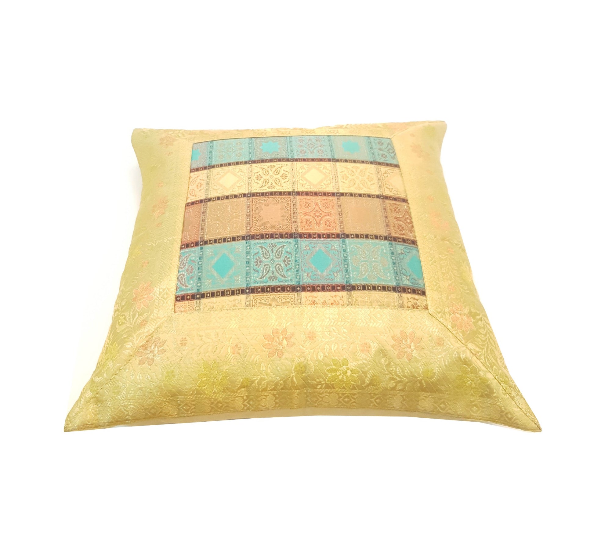 Banarasi Vastra Presents Indian Art Silk Woven Zari Brocade Banarasi Cushion Pillow Cover in Checks Pattern in the center Part of the cover with all 4 Side Floral Zari Woven Border. this Cover comes with Matching color Back lining fabric with Hidden Zip which allow you to insert the Cushion Pillow. The base color of the cover is Multi-Color with Cream Border .