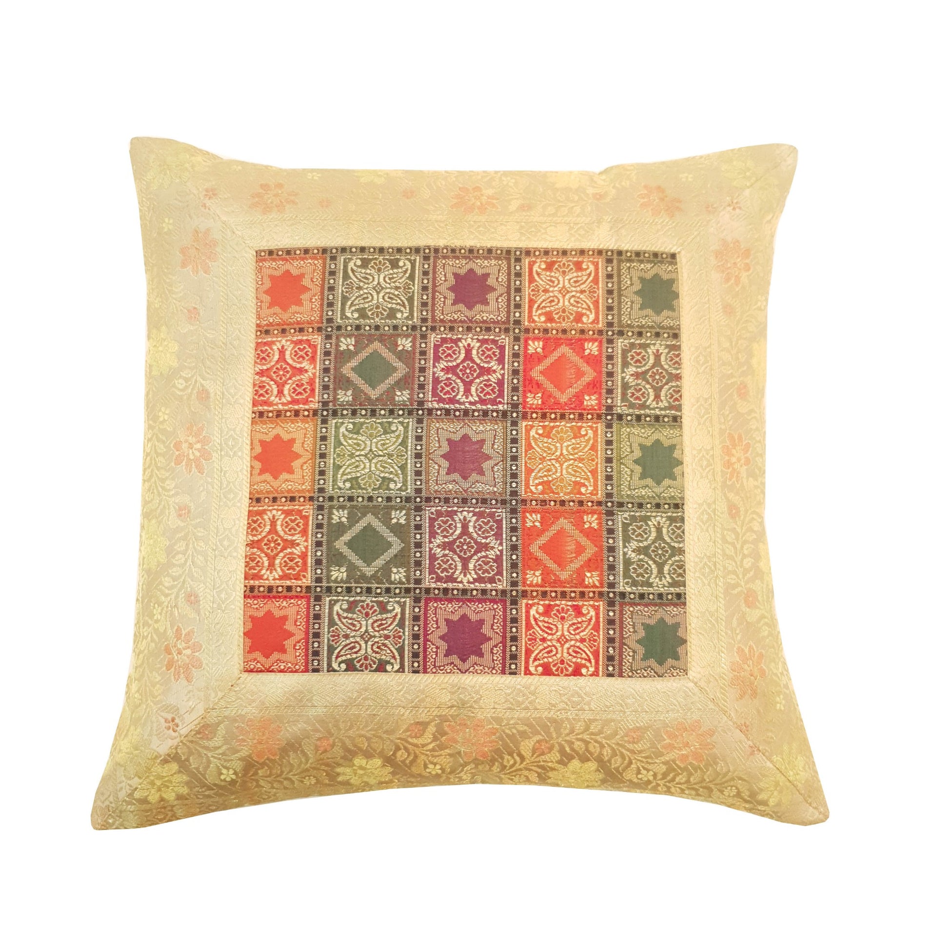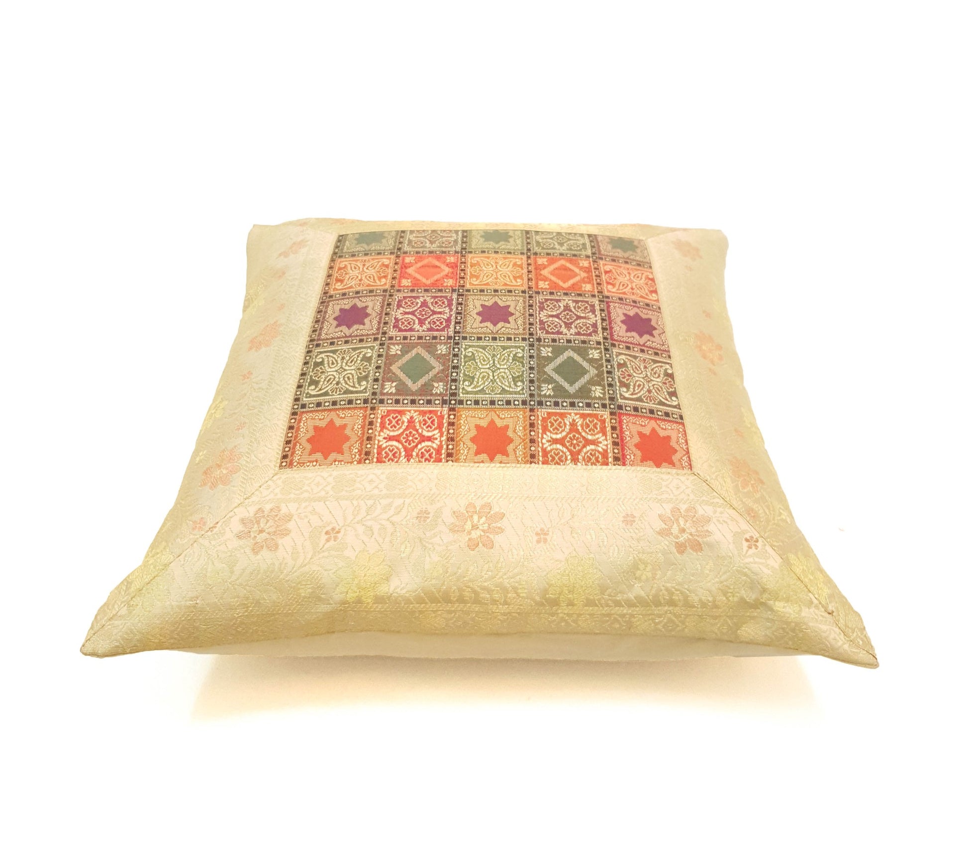 Banarasi Vastra Presents Indian Art Silk Woven Zari Brocade Banarasi Cushion Pillow Cover in Checks Pattern in the center Part of the cover with all 4 Side Floral Zari Woven Border. this Cover comes with Matching color Back lining fabric with Hidden Zip which allow you to insert the Cushion Pillow. The base color of the cover is Multi-Color with Cream Border .