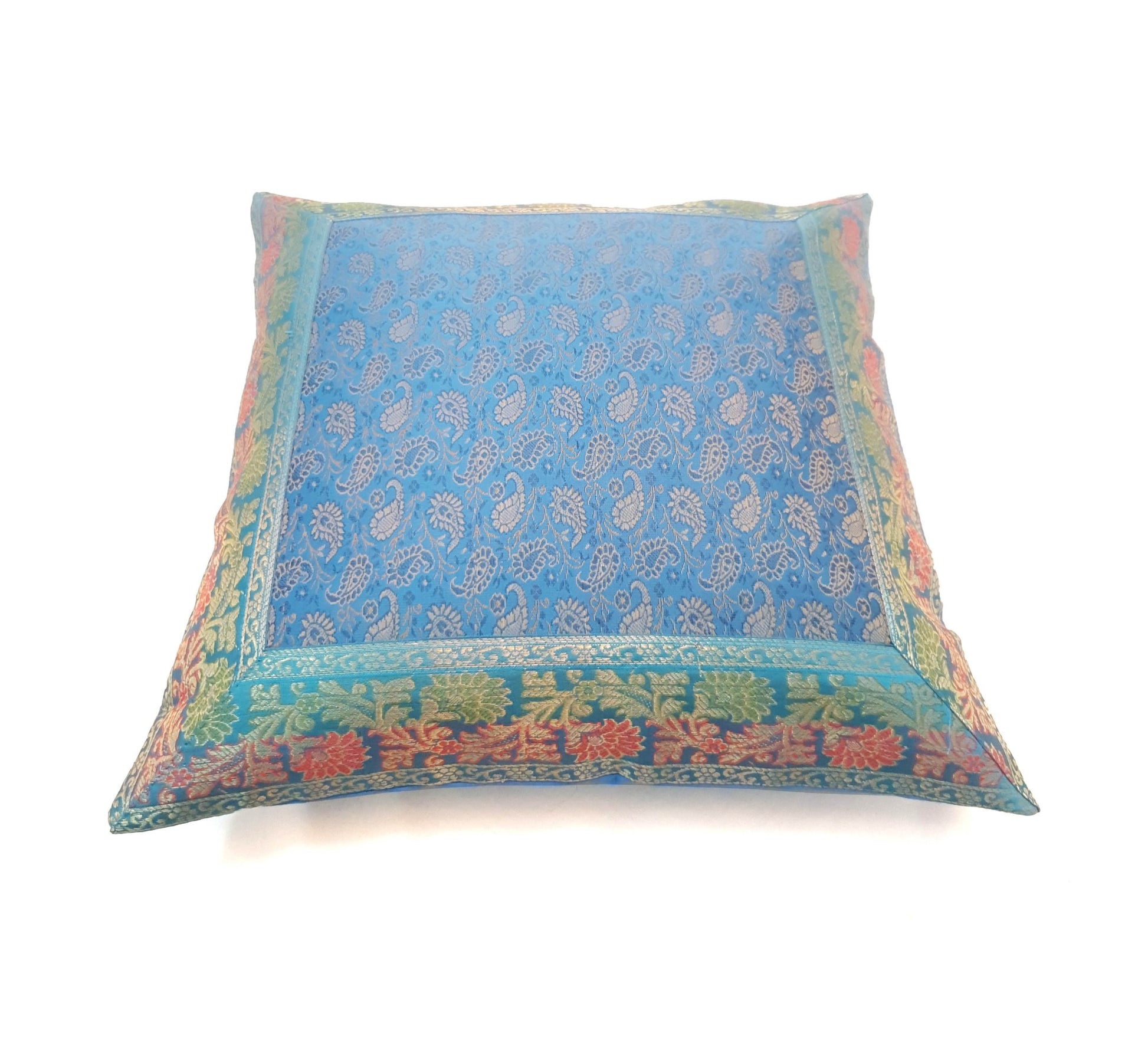 16X16 Inch Banarasi Turquoise Blue Zari Brocade Silk Paisley Cushion Covers