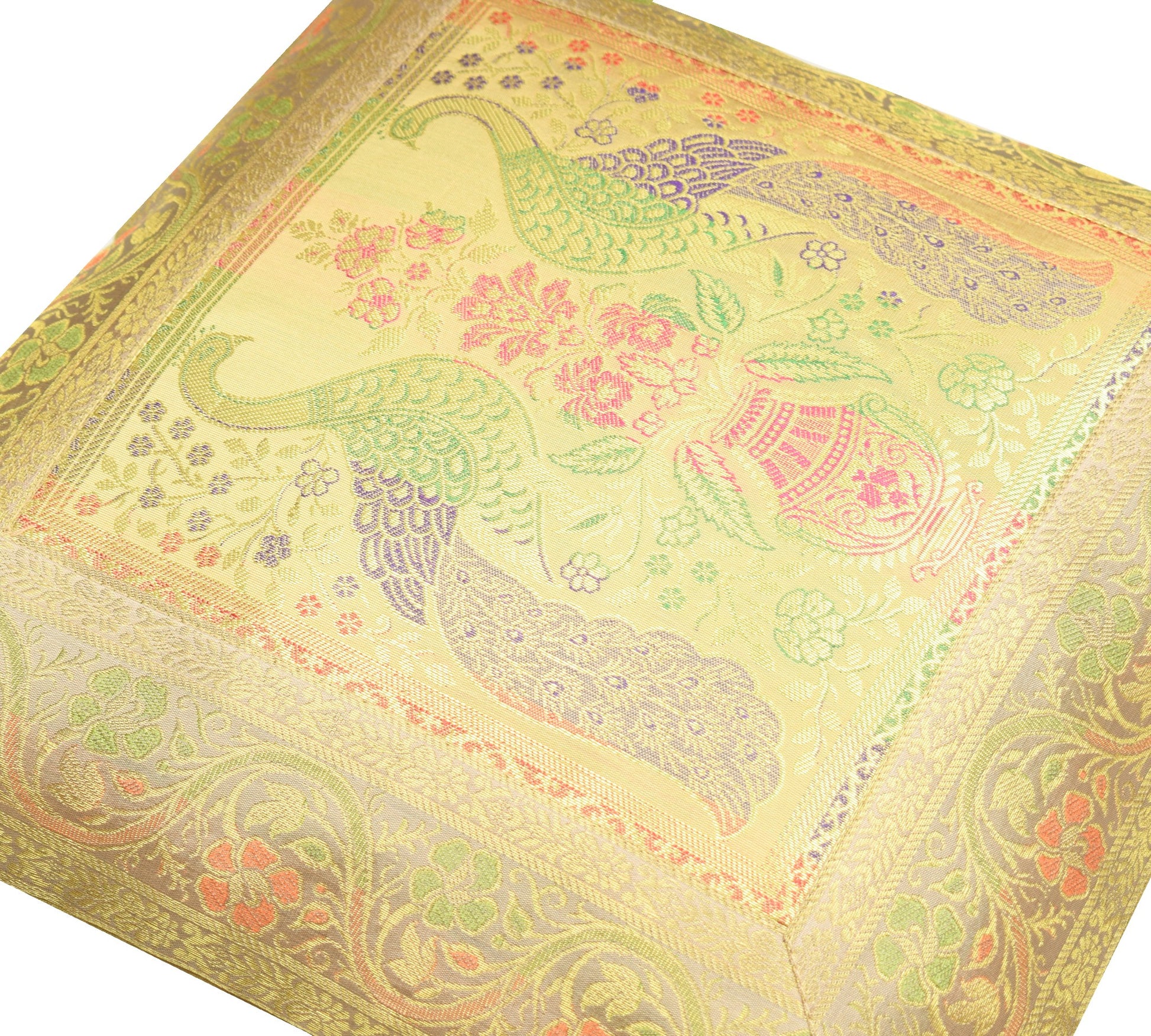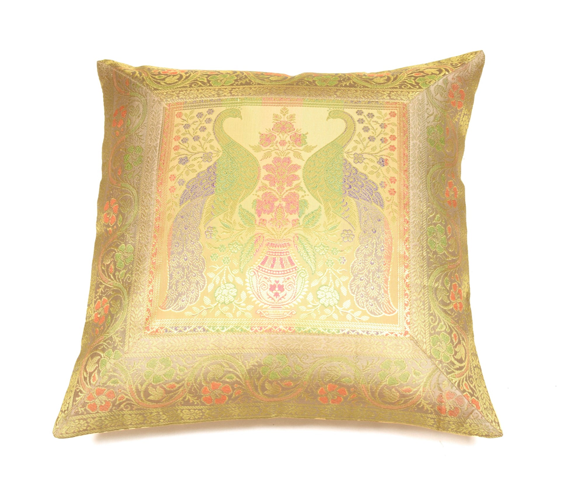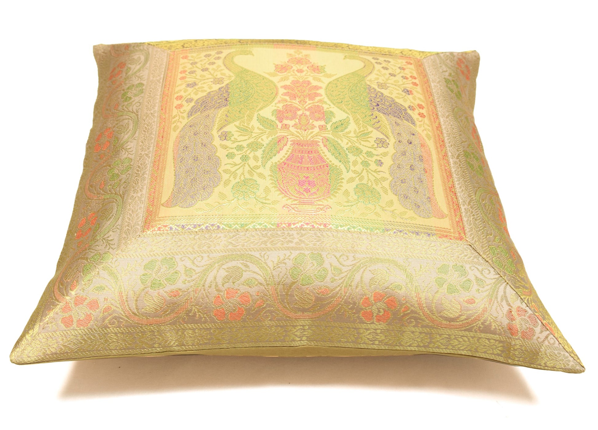 Banarasi Vastra Presents Indian Art Silk Woven Zari Brocade Banarasi Cushion Pillow Cover in Peacock Pattern in the centre Part of the cover with all 4 Side Floral Zari Woven Border. this Cover comes with Matching color Back lining fabric with Hidden Zip which allow you to insert the Cushion Pillow. The base color of the cover is Beige.