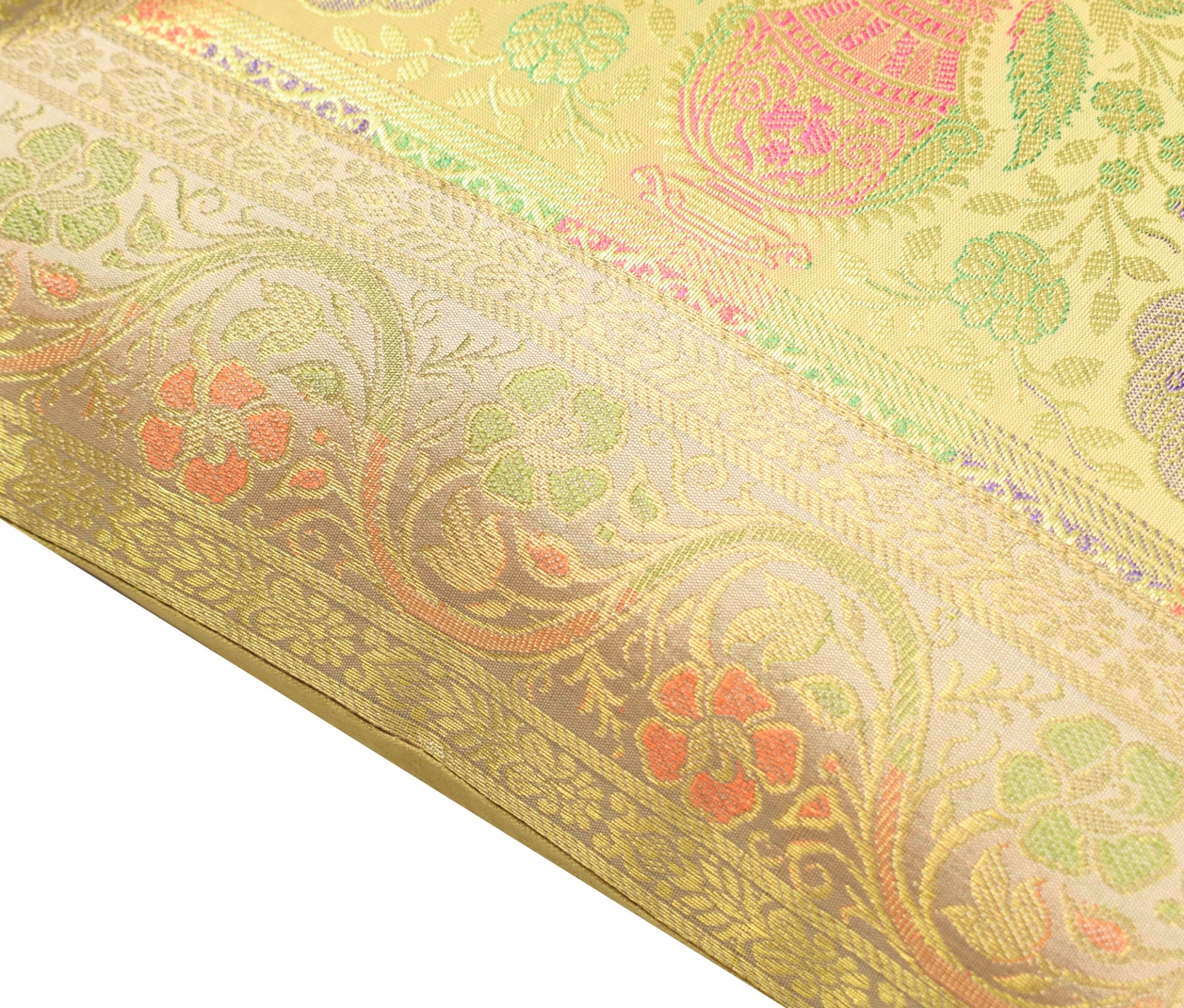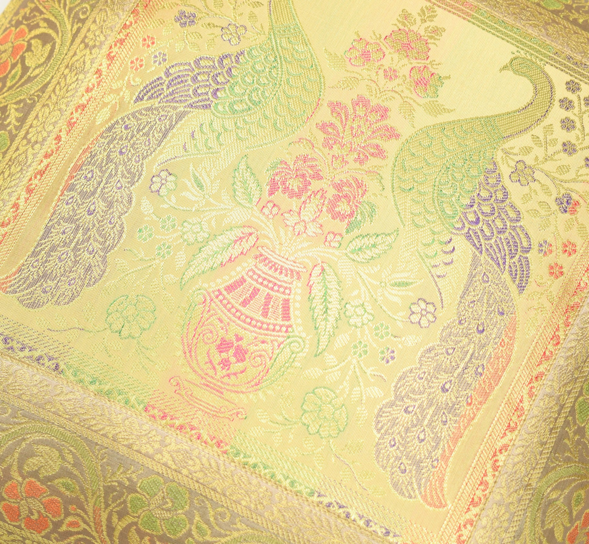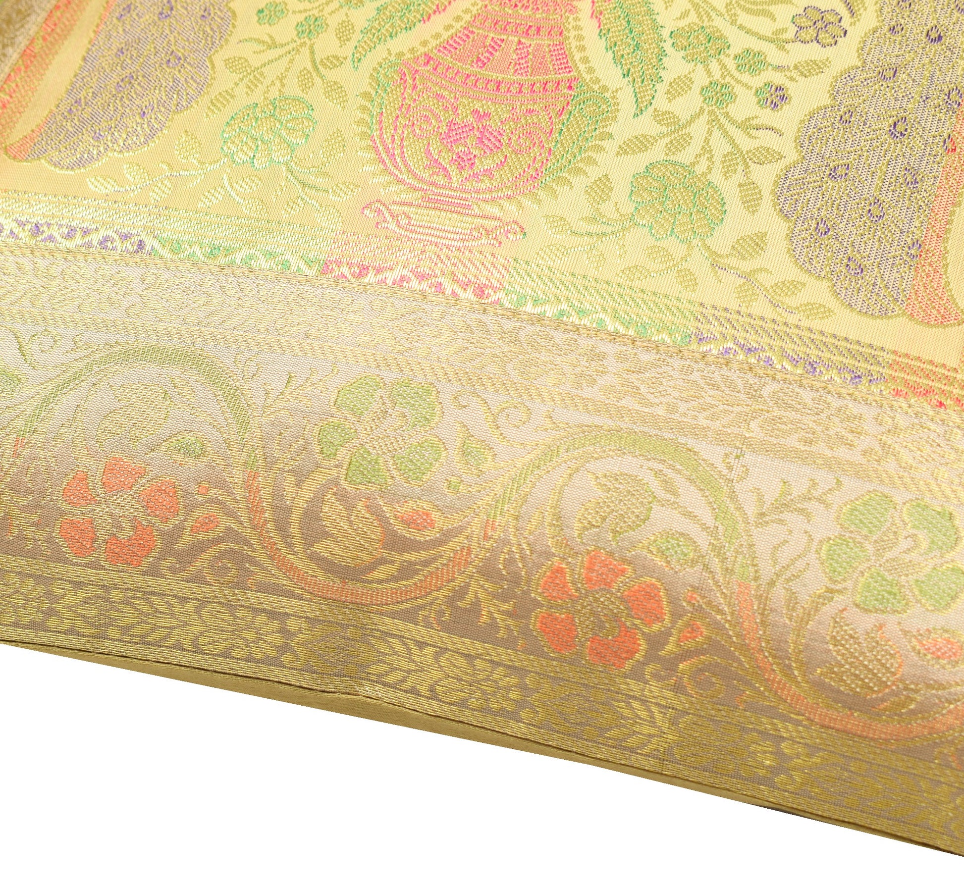 Banarasi Vastra Presents Indian Art Silk Woven Zari Brocade Banarasi Cushion Pillow Cover in Peacock Pattern in the centre Part of the cover with all 4 Side Floral Zari Woven Border. this Cover comes with Matching color Back lining fabric with Hidden Zip which allow you to insert the Cushion Pillow. The base color of the cover is Beige.