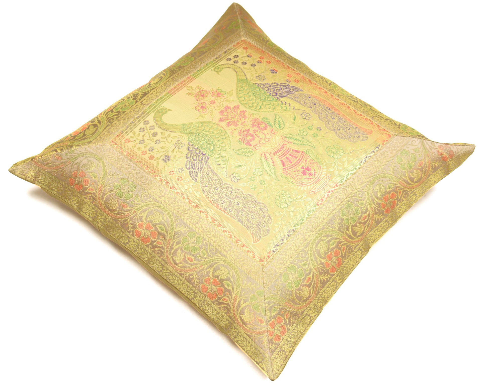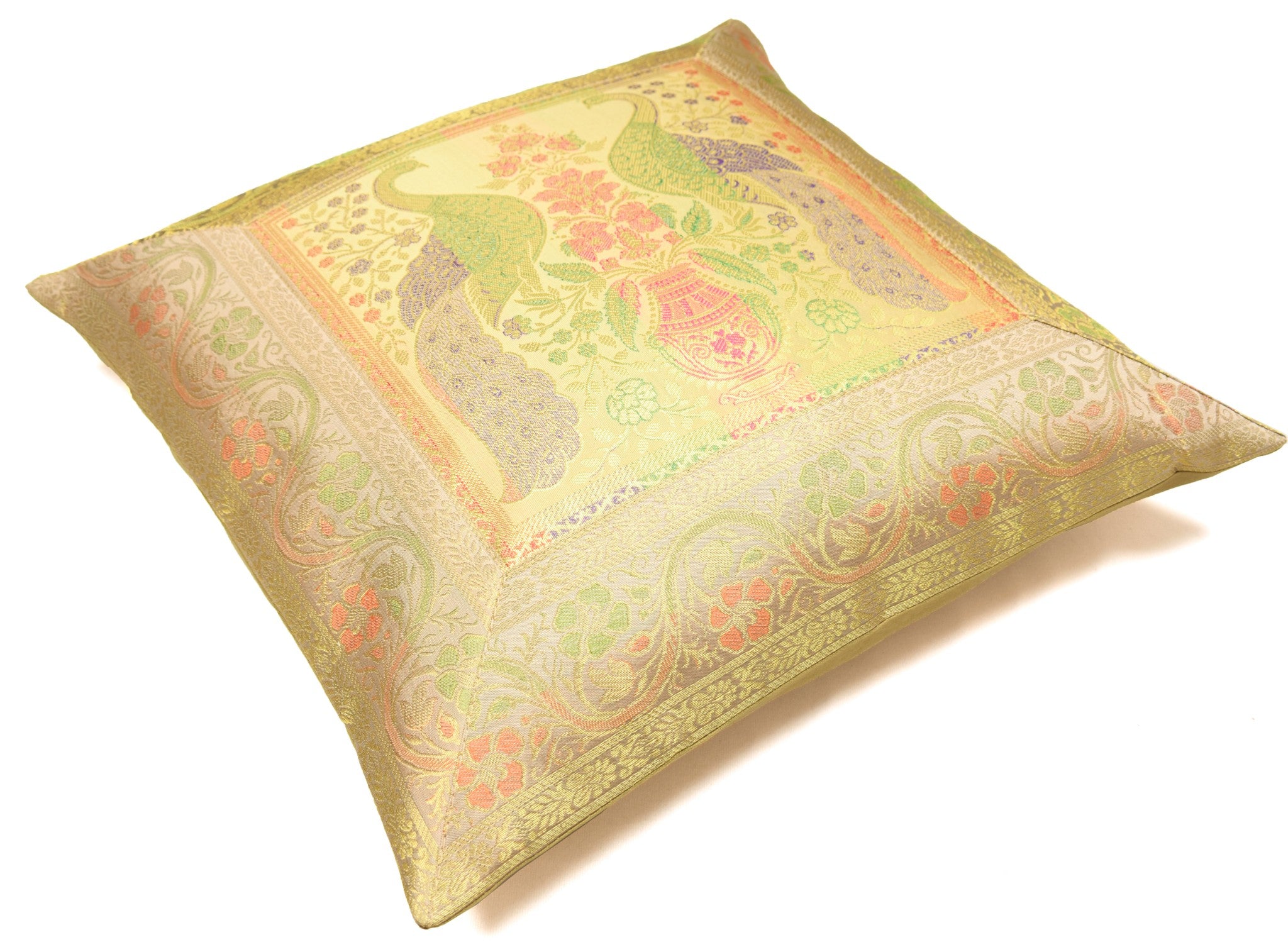 16x16 Inch Beige Cushion Covers Indian Woven Zari Brocade Banarasi Silk Peacock