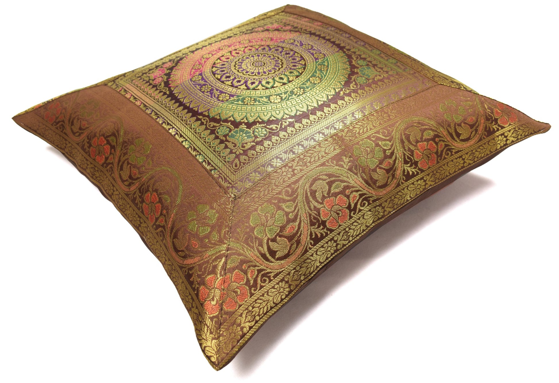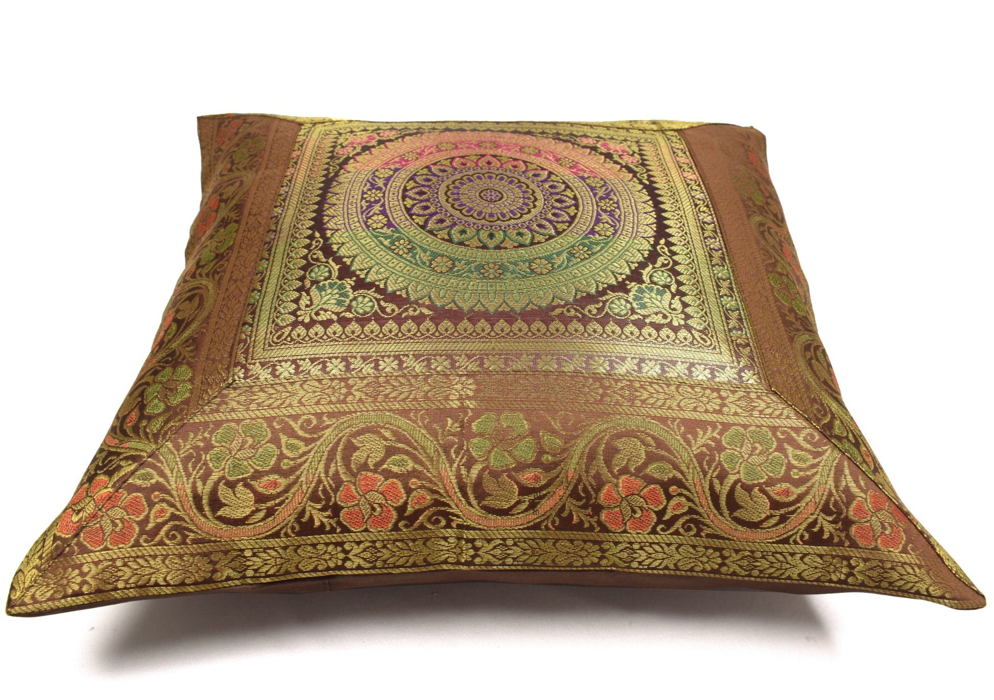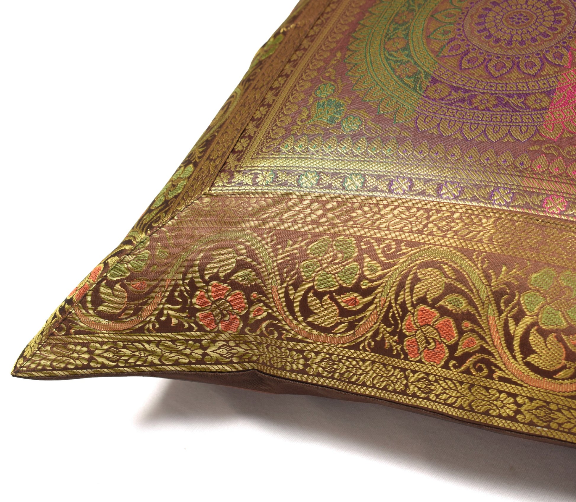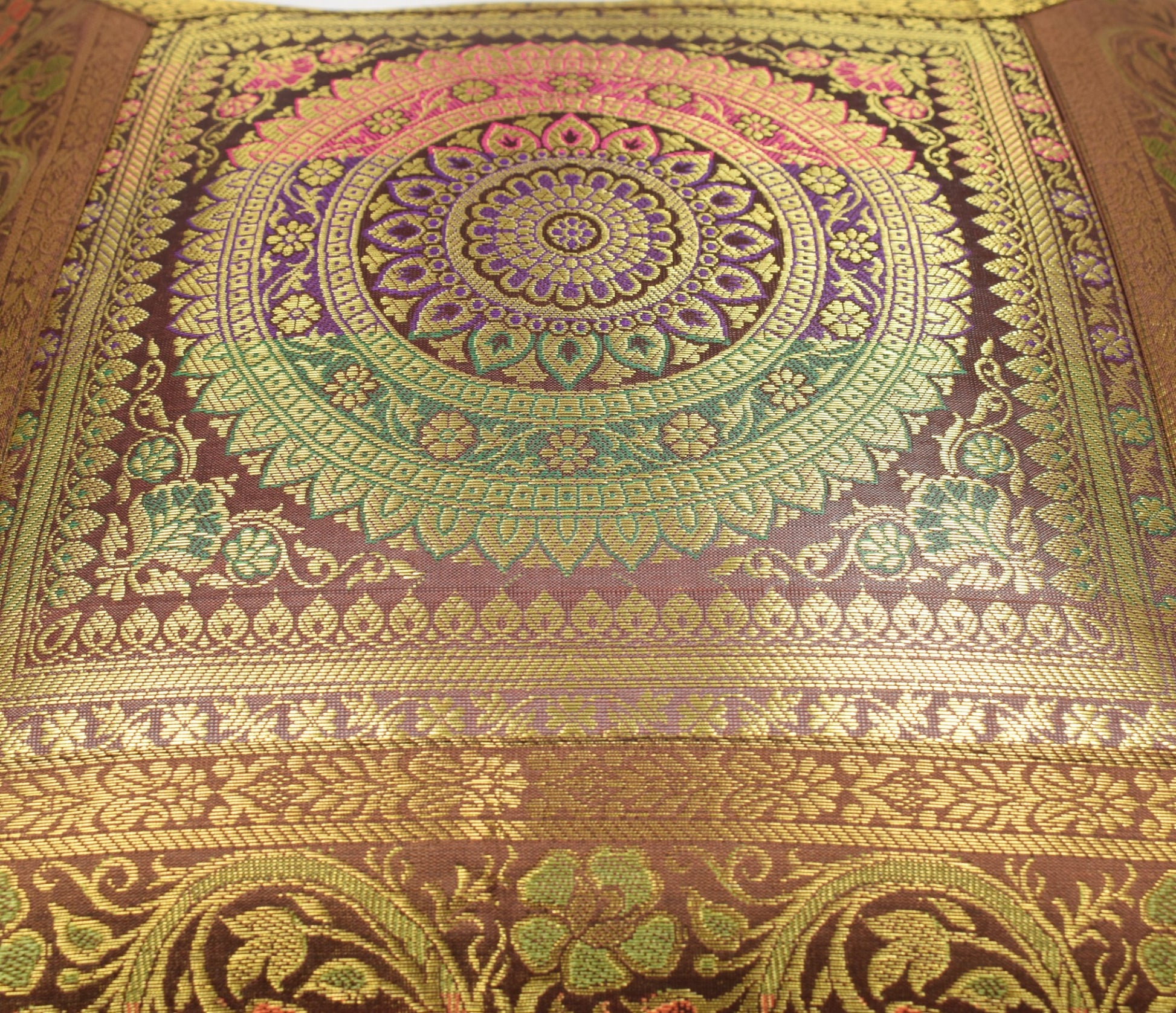 Banarasi Vastra Presents Indian Art Silk Woven Zari Brocade Banarasi Cushion Pillow Cover in Mandala Pattern in the centre Part of the cover with all 4 Side Floral Zari Woven Border. this Cover comes with Matching color Back lining fabric with Hidden Zip which allow you to insert the Cushion Pillow. The base color of the cover is Dark Brown.