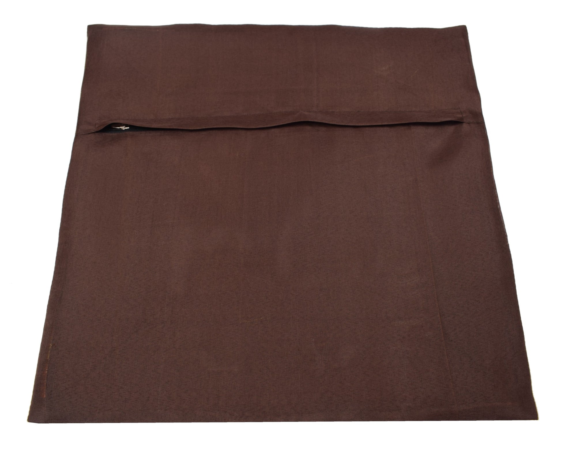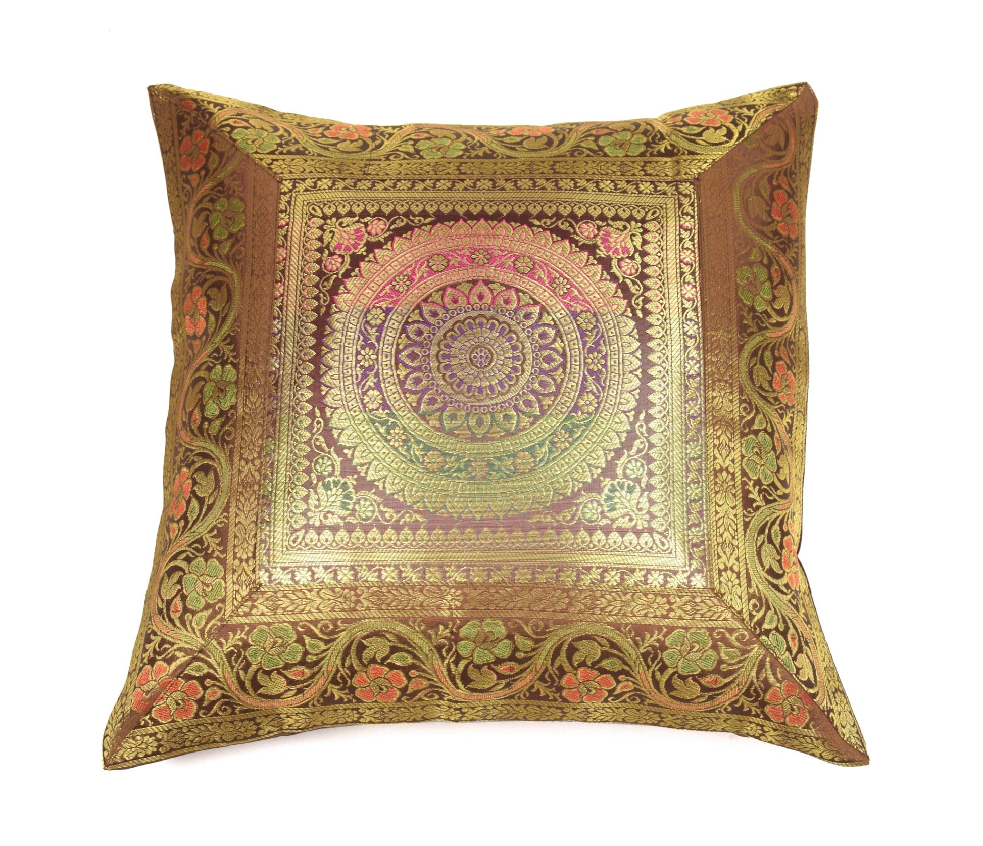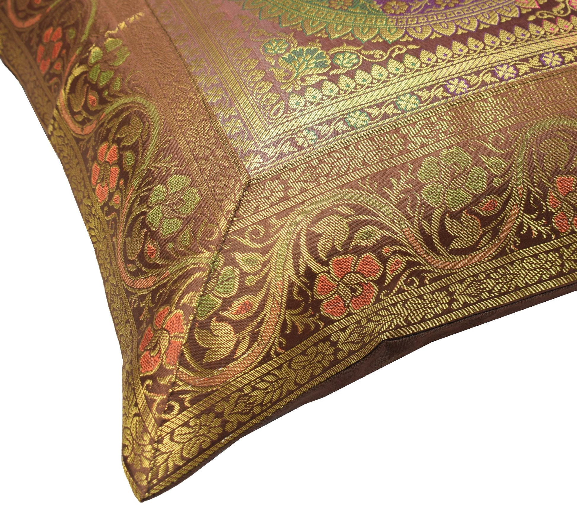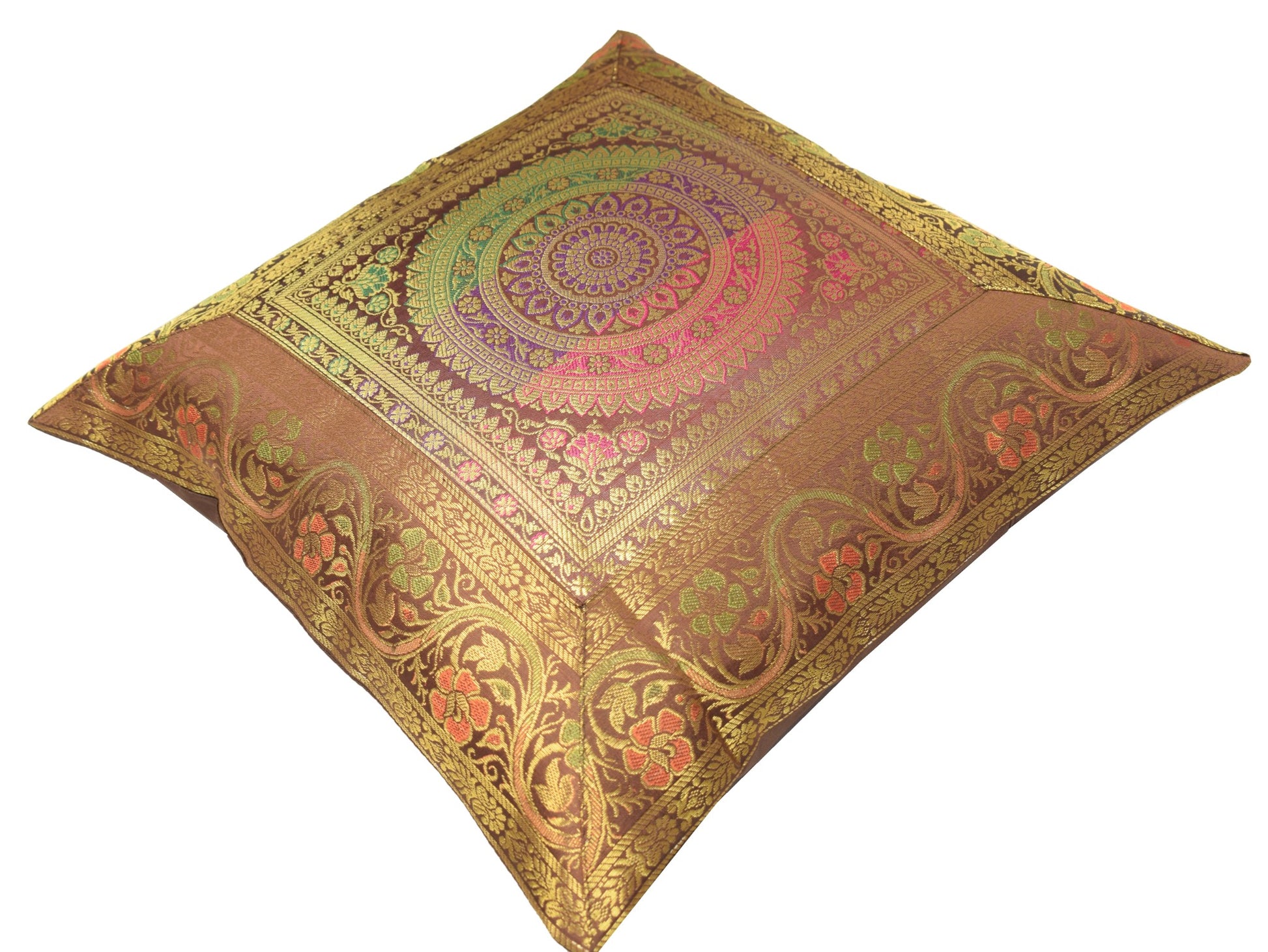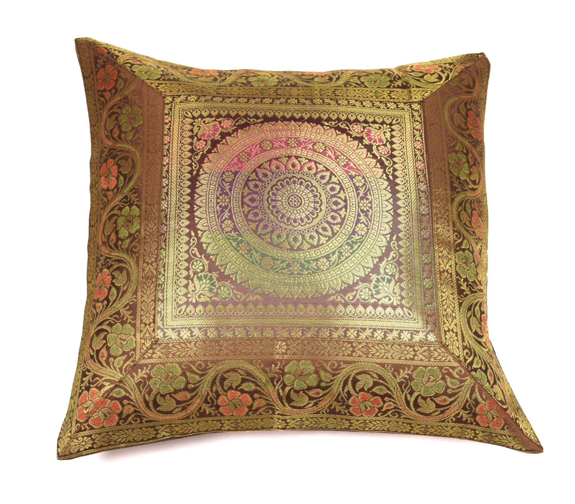 Banarasi Vastra Presents Indian Art Silk Woven Zari Brocade Banarasi Cushion Pillow Cover in Mandala Pattern in the centre Part of the cover with all 4 Side Floral Zari Woven Border. this Cover comes with Matching color Back lining fabric with Hidden Zip which allow you to insert the Cushion Pillow. The base color of the cover is Dark Brown.