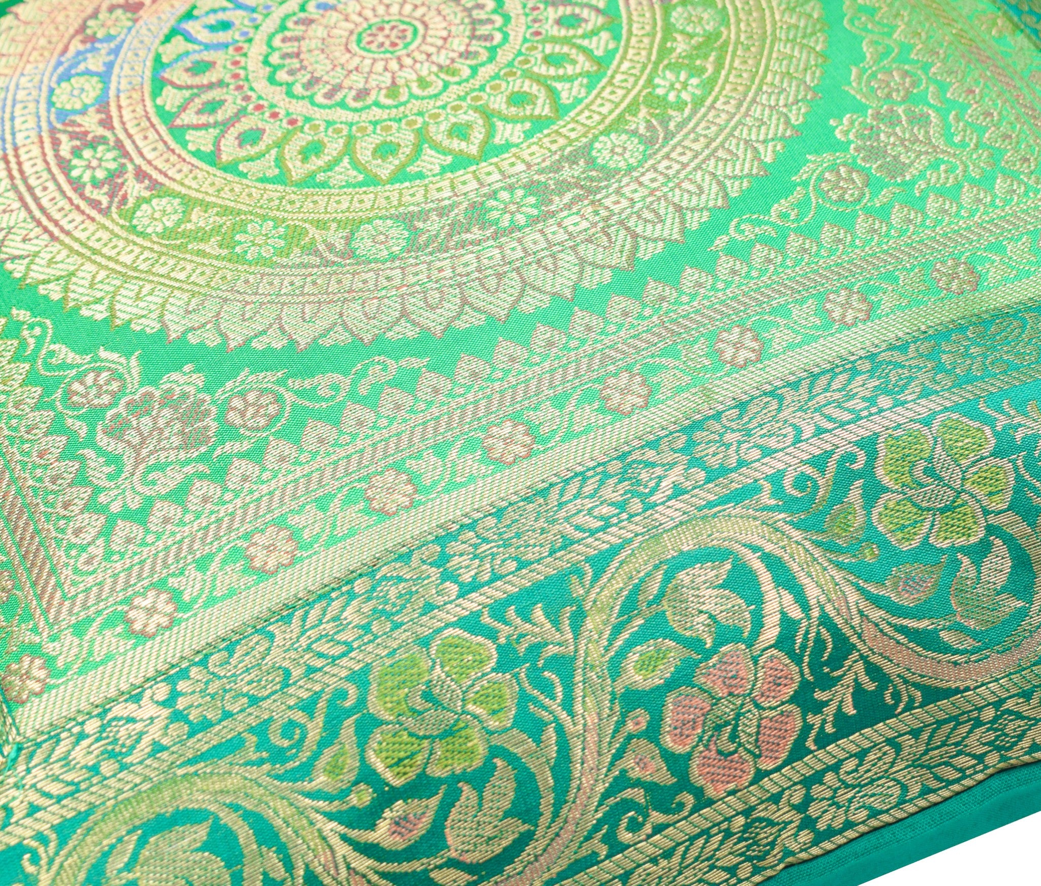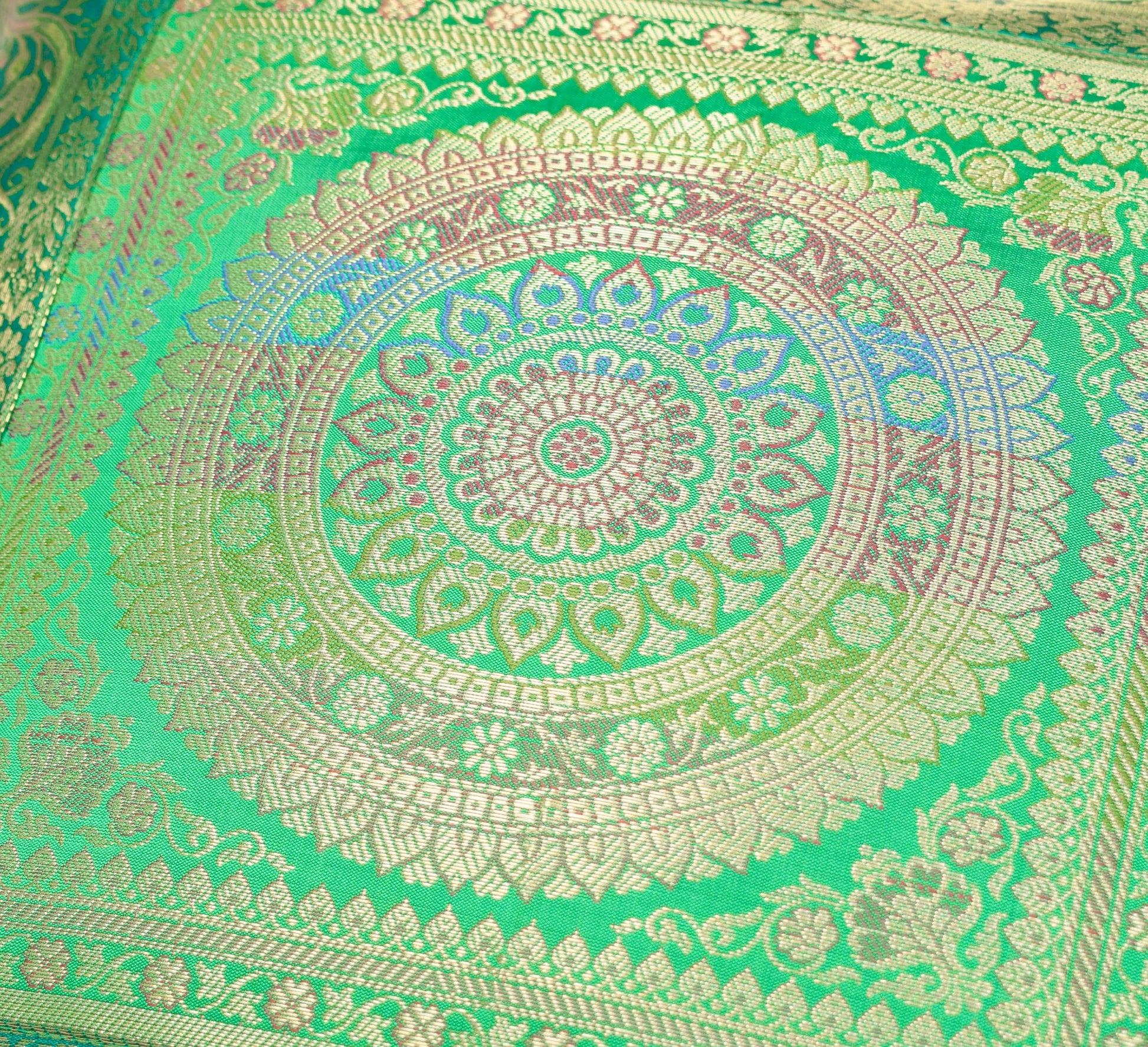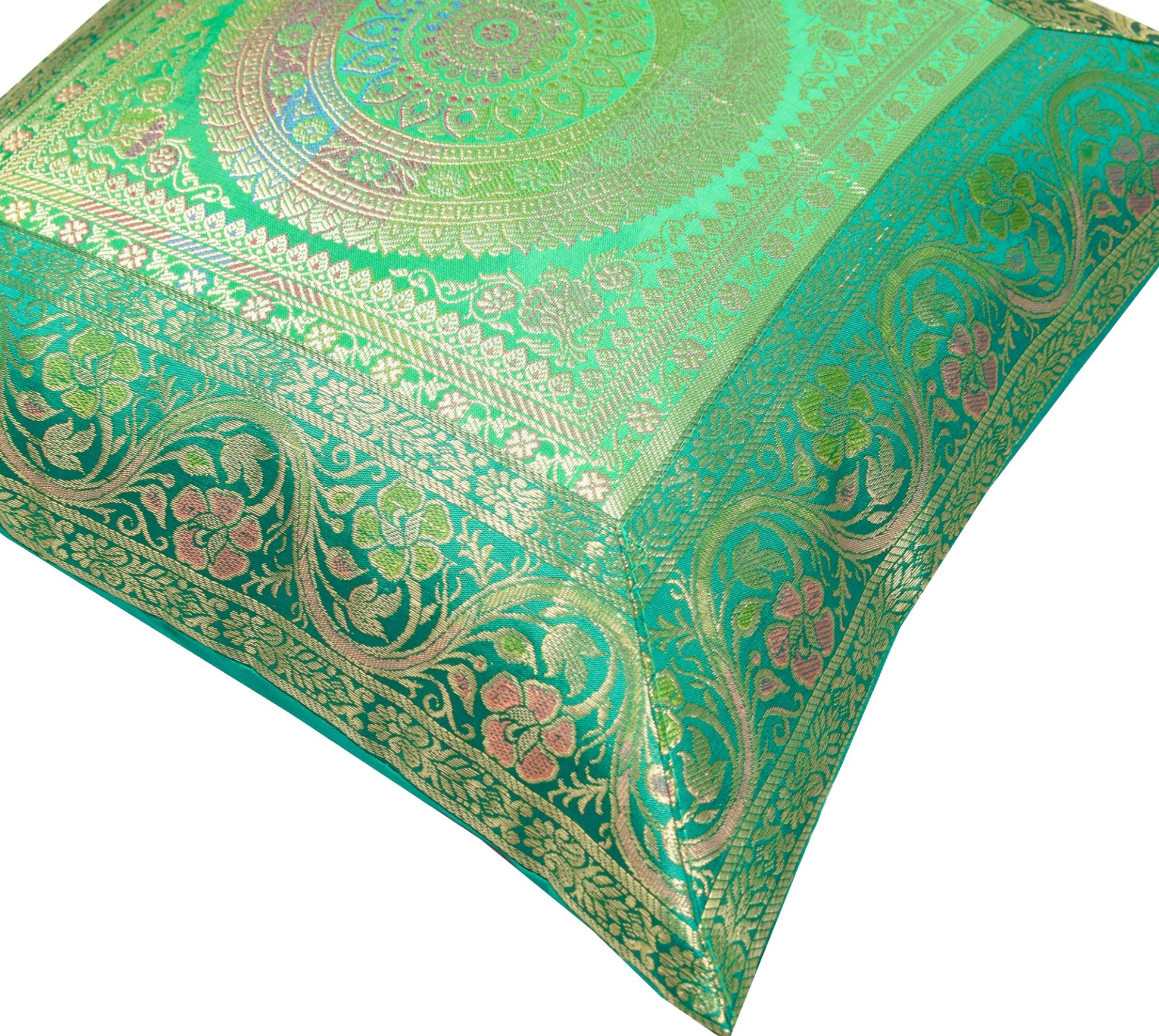 16x16 Inch Green Banarasi Silk Cushion Cover with Woven Zari Brocade and Mandala