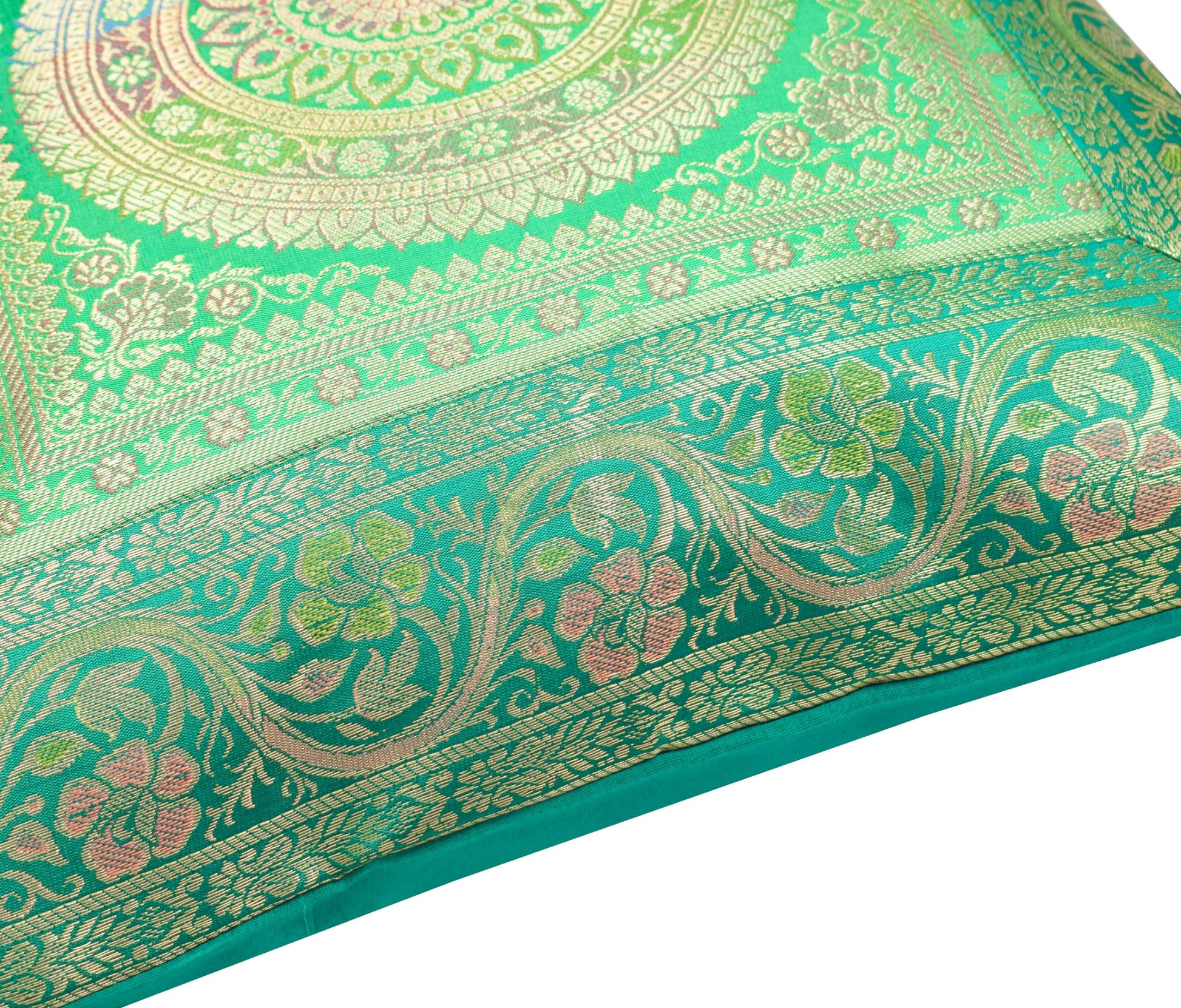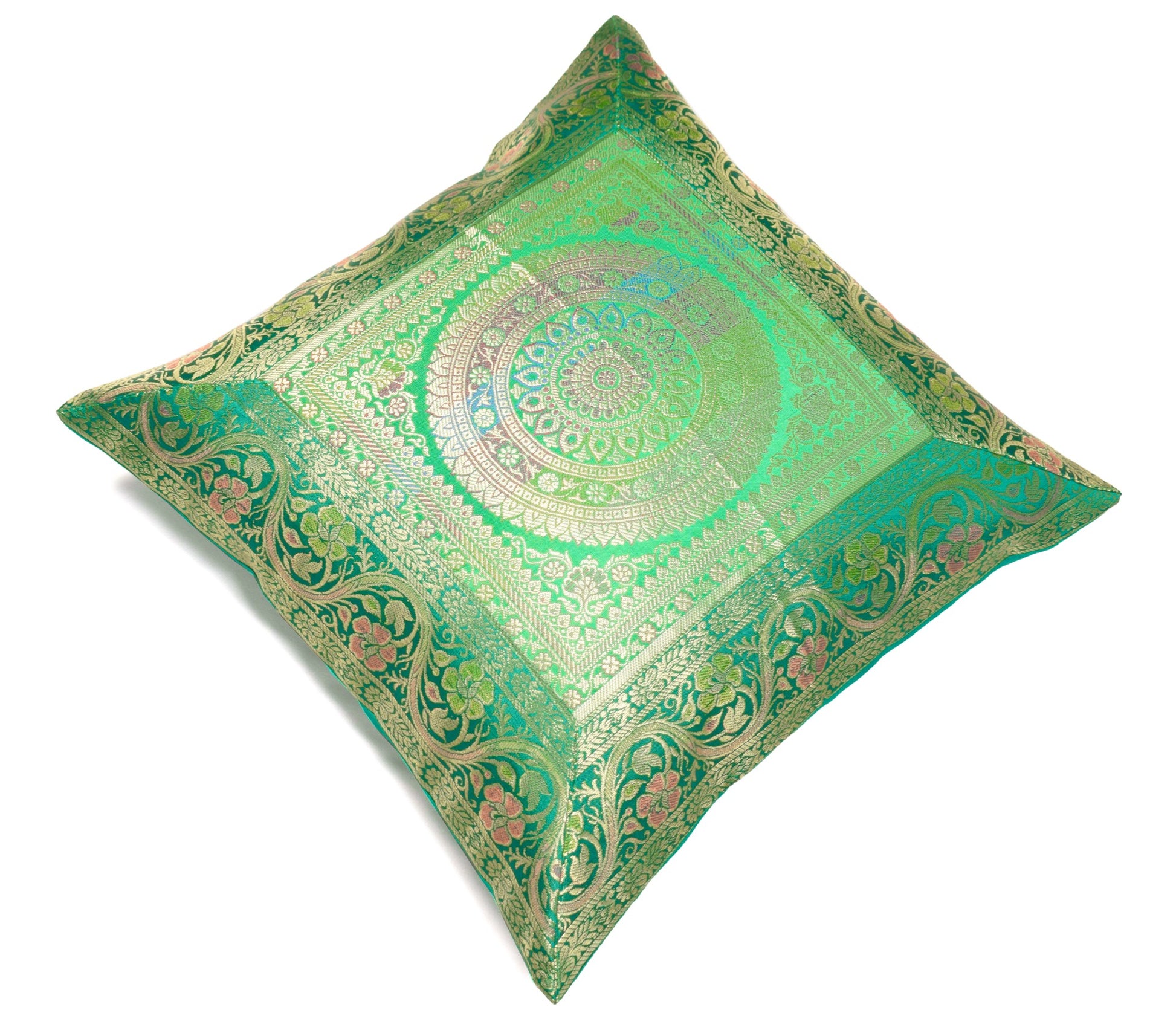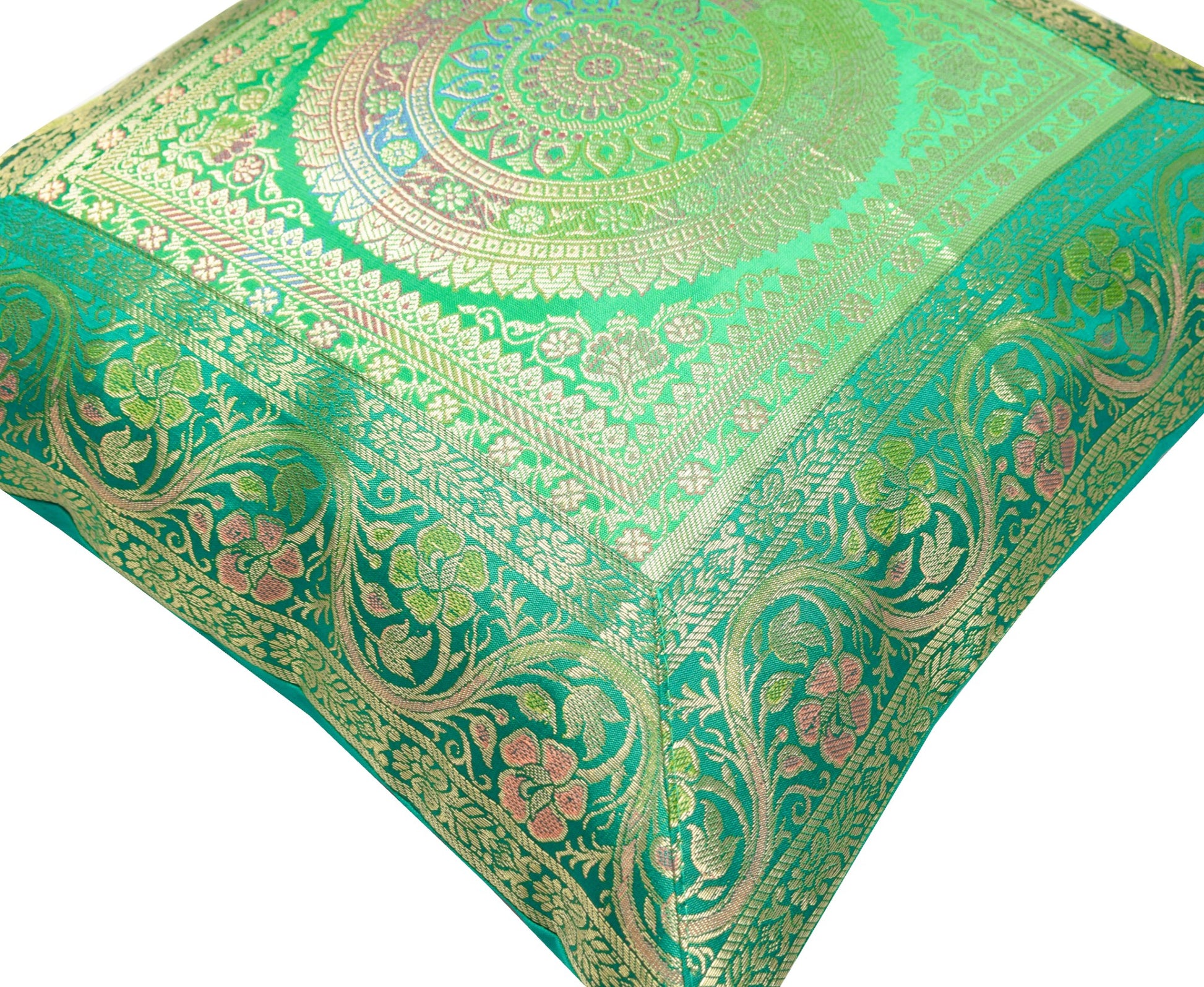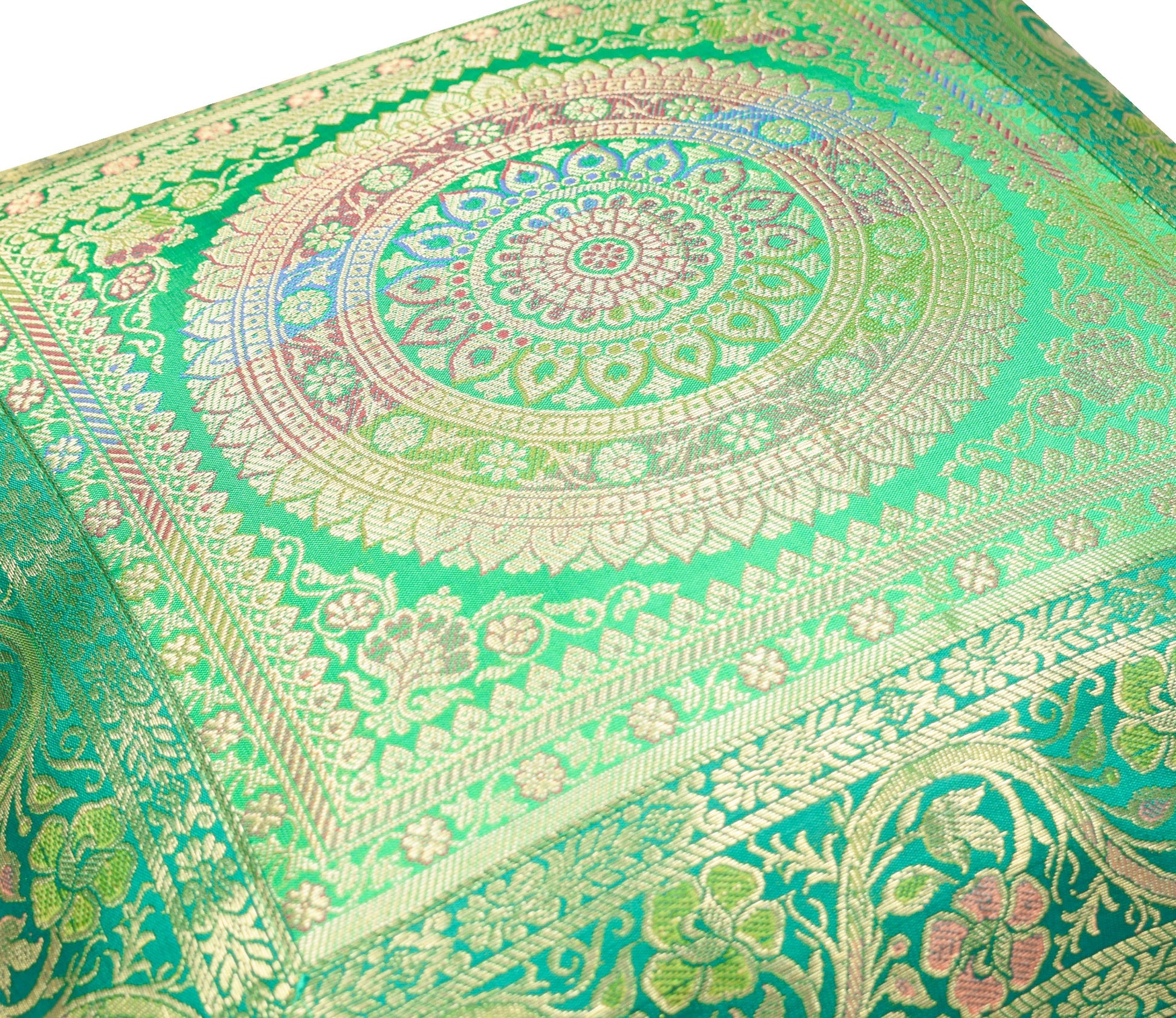 16x16 Inch Green Banarasi Silk Cushion Cover with Woven Zari Brocade and Mandala