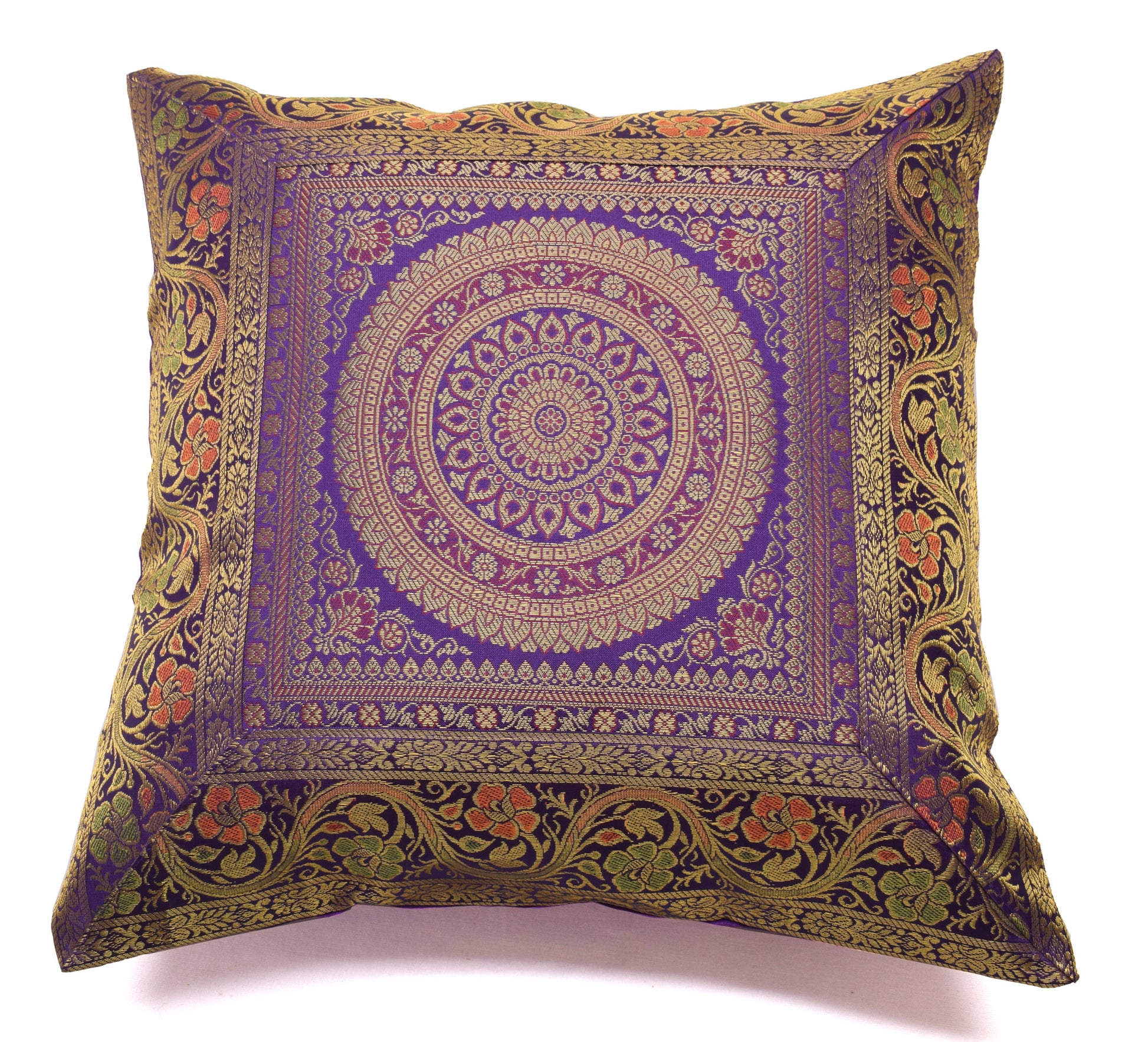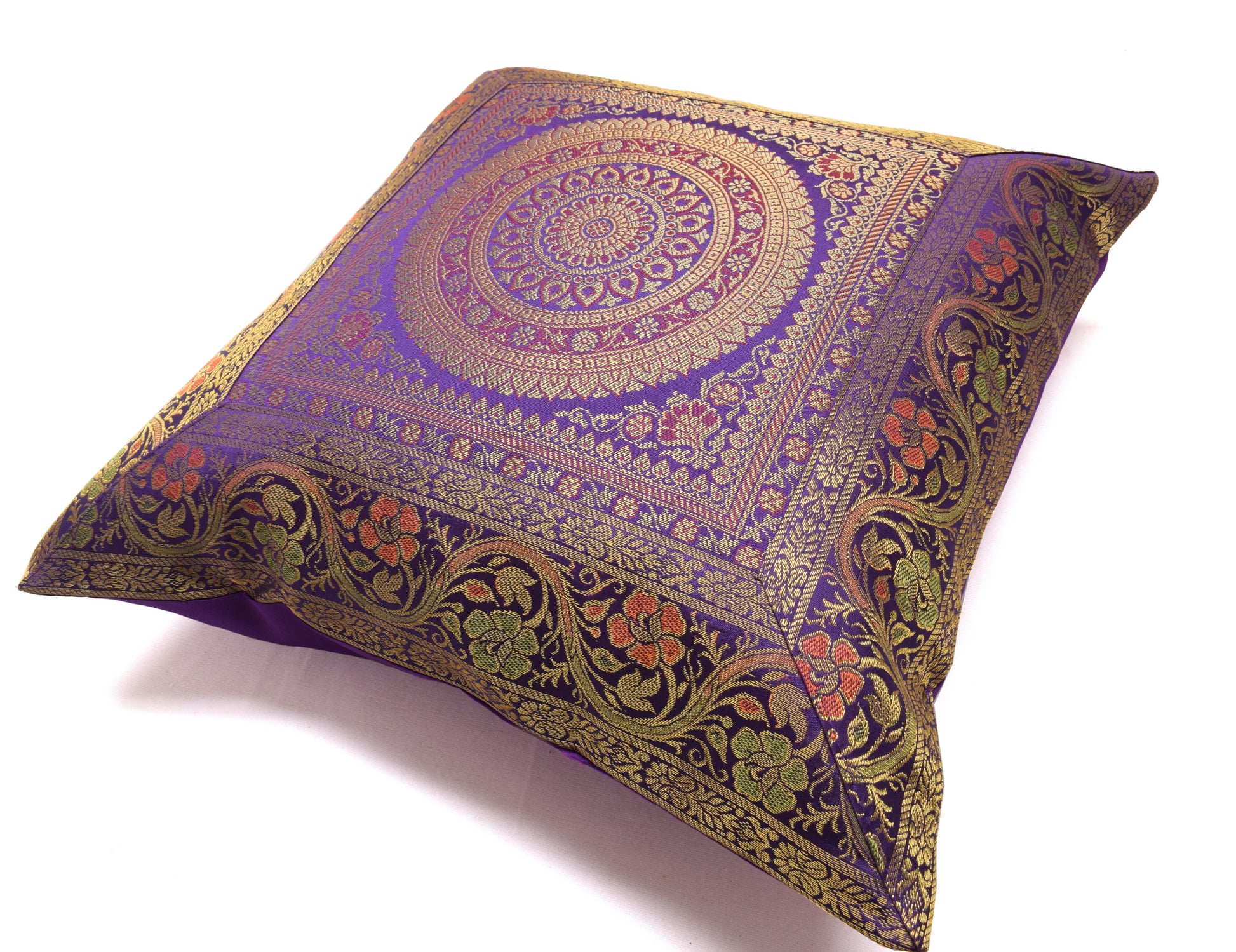 16x16 Inch Indian Woven Zari Brocade Banarasi Silk Mandala Cushion Covers Purple