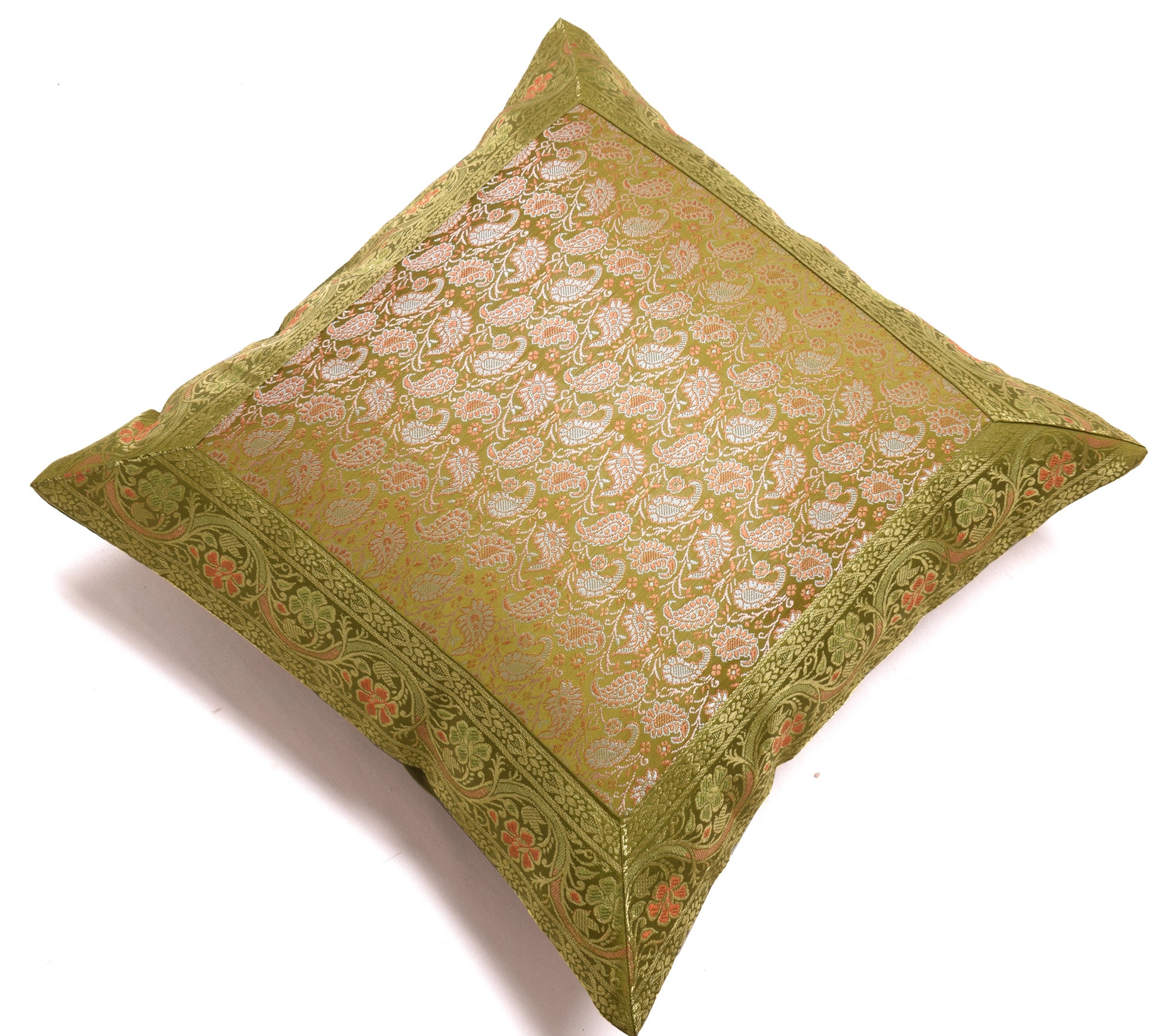 16x16 Inch Indian Woven Zari Brocade Banarasi Silk Paisley Cushion Covers Green