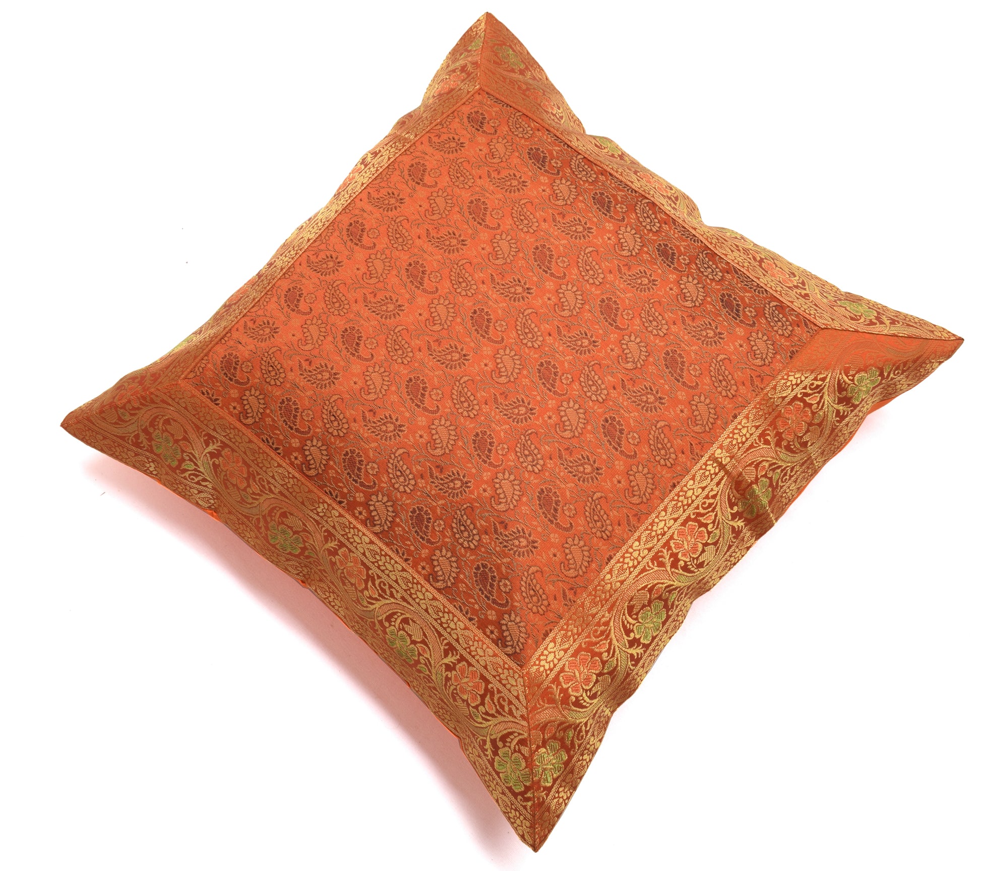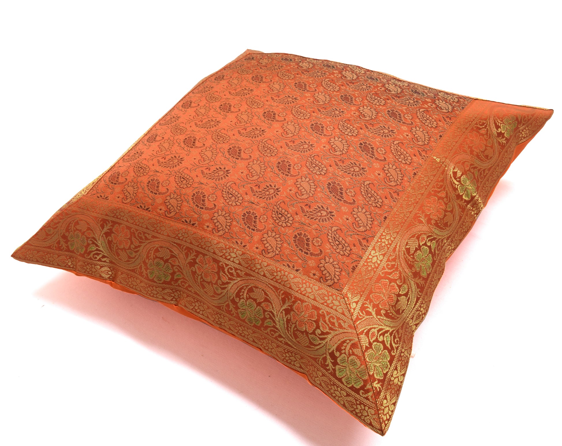 Banarasi Vastra Presents Indian Art Silk Woven Zari Brocade Banarasi Cushion Pillow Cover in Paisley Pattern in the centre Part of the cover with all 4 Side Floral Zari Woven Border. this Cover comes with Matching color Back lining fabric with Hidden Zip which allow you to insert the Cushion Pillow. The base color of the cover is Maroon.