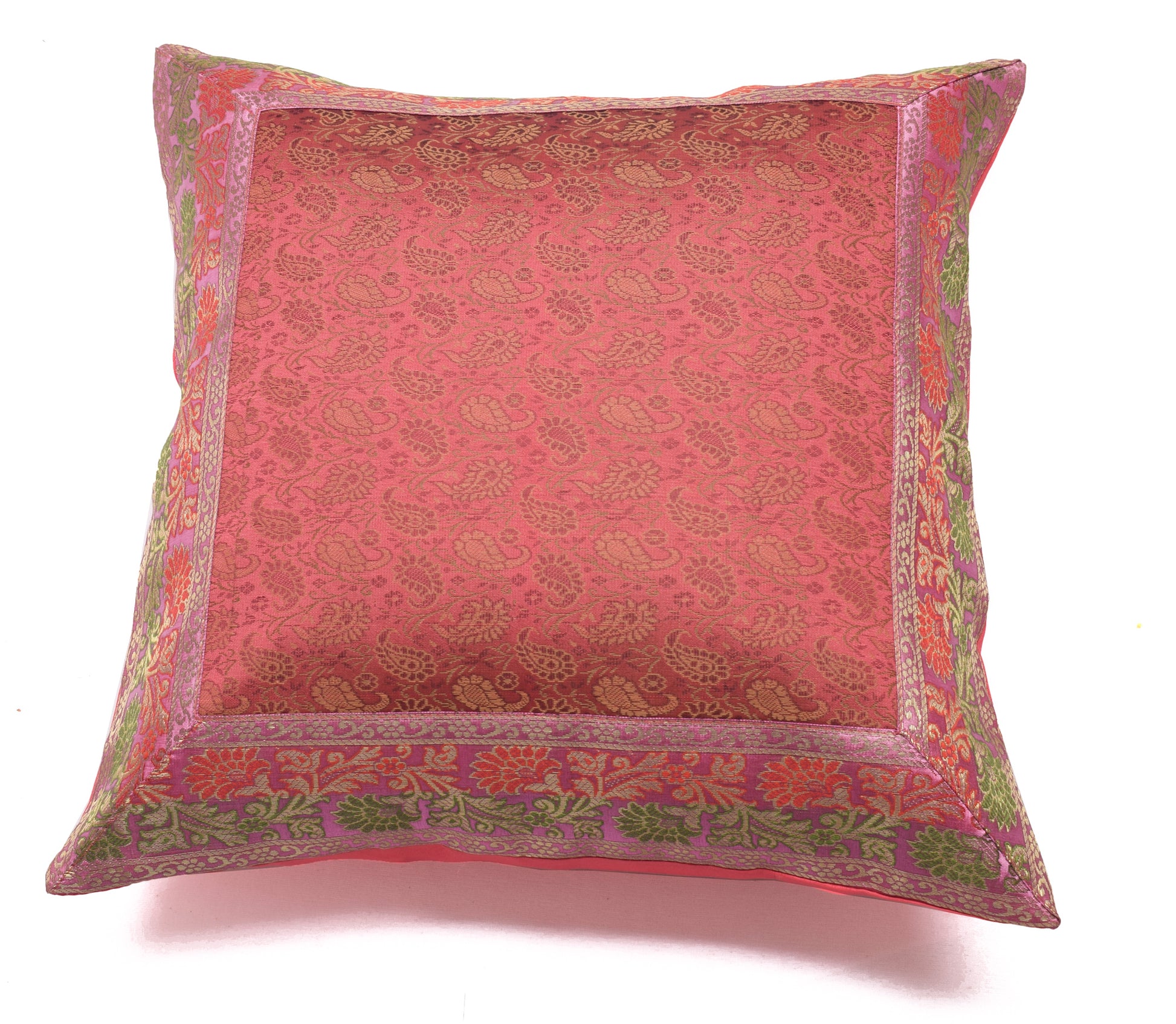 16x16 Inch Indian Woven Zari Brocade Banarasi Silk Paisley Cushion Covers Pink
