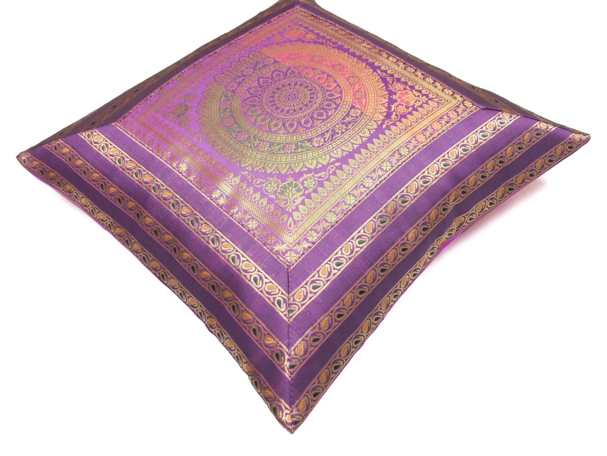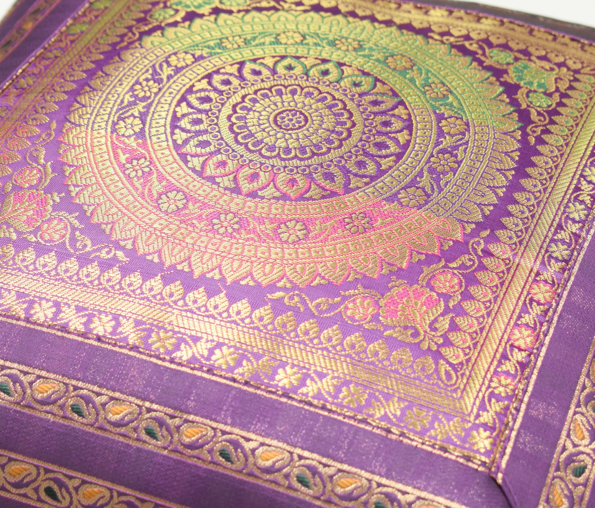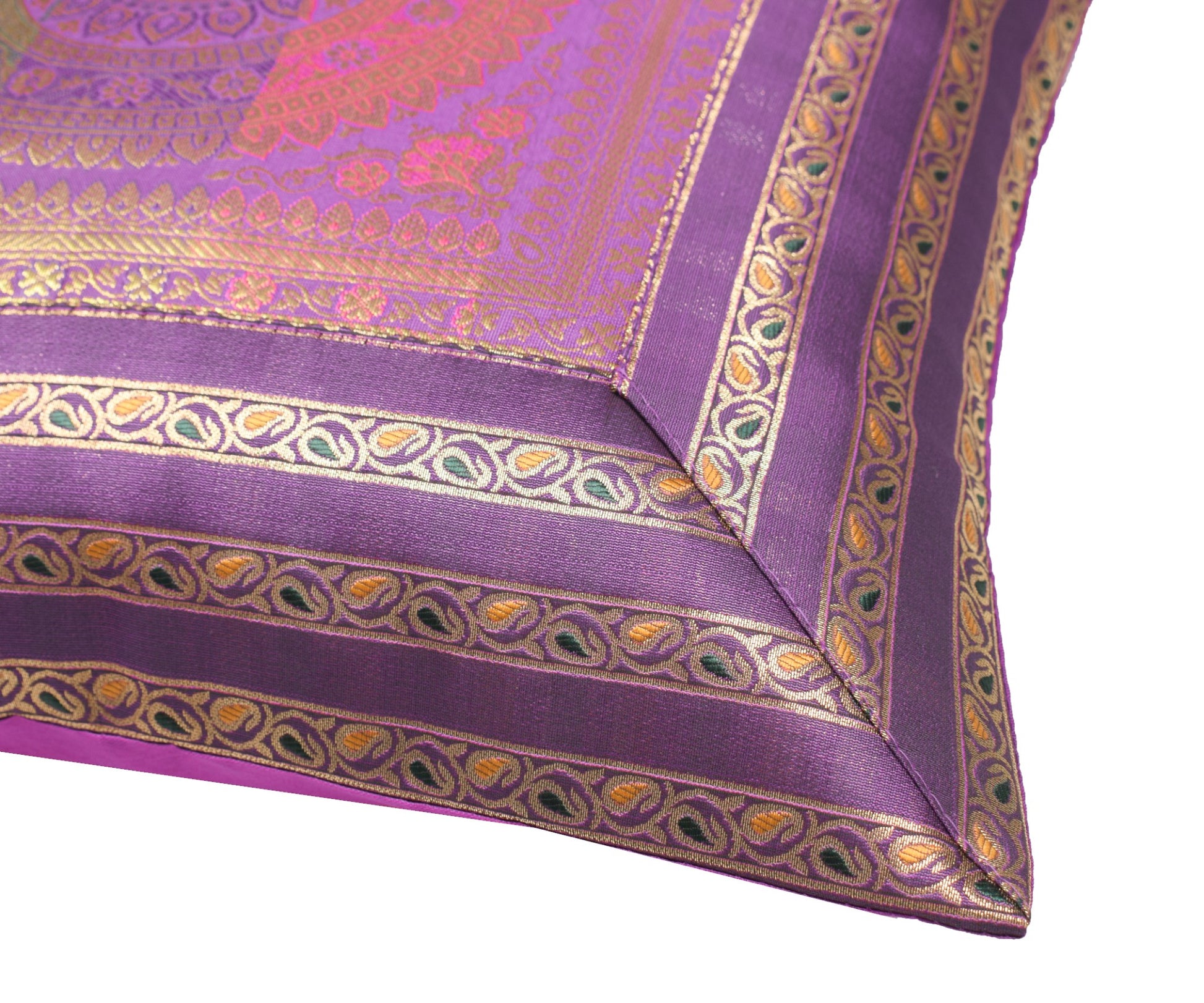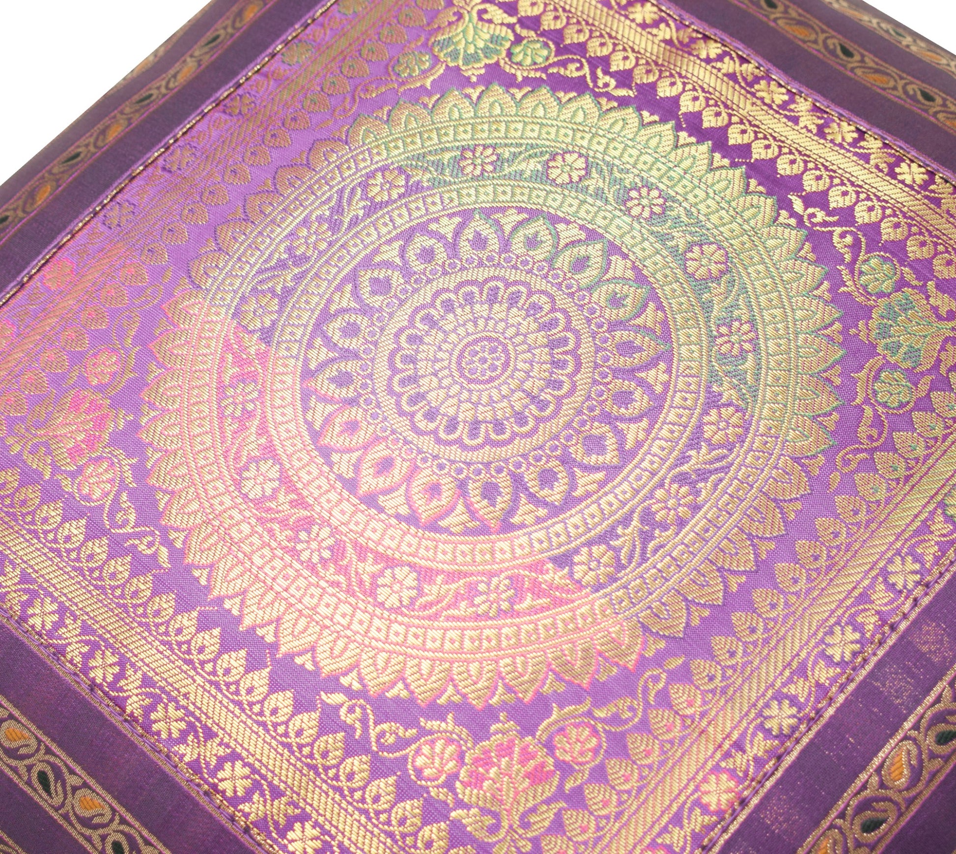 Banarasi Vastra Presents Indian Art Silk Woven Zari Brocade Banarasi Cushion Pillow Cover in Mandala Pattern in the center Part of the cover with all 4 Side Paisley Zari Woven Border. this Cover comes with Matching color Back lining fabric with Hidden Zip which allow you to insert the Cushion Pillow. The base color of the cover is Purple.
