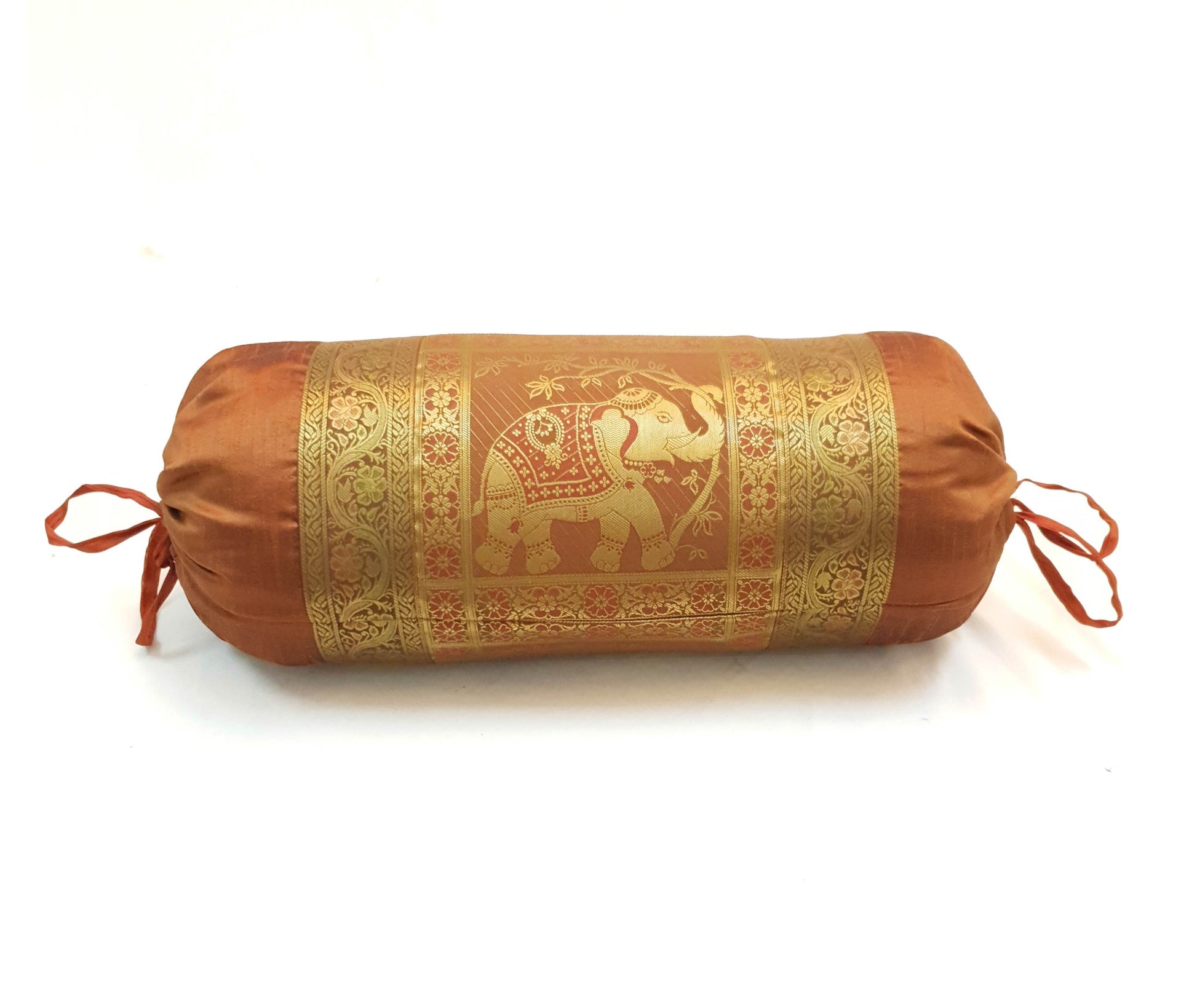 Banarasi Vastra Presents Indian Art Silk Woven Zari Brocade Banarasi Bolster Cover in Elephant Pattern . this Cover comes with Matching color Back lining fabric with Hidden Drawstring which allow you to insert the Bolster Pillow. The base color of the cover is Brown.