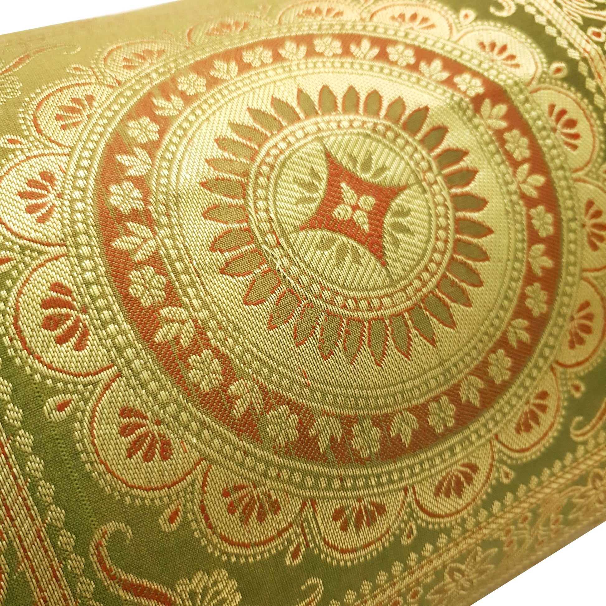Banarasi Vastra Presents Indian Art Silk Woven Zari Brocade Banarasi Bolster Cover in Mandala Pattern . this Cover comes with Matching color Back lining fabric with Hidden Drawstring which allow you to insert the Bolster Pillow. The base color of the cover is Green.