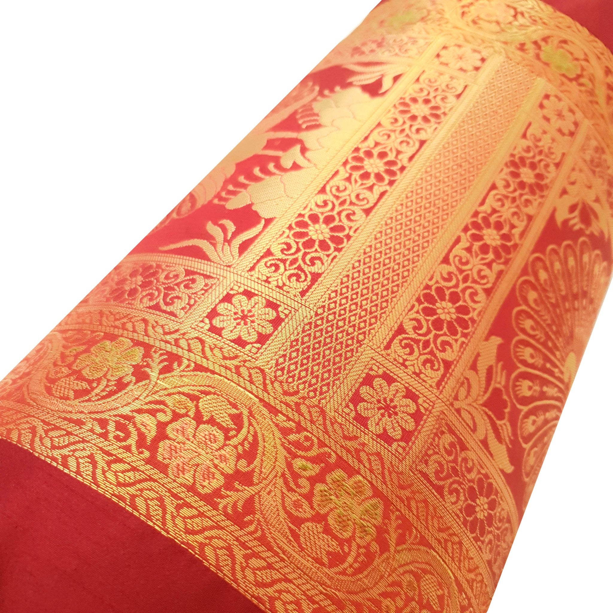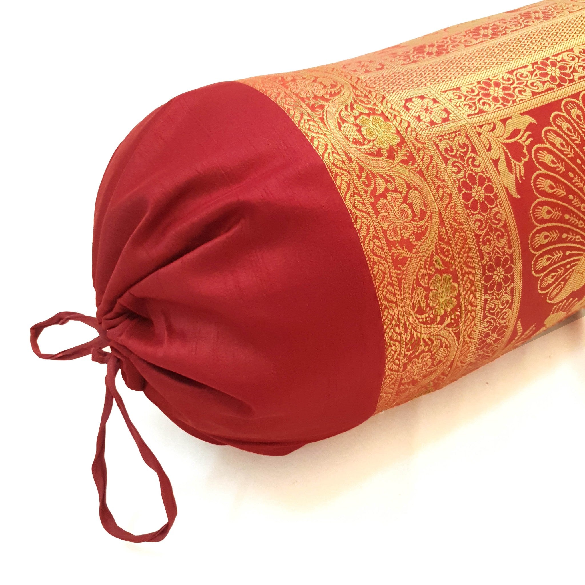 Banarasi Vastra Presents Indian Art Silk Woven Zari Brocade Banarasi Bolster Cover in Peacock Pattern . this Cover comes with Matching color Back lining fabric with Hidden Drawstring which allow you to insert the Bolster Pillow. The base color of the cover is Maroon.