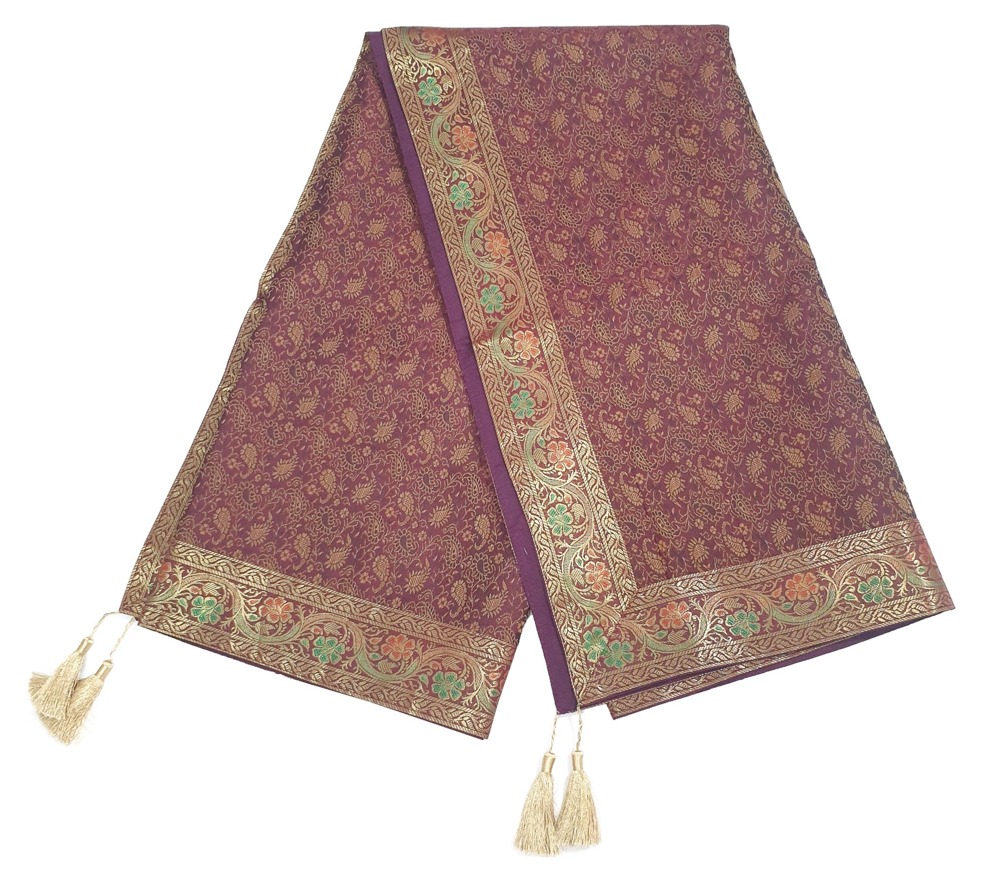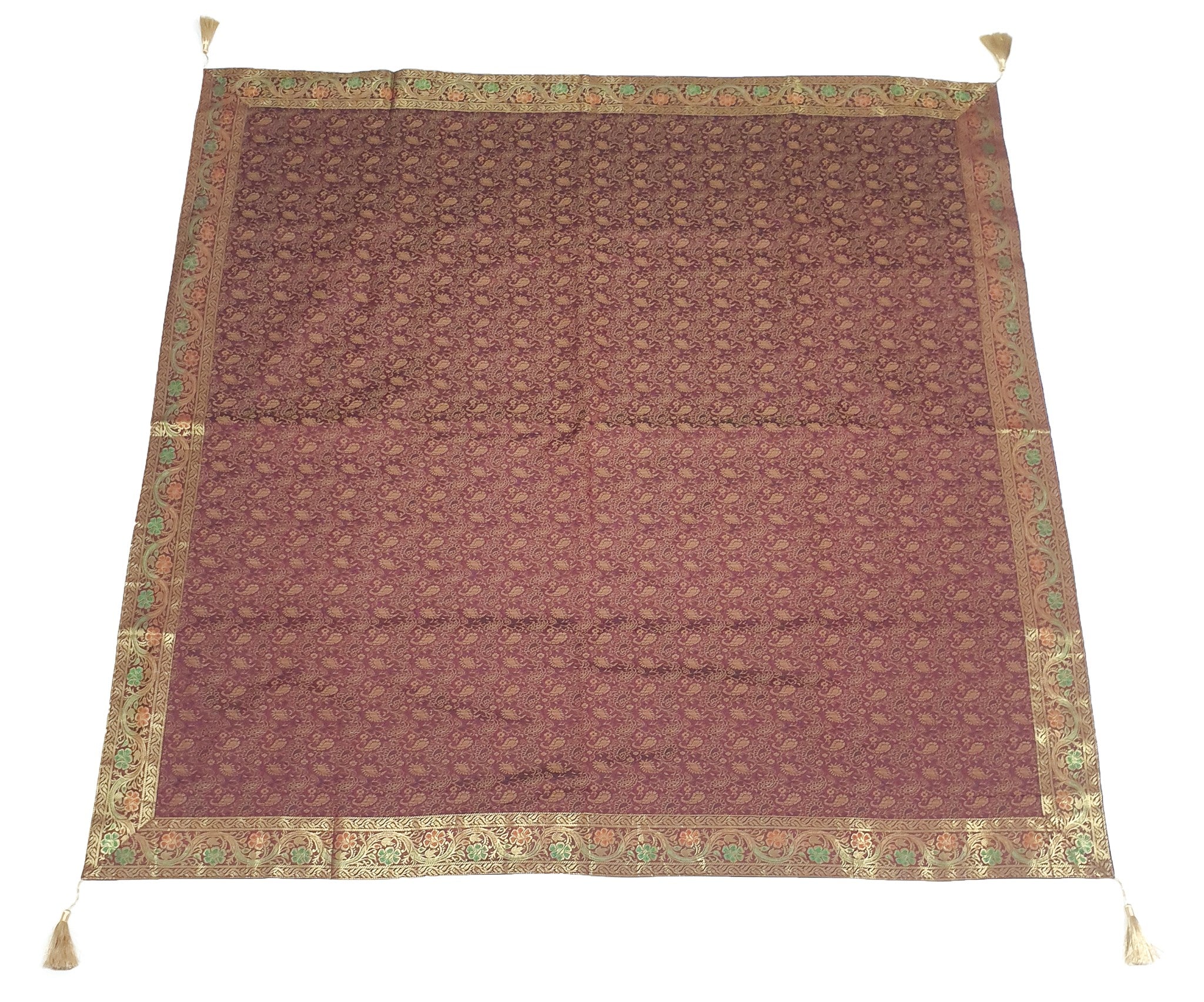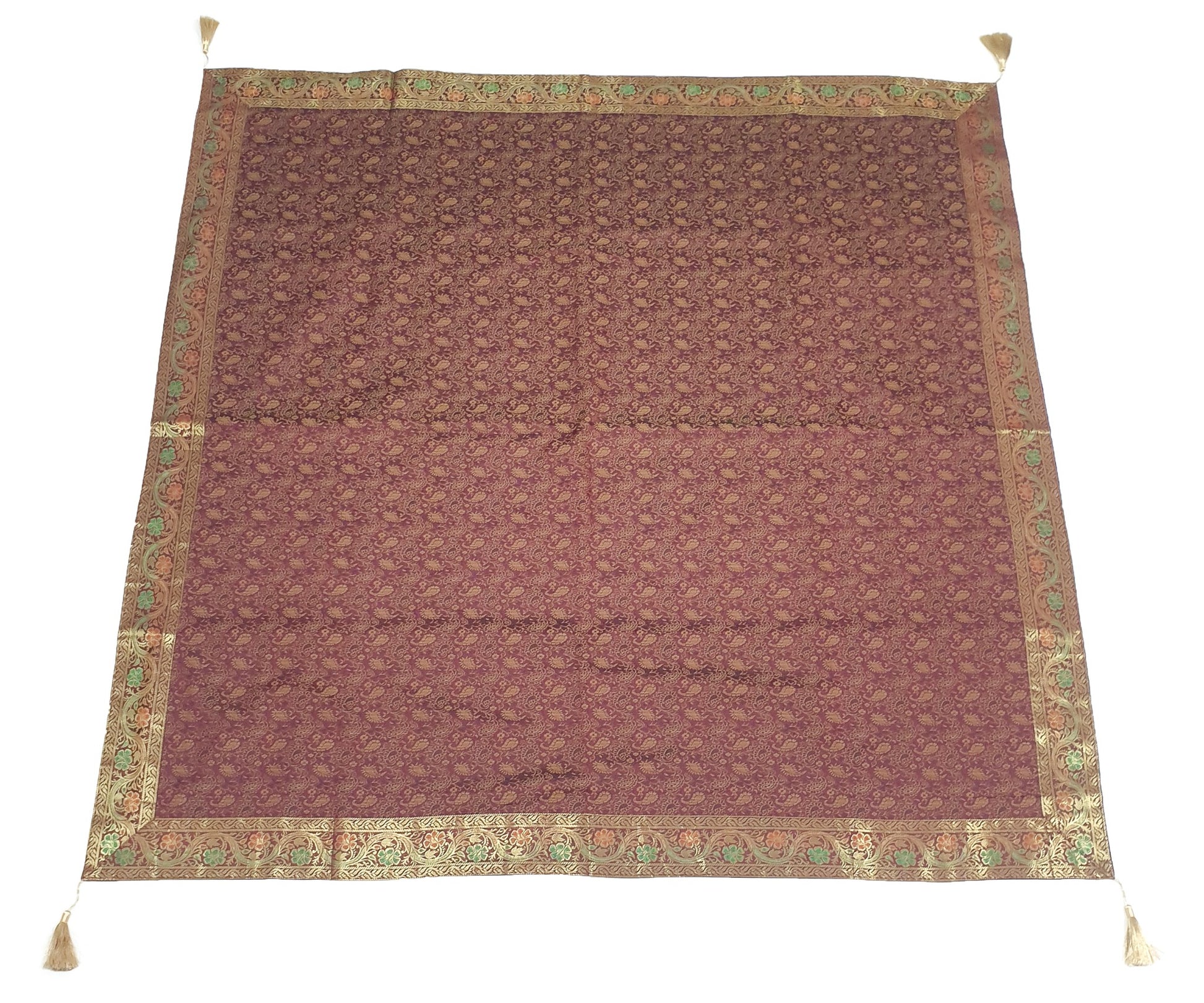 Banarasi Vastra Presents 48 Inch x 48 Inch Woven Golden Zari Brocade Banarasi Silk Table Cover with Woven Paisley Pattern Tanchoi Fabric in the center Part of the cover with all Side Floral Zari Woven Border with 4 side Golden Zari Tassel. this Cover comes with Matching color Back lining fabric.